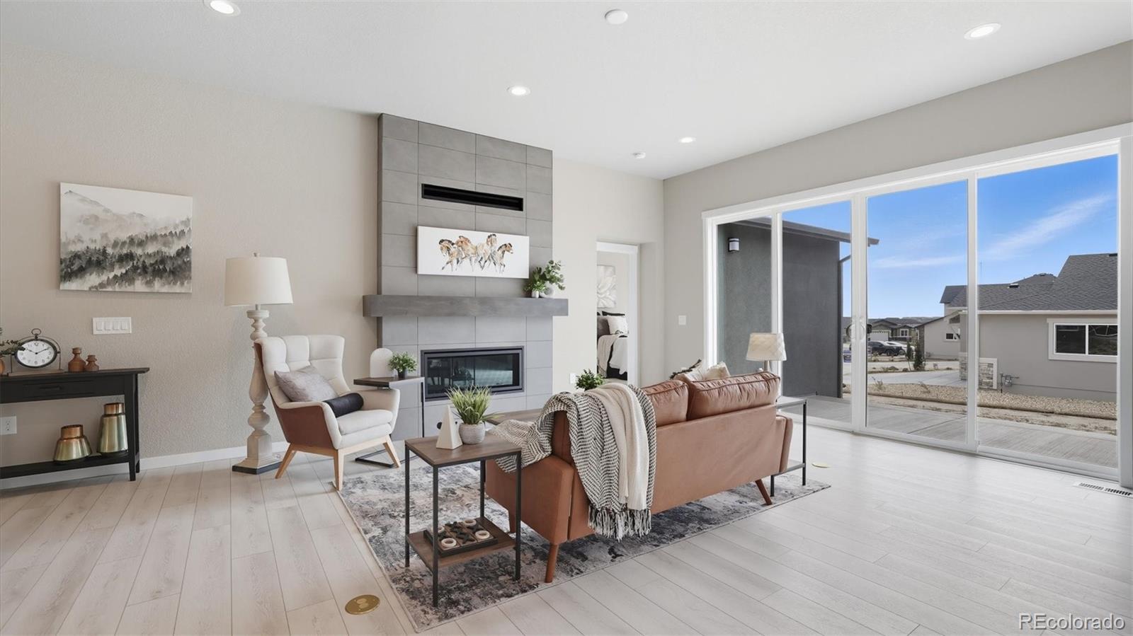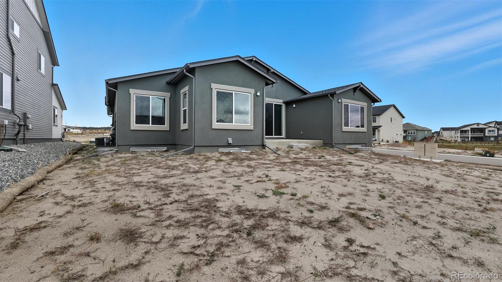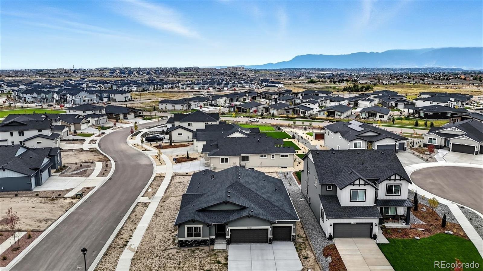 Exquisite stucco/stone ranch-style home on a 0.27-acre corner lot in the popular D20 community of Revel at Wolf Ranch. This brand-new 5BR, 4BA home blends luxury, functionality & modern elegance. The expansive basement offers potential for a 6th BR & rough-in for an additional BA. High ceilings & abundant natural light create an airy ambiance. Luxury vinyl plank flooring flows through the Entry, Living Room, Kitchen & Dining Area, complemented by wood-look blinds. The Great Room features a stone-tile gas fireplace & wall of windows with sliding door to the back patio, complete with gas stub for grilling. The chef’s Kitchen boasts a large island w/breakfast bar, waterfall-edge marble-look quartz countertops, stainless steel appliances (5-burner gas cooktop, built-in oven, microwave, dishwasher, SMART Samsung fridge), walk-in pantry & ample cabinetry. A sunny Dining Area ensures effortless entertaining. Additional features include a Mud Room, Powder Bath, Laundry Room w/Samsung washer/dryer, & 3-car garage. A main-level Office with French doors offers a perfect work-from-home space. The vaulted Primary Suite is a serene retreat with a luxurious 5-piece Bath, a dual sink vanity with quartz countertops, tiled walk-in shower w/seat, soaking tub & walk-in closet. Two more main-level BRs share a Shower Bath w/dual sink vanity, quartz countertop, and enclosed shower. The partially finished Basement with 9' ceilings includes a spacious Family Room, Game Area, 2 BRs (one w/en-suite Bath and 1 with a walk-in closet), & large Utility Room w/tankless water heater, furnace, & storage. Central A/C & heat, security system & radon mitigation add peace of mind. The backyard is a blank canvas ready for your vision, whether it's entertaining, creating a garden retreat, or installing a play space or fire pit.. Wolf Ranch offers parks, trails, Rec Center (fee), pool/splash park, stocked lake, playgrounds & summer concerts. Easy access to Powers, Hwy 83, I-25, shopping, hospitals & more!