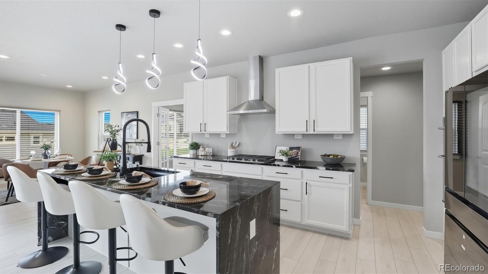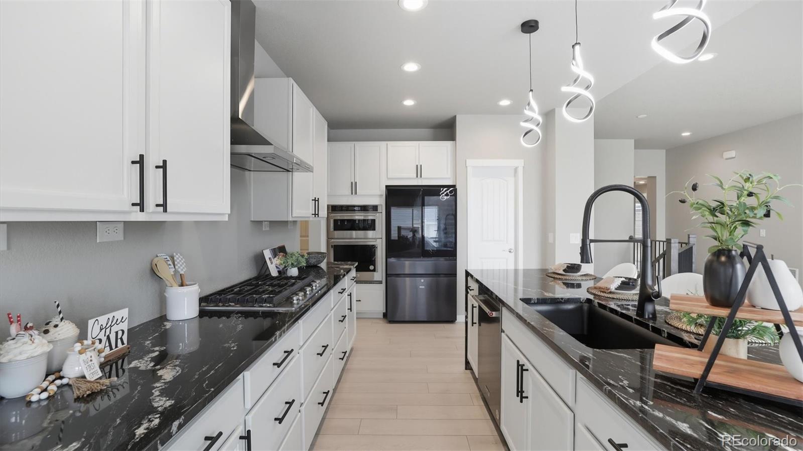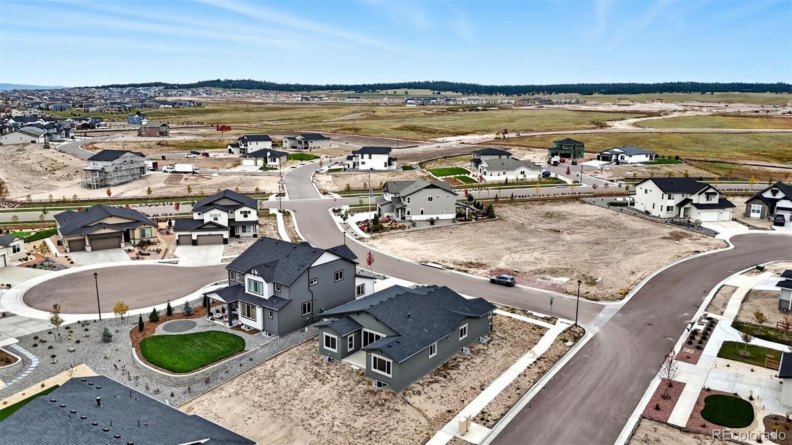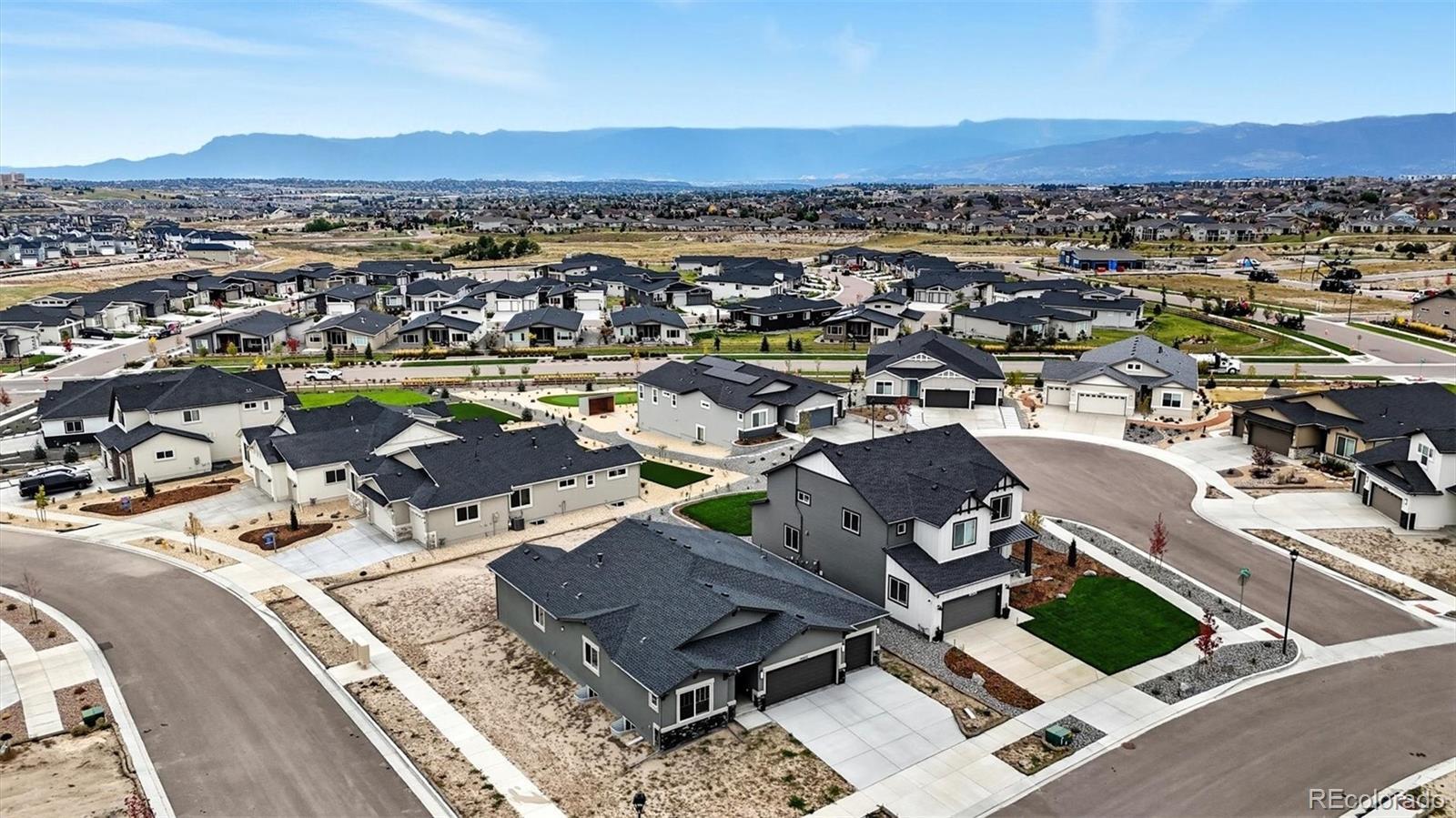 Exquisite stucco/stone ranch-style home on a 0.27-acre corner lot in the popular D20 community of Revel at Wolf Ranch. This brand-new 5BR, 4BA home blends luxury, functionality & modern elegance. The expansive basement offers potential for a 6th BR & rough-in for an additional BA. High ceilings & abundant natural light create an airy ambiance. Luxury vinyl plank flooring flows through the Entry, Living Room, Kitchen & Dining Area, complemented by wood-look blinds. The Great Room features a stone-tile gas fireplace & wall of windows with sliding door to the back patio, complete with gas stub for grilling. The chef’s Kitchen boasts a large island w/breakfast bar, waterfall-edge marble-look quartz countertops, stainless steel appliances (5-burner gas cooktop, built-in oven, microwave, dishwasher, SMART Samsung fridge), walk-in pantry & ample cabinetry. A sunny Dining Area ensures effortless entertaining. Additional features include a Mud Room, Powder Bath, Laundry Room w/Samsung washer/dryer, & 3-car garage. A main-level Office with French doors offers a perfect work-from-home space. The vaulted Primary Suite is a serene retreat with a luxurious 5-piece Bath, a dual sink vanity with quartz countertops, tiled walk-in shower w/seat, soaking tub & walk-in closet. Two more main-level BRs share a Shower Bath w/dual sink vanity, quartz countertop, and enclosed shower. The partially finished Basement with 9' ceilings includes a spacious Family Room, Game Area, 2 BRs (one w/en-suite Bath and 1 with a walk-in closet), & large Utility Room w/tankless water heater, furnace, & storage. Central A/C & heat, security system & radon mitigation add peace of mind. The backyard is a blank canvas ready for your vision, whether it's entertaining, creating a garden retreat, or installing a play space or fire pit.. Wolf Ranch offers parks, trails, Rec Center (fee), pool/splash park, stocked lake, playgrounds & summer concerts. Easy access to Powers, Hwy 83, I-25, shopping, hospitals & more!