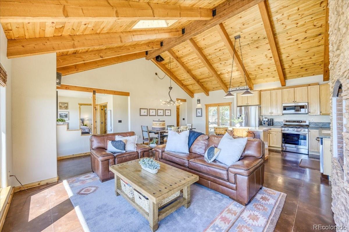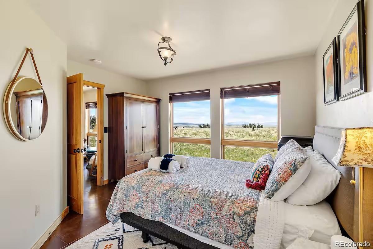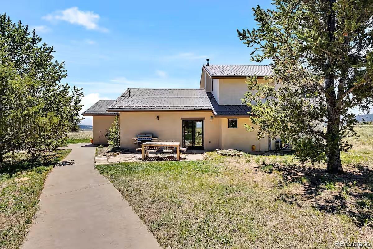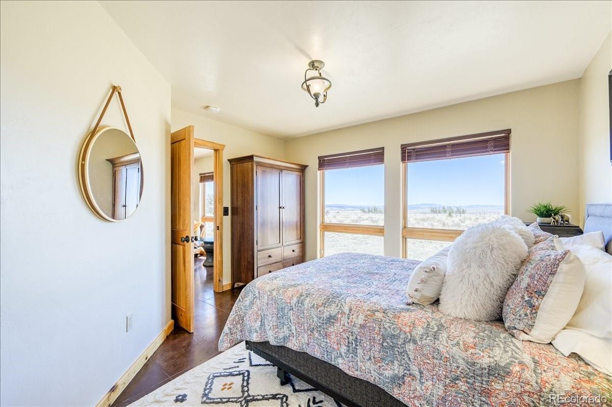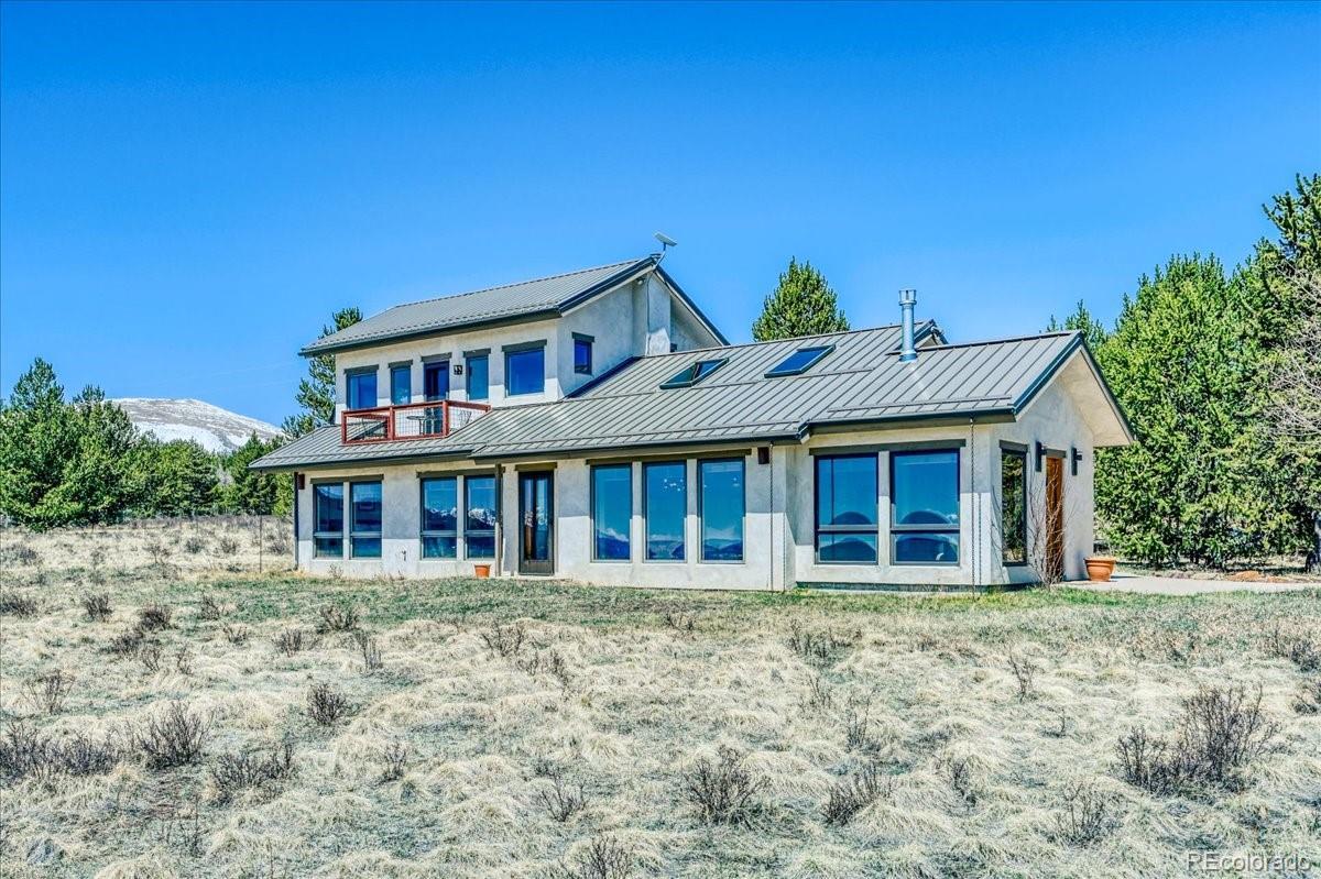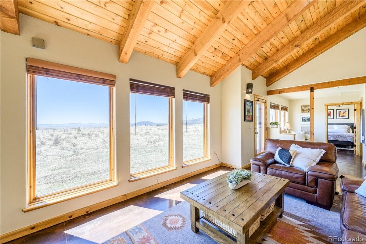 Experience the perfect blend of rustic charm and modern elegance in this beautifully updated mountain home nestled on 5.5 acres of serene Colorado landscape. Surrounded by prairie, aspens, and evergreens—and backing directly to State Land—this peaceful retreat offers unobstructed views of multiple majestic 14-ers and unmatched privacy. Step inside to a warm welcome entry and a cozy two-sided gas fireplace that connects the open-concept living and dining area. Vaulted oak ceilings and polished concrete floors add a sophisticated, cabin-chic ambiance. Quality finishes throughout create a seamless blend of comfort and style. The home features two spacious master suites, ideal for hosting guests or multi-generational living. The upstairs master is a true sanctuary, boasting a large office/writing studio, walk-in closet, and heated balcony—perfect for enjoying year-round panoramic views or stargazing from your king-size bed. The downstairs master offers large southeast-facing windows with a front-row seat to local wildlife—antelope, moose, and more. Additional highlights include a third bedroom with built-in bunks, an oversized heated 2-car garage with extra storage, and paved road access for year-round convenience. Whether you're fly fishing in the fall, snowshoeing in winter, or simply watching the aspens turn, this is a home where every season brings its own magic. Come see why the Milky Way shines brightest from here.