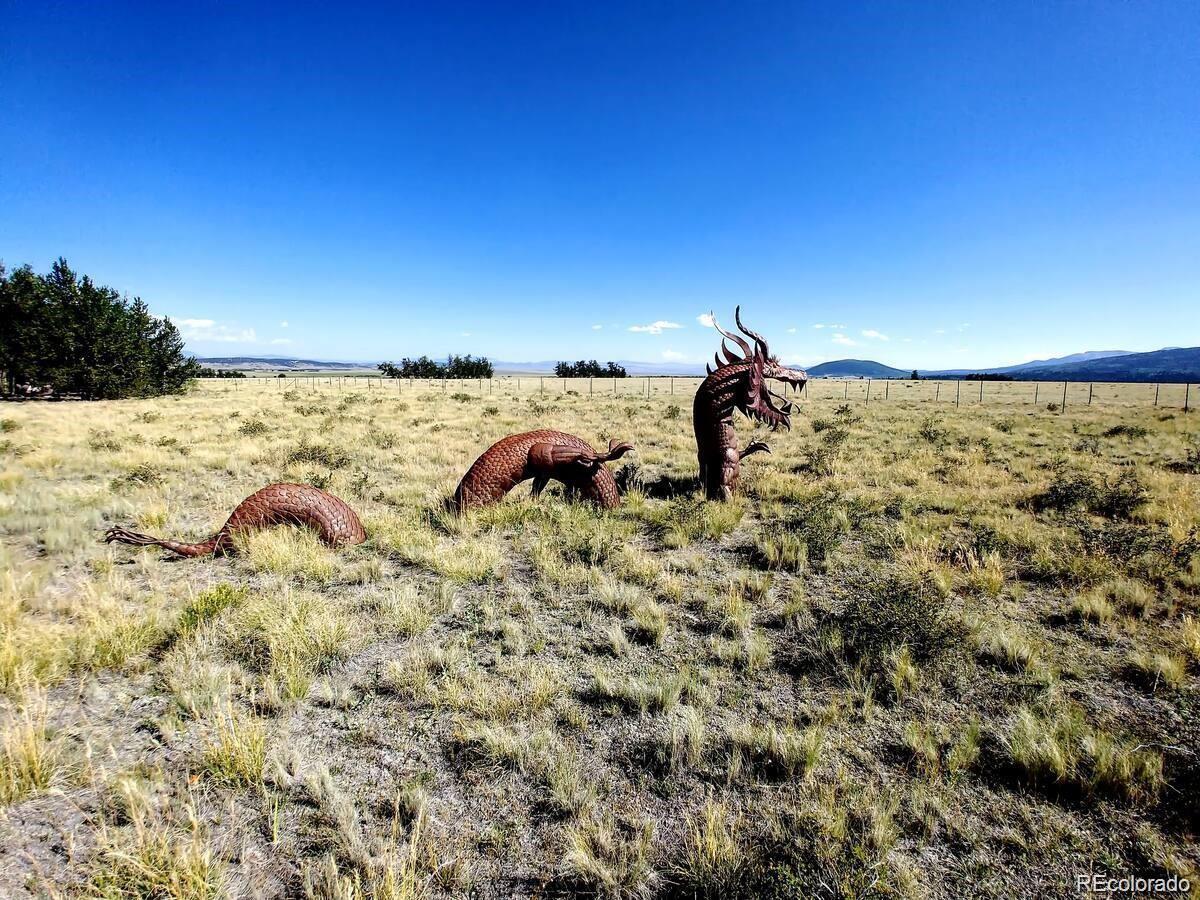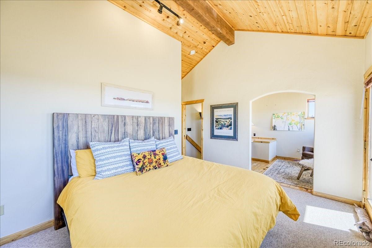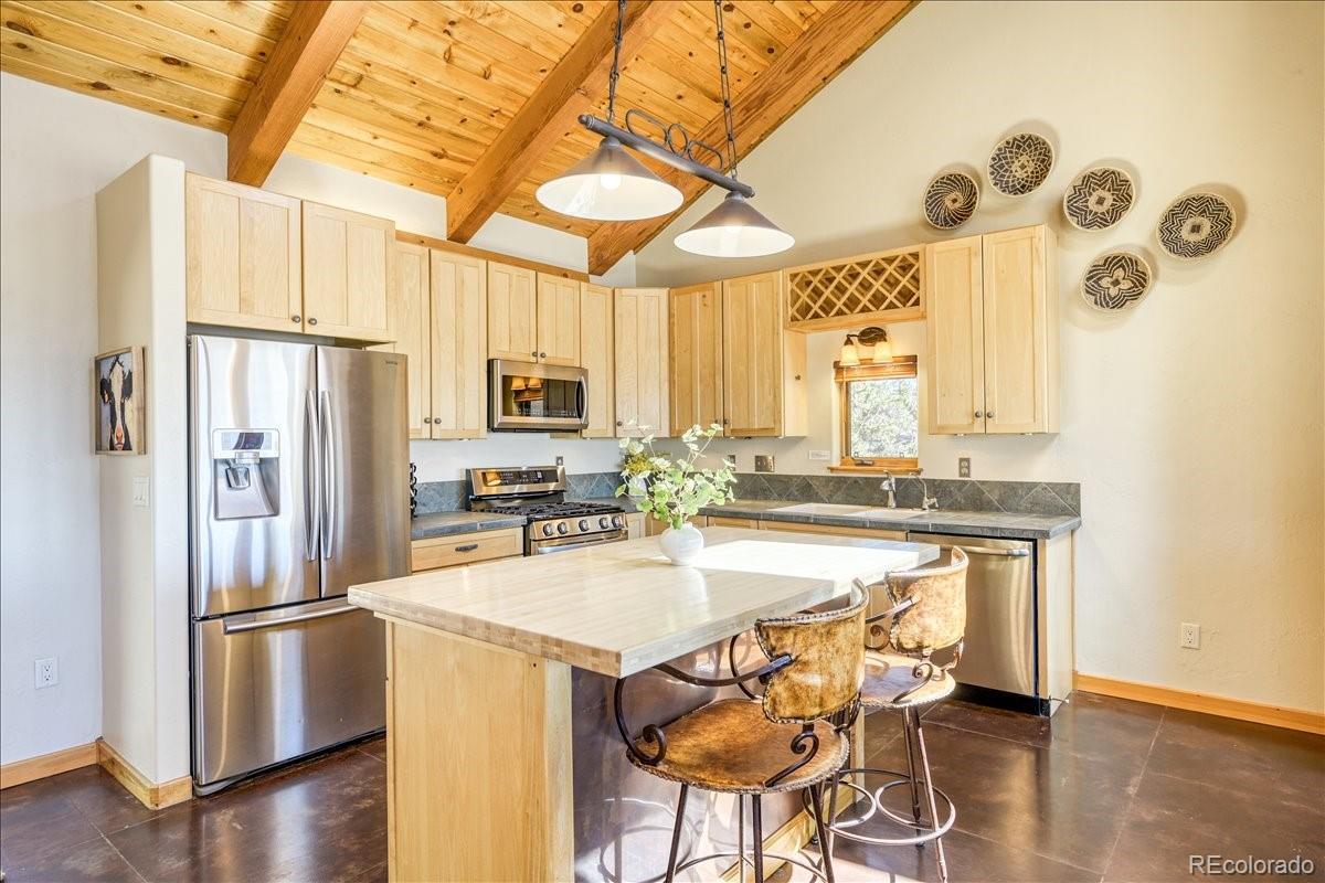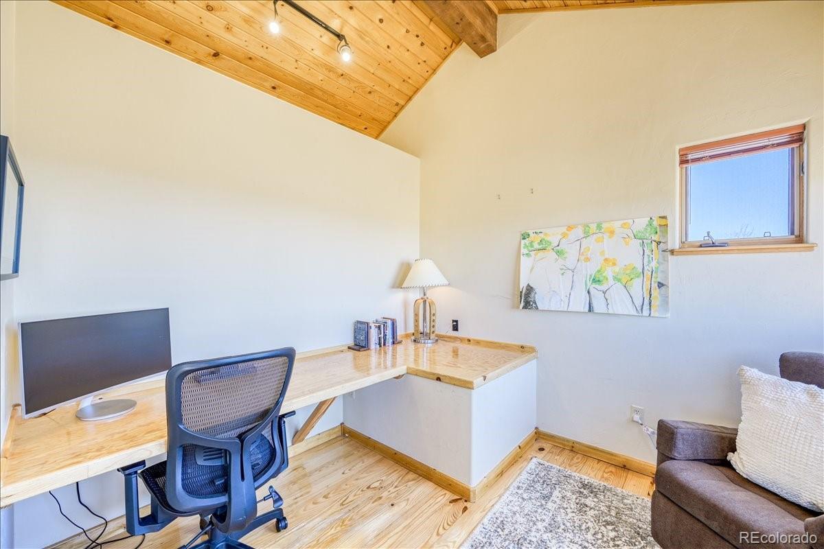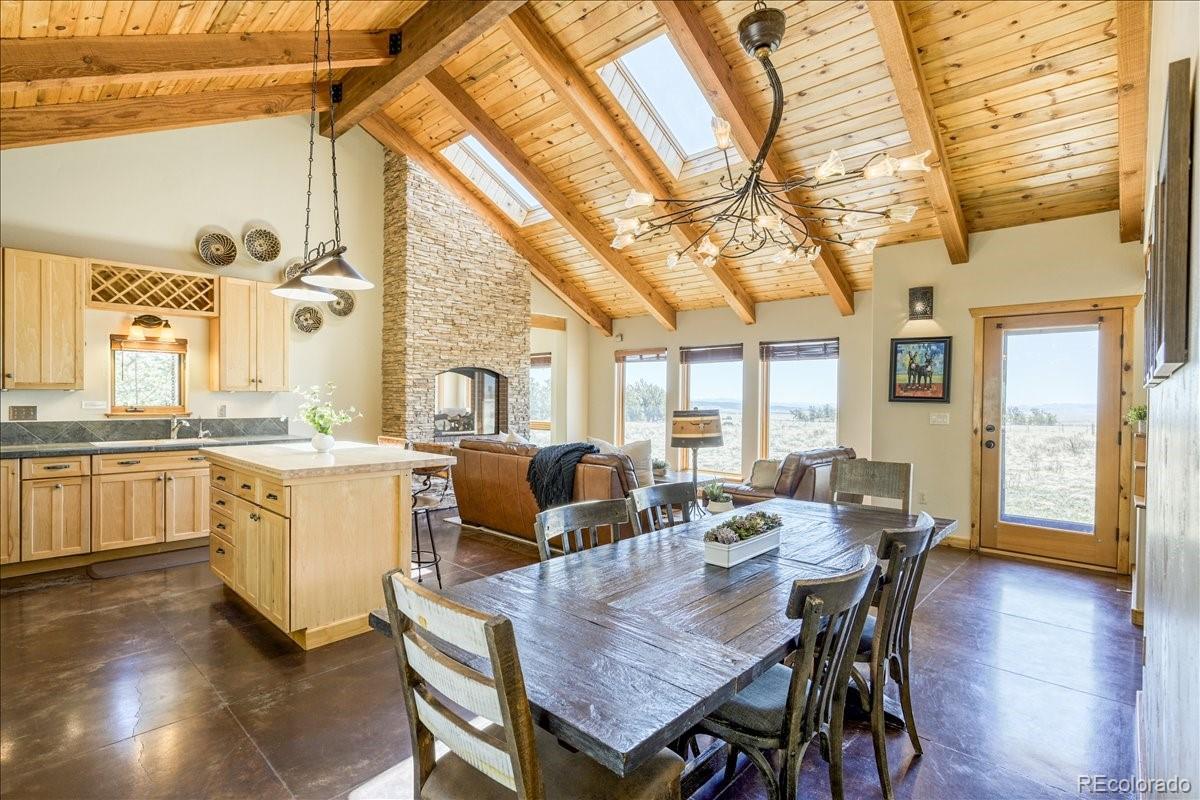 Experience the perfect blend of rustic charm and modern elegance in this beautifully updated mountain home nestled on 5.5 acres of serene Colorado landscape. Surrounded by prairie, aspens, and evergreens—and backing directly to State Land—this peaceful retreat offers unobstructed views of multiple majestic 14-ers and unmatched privacy. Step inside to a warm welcome entry and a cozy two-sided gas fireplace that connects the open-concept living and dining area. Vaulted oak ceilings and polished concrete floors add a sophisticated, cabin-chic ambiance. Quality finishes throughout create a seamless blend of comfort and style. The home features two spacious master suites, ideal for hosting guests or multi-generational living. The upstairs master is a true sanctuary, boasting a large office/writing studio, walk-in closet, and heated balcony—perfect for enjoying year-round panoramic views or stargazing from your king-size bed. The downstairs master offers large southeast-facing windows with a front-row seat to local wildlife—antelope, moose, and more. Additional highlights include a third bedroom with built-in bunks, an oversized heated 2-car garage with extra storage, and paved road access for year-round convenience. Whether you're fly fishing in the fall, snowshoeing in winter, or simply watching the aspens turn, this is a home where every season brings its own magic. Come see why the Milky Way shines brightest from here.