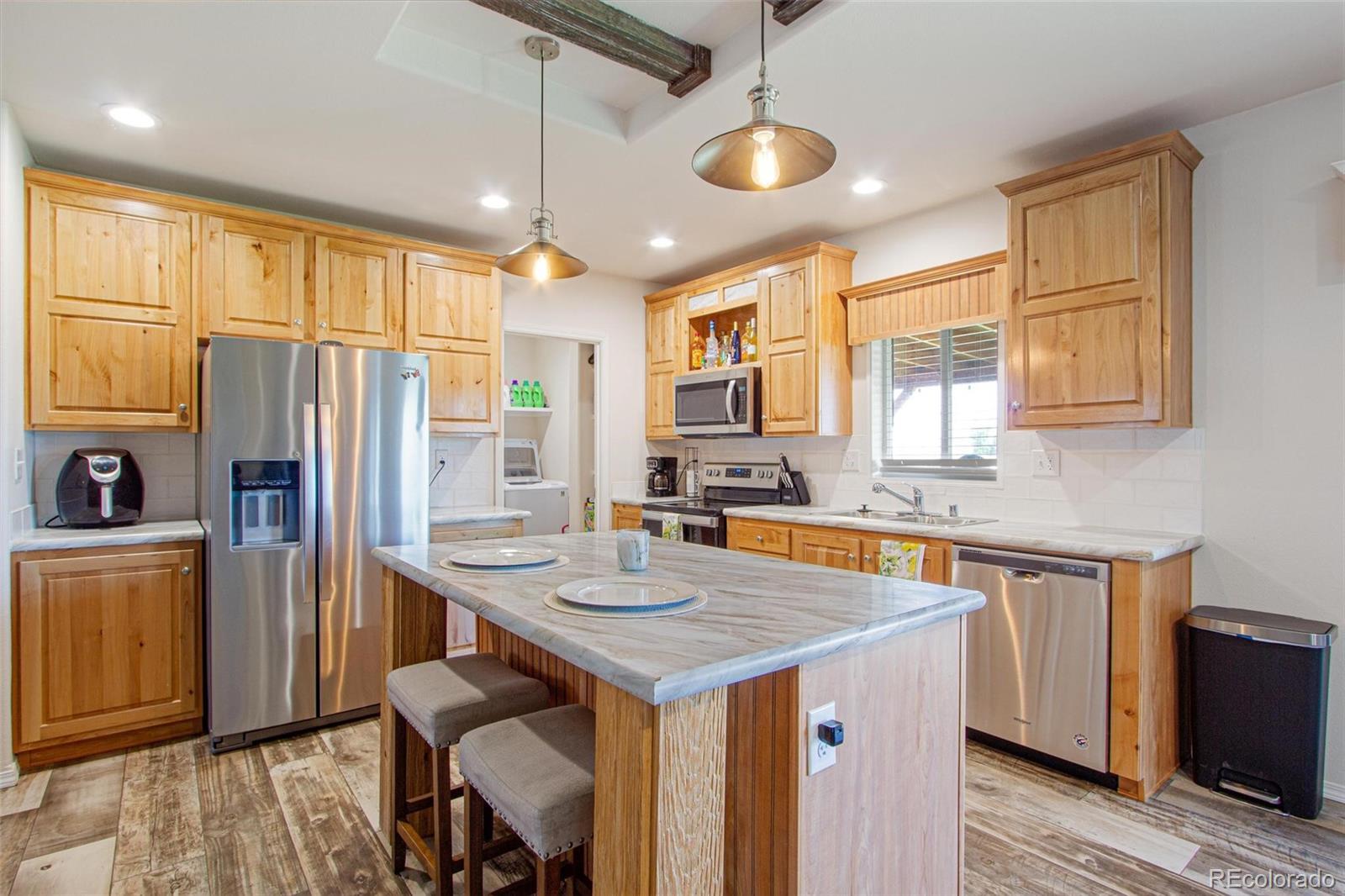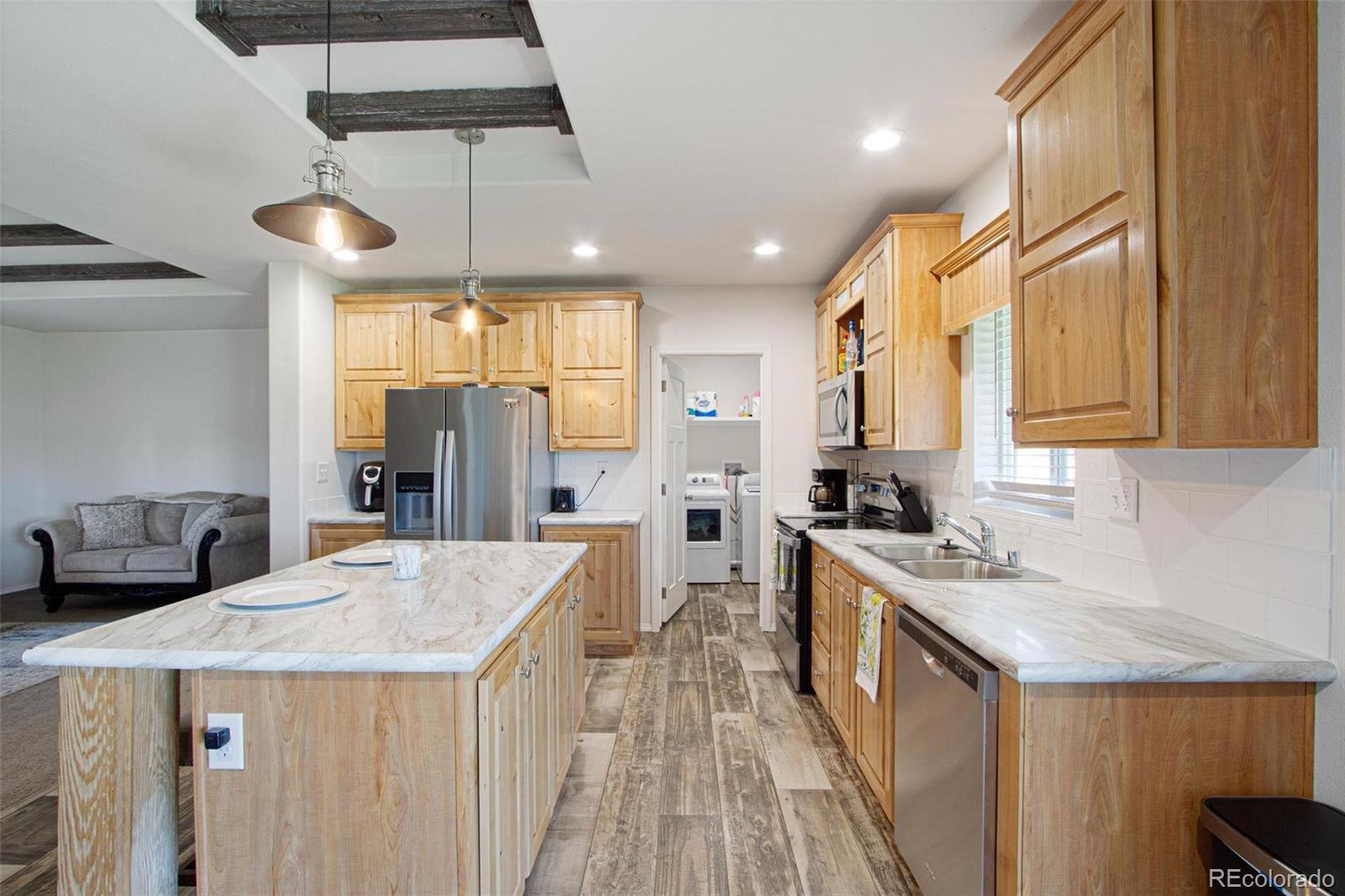 Welcome to your peaceful country escape! This beautifully maintained, move-in ready home offers the perfect blend of rural charm and modern convenience. Nestled on a spacious lot with breathtaking sunset views and ample RV parking, it’s ideal for guests or extended travel setups. Step inside to an open floor plan that flows seamlessly perfect for both quiet evenings and entertaining. The light-filled living area opens to a well-appointed kitchen and dining space, featuring a large kitchen island with a breakfast bar, real wood cabinets, and stunning exposed wood beams that elevate the home's character. The spacious primary suite includes a walk-in closet with a built-in safe for added security, as well as a luxurious en-suite bath complete with a freestanding soaking tub, beautifully tiled walk-in shower, and double vanity sink. Outside, enjoy sweeping views of open skies and rolling land, with plenty of room for livestock, gardening, hobby farming, or simply relaxing in your perfectly maintained backyard oasis. Additional highlights include a newly built, fully finished two-car garage with epoxy floors, an extra shed with a builtin workspace, and space for outdoor living and future expansion. All of this in a peaceful, private setting with easy access to town conveniences. Don’t miss this opportunity to own a slice of country paradise—schedule your showing today and fall in love with the sunsets, space, and serenity.