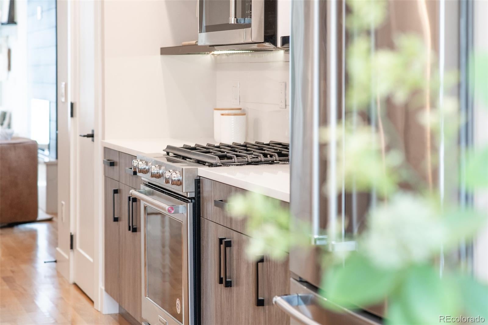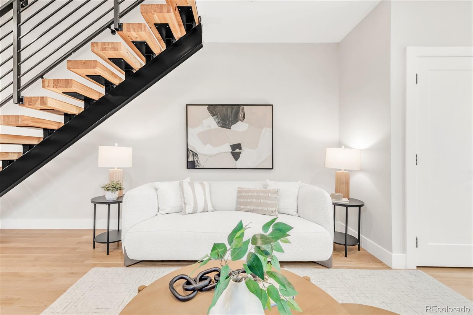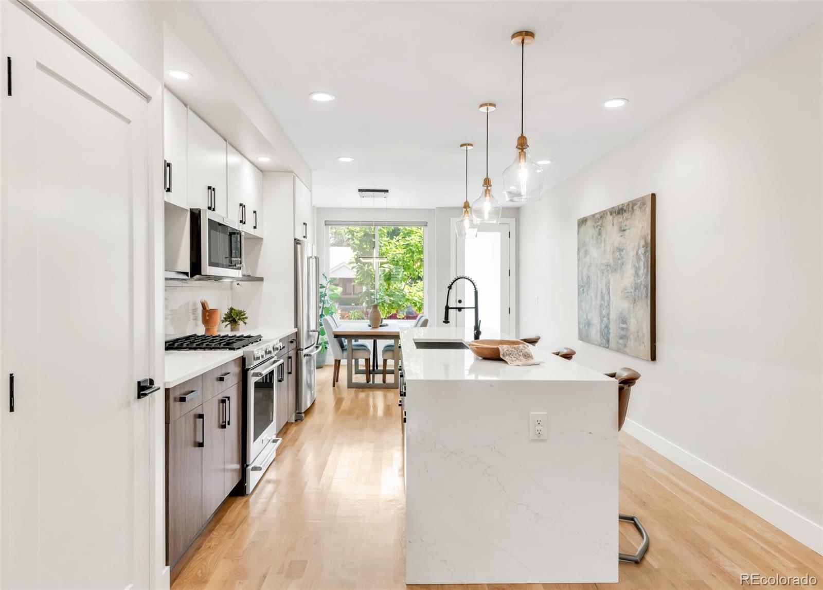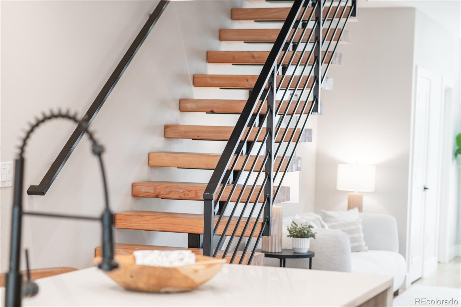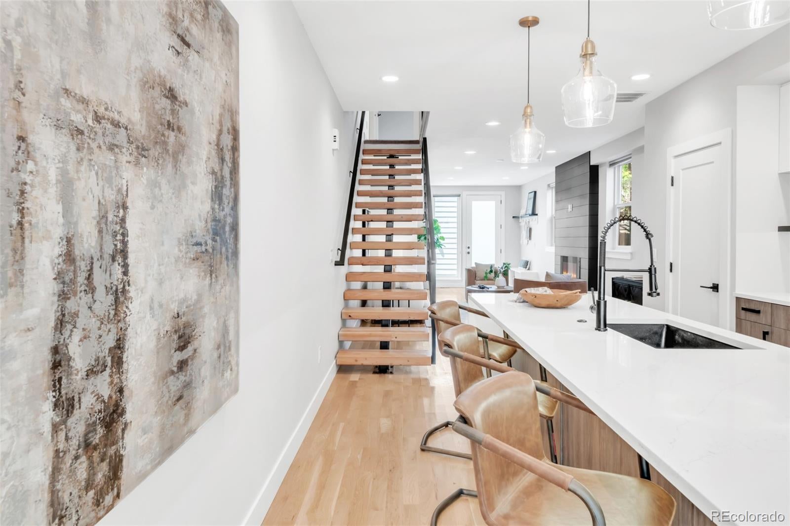 Sleek style meets modern living in Mayfair stunner. Just four years old and free from HOA restrictions, this striking triplex feels expansive with high-end finishes and incredible outdoor spaces. Step inside to oak hardwood floors and a cozy gas fireplace with a quartz hearth. The chef’s kitchen is designed to impress with a waterfall island, custom black iron open shelving, deluxe KitchenAid appliances, soft-close cabinetry, and a pantry for extra storage. Upstairs, dual primary suites feature spa-worthy baths with Euro glass showers, designer tile, and quartz vanities. A dramatic mono-rail staircase with wood treads and welded iron railings leads to the third floor—an airy loft that flexes as an office, bedroom, or creative retreat. This light-filled space is complemented by a ¾ bath, closet, and two rooftop decks: one for sunrise coffees, the other covered and west-facing for sunsets. With low-maintenance living and smart-enabled features, this home is ideal as a lock-and-leave for frequent travelers or the perfect city retreat for mountain homeowners. ** Up to $18,000 in buyer assistance available—$10K seller concession, $8,000 in lender incentives **
