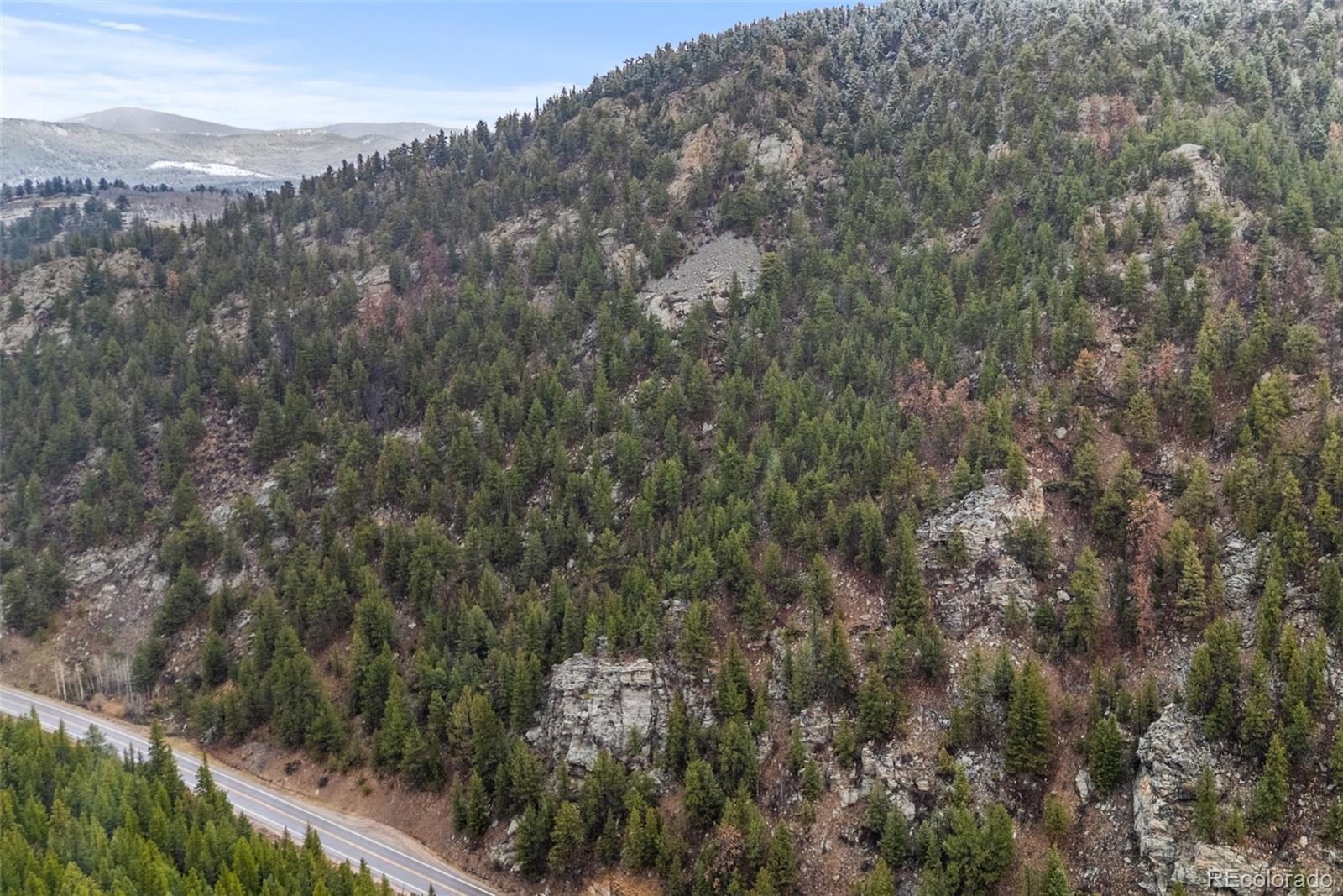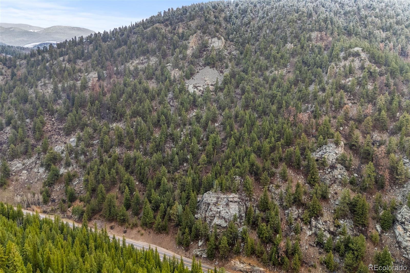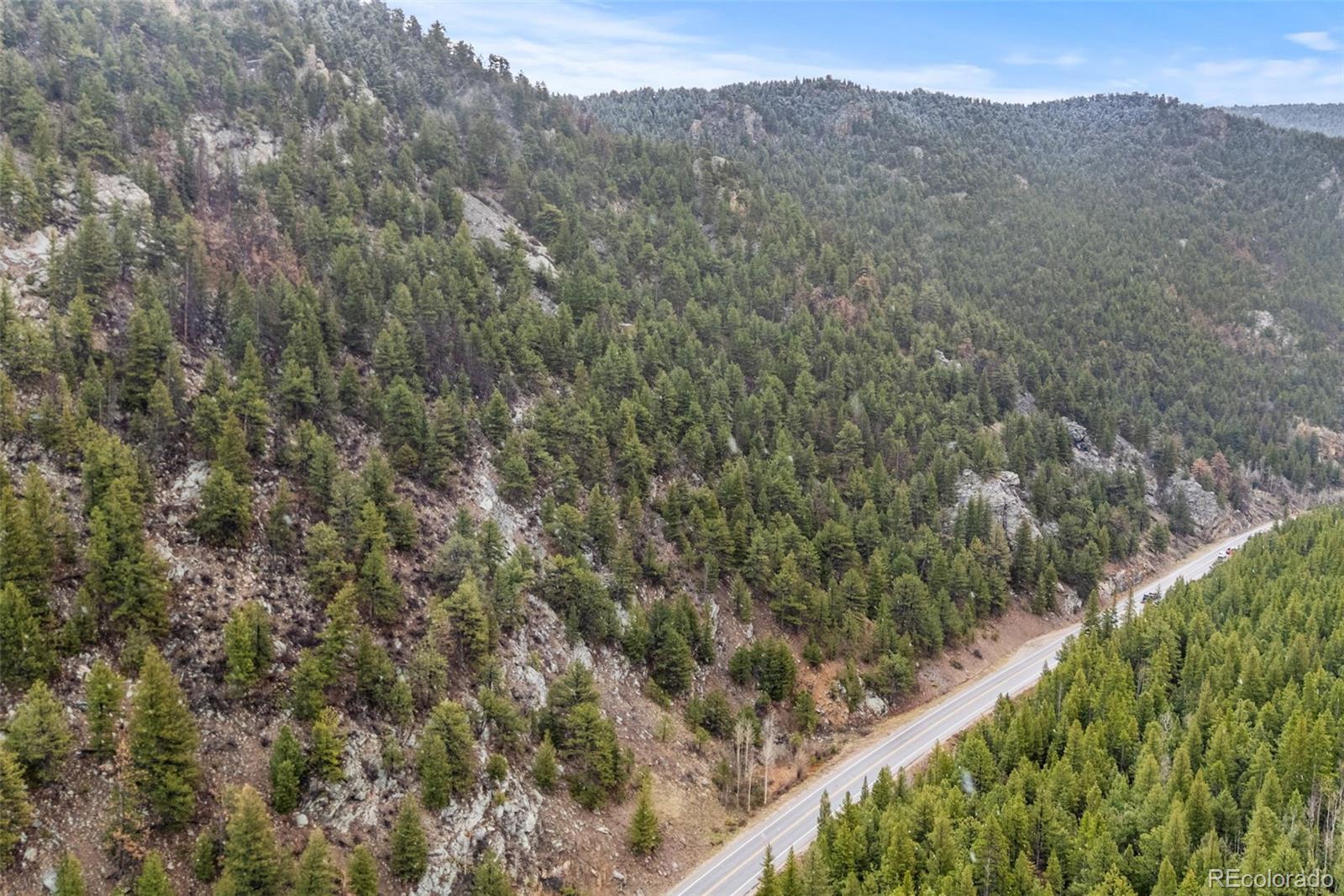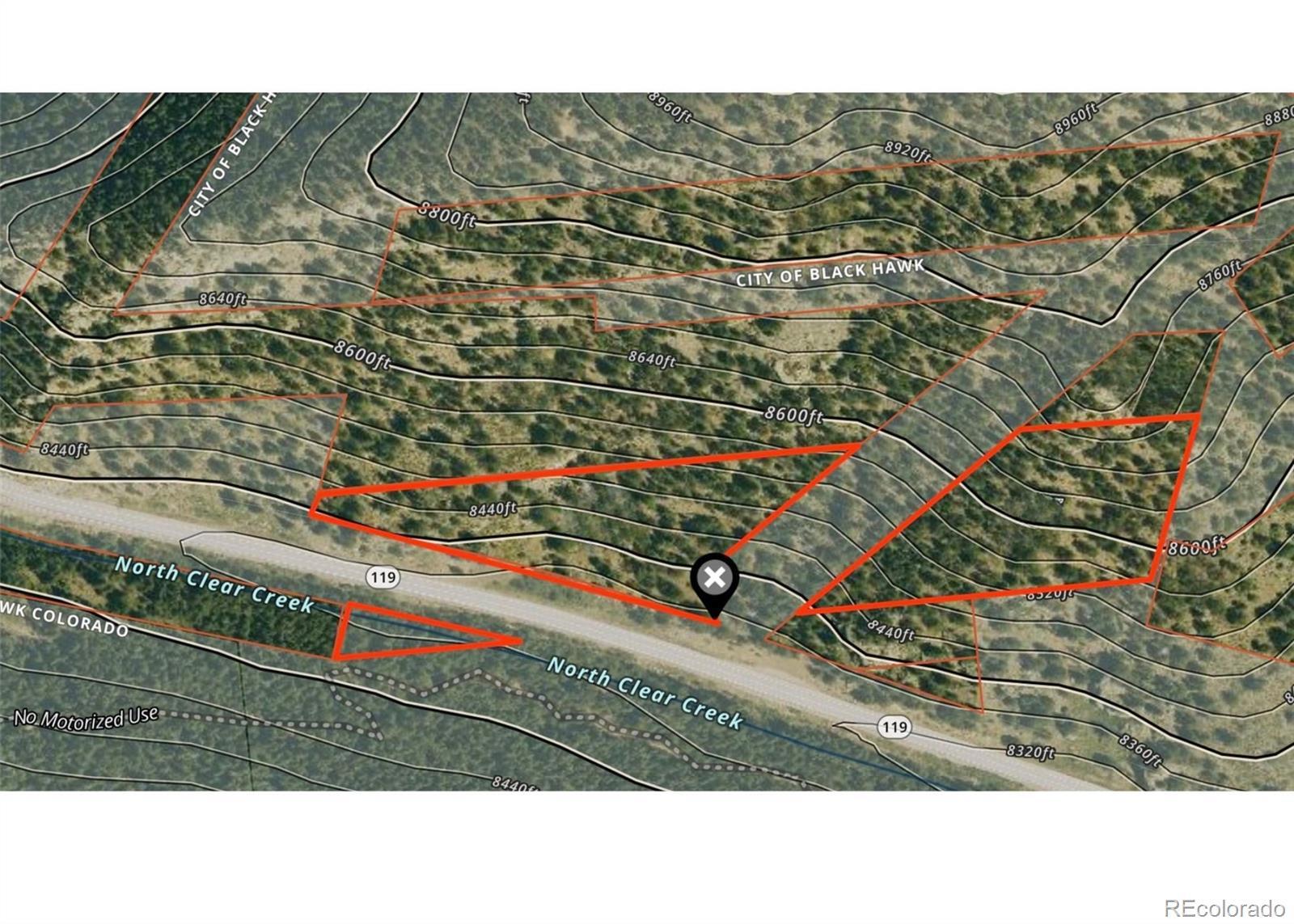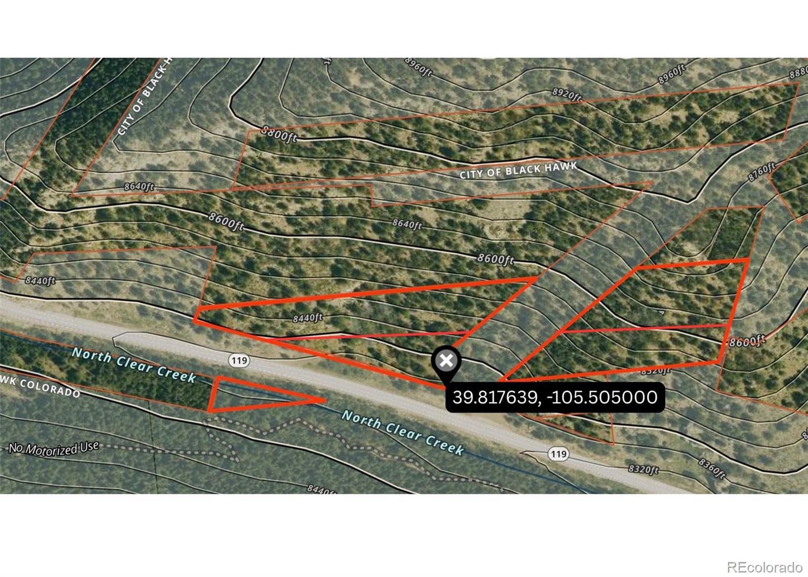 5.96 acres of mountain land located just 1 mile north of the City of Black Hawk. Two adjacent parcels intersect Colorado Highway 119 between mile markers 8.5 and 9, offering approximately 700 feet of road frontage on the north side and 275 feet on the south, a rare setup in Gilpin County. The front 2.9-acre section includes both 700 feet of frontage along the north side and 275 feet along the south, including 0.32 acres that borders local bike trails. This section has confirmed eligibility for driveway access through CDOT and now benefits from the recent completion of a public sewer line along Hwy 119, giving future owners the potential to tap into public sewer instead of installing a septic system, subject to county approval. The rear 2.875-acre floating section, positioned just beyond a narrow city-owned strip, does not currently have direct access. It offers excellent recreational value and could serve as a long-term land investment or natural extension of the front parcel. Wooded with steep-slope terrain, the land provides privacy, views, and rugged character, perfect for a private escape, off-grid possibilities, or a hold-and-develop approach. Parcels N007306 and N007307.