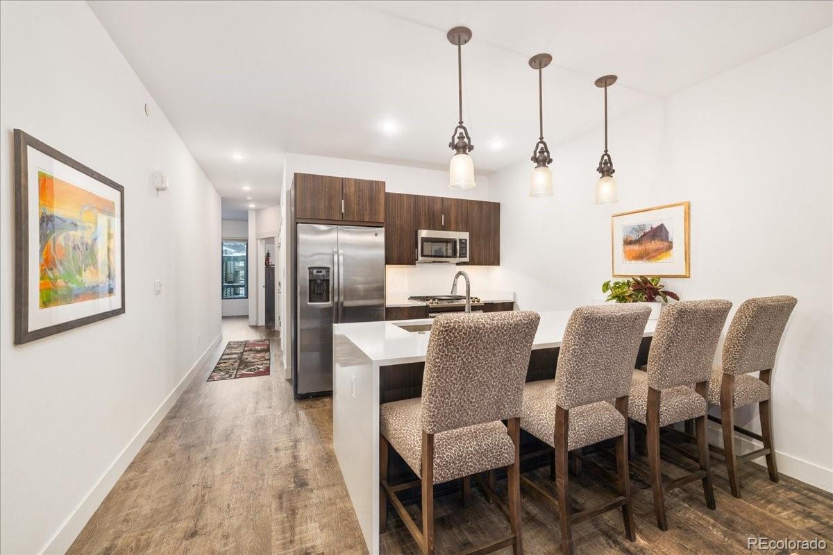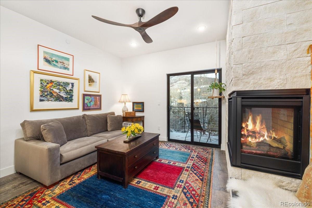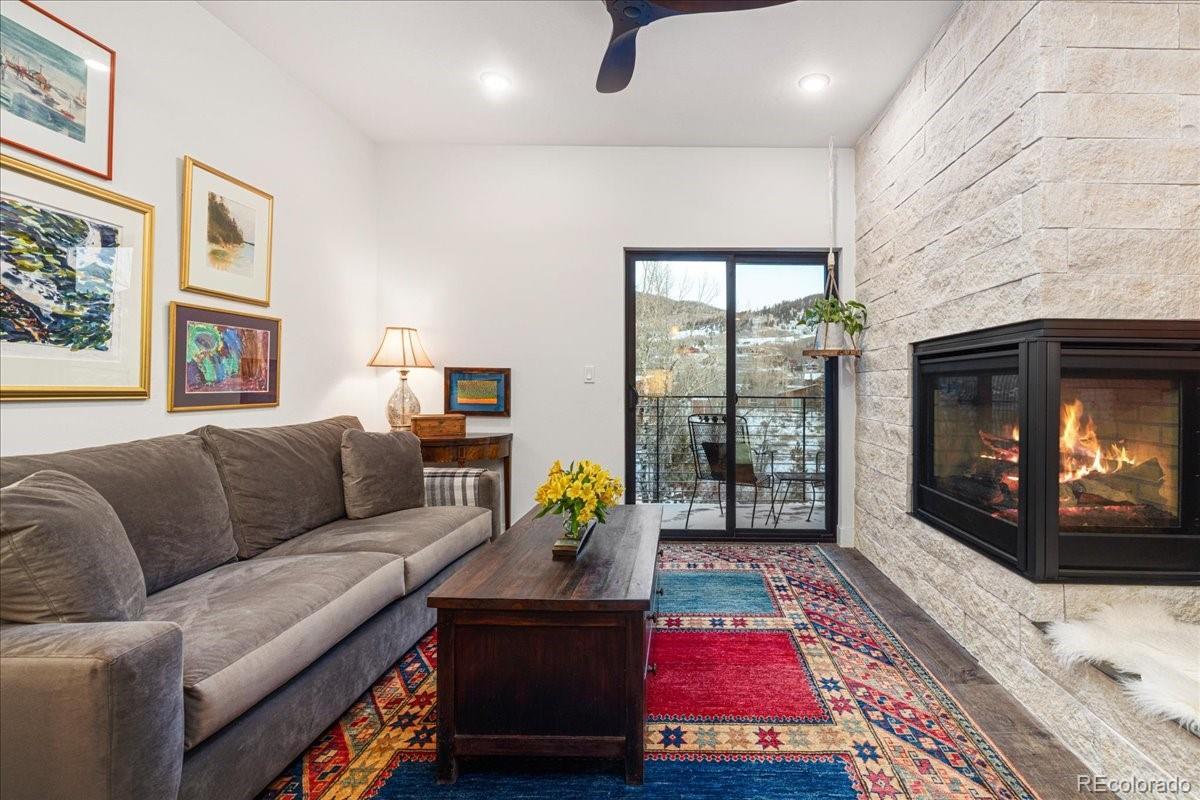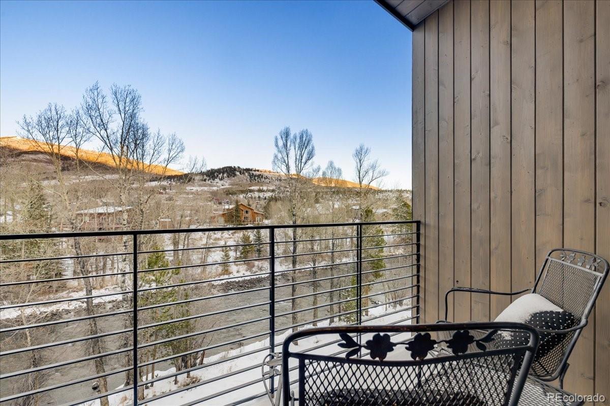Enjoy modern mountain living in this immaculate, top-floor 1-bedroom, 1-bath condo perfectly situated on the riverfront in Silverthorne. This one-owner, new-build, offers a new feel with a clean, contemporary design. From the front of the property, take in stunning views of the Gore Range, while the back of the unit overlooks the river below. Open the sliding glass door off the living room and enjoy morning sun and the calming sound of the river flowing just beneath the condo—an experience that truly sets this home apart. The top-floor location enhances both privacy and the gorgeous river views, making this a rare true riverfront offering. The open-concept living area features dark, modern cabinetry beautifully contrasted with light stone countertops. A beautiful, gas fireplace anchors the living room, adding warmth and ambiance and making this condo especially appealing for short-term rentals. In-floor radiant heat provides comfortable, efficient warmth throughout the year. HOA dues of $482 per month include water, sewer, gas (stove/oven, hot water, and radiant heat), trash and recycling, snow removal, and access to a community hot tub—an exceptional value in Summit County. Ideally located just a short walk from the Silverthorne Performing Arts Center, a vibrant cultural hub in Summit County, and close to world-class skiing, trails, dining, and shopping, this condo is perfect as a primary residence, mountain getaway, or investment opportunity.