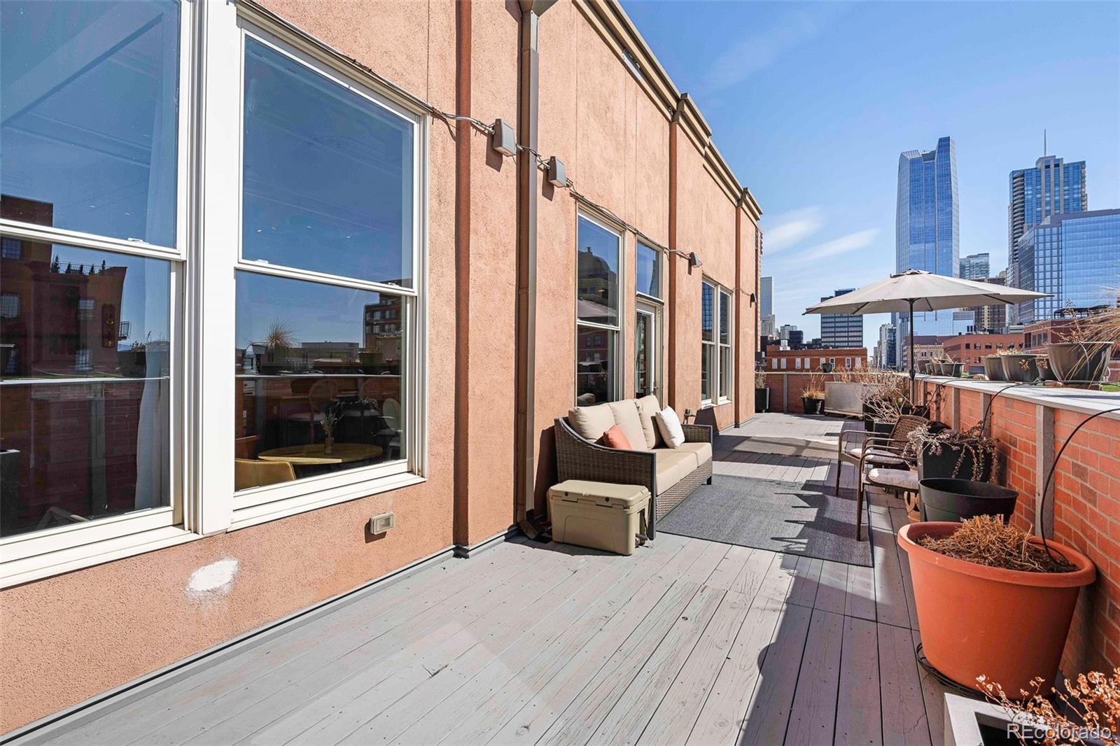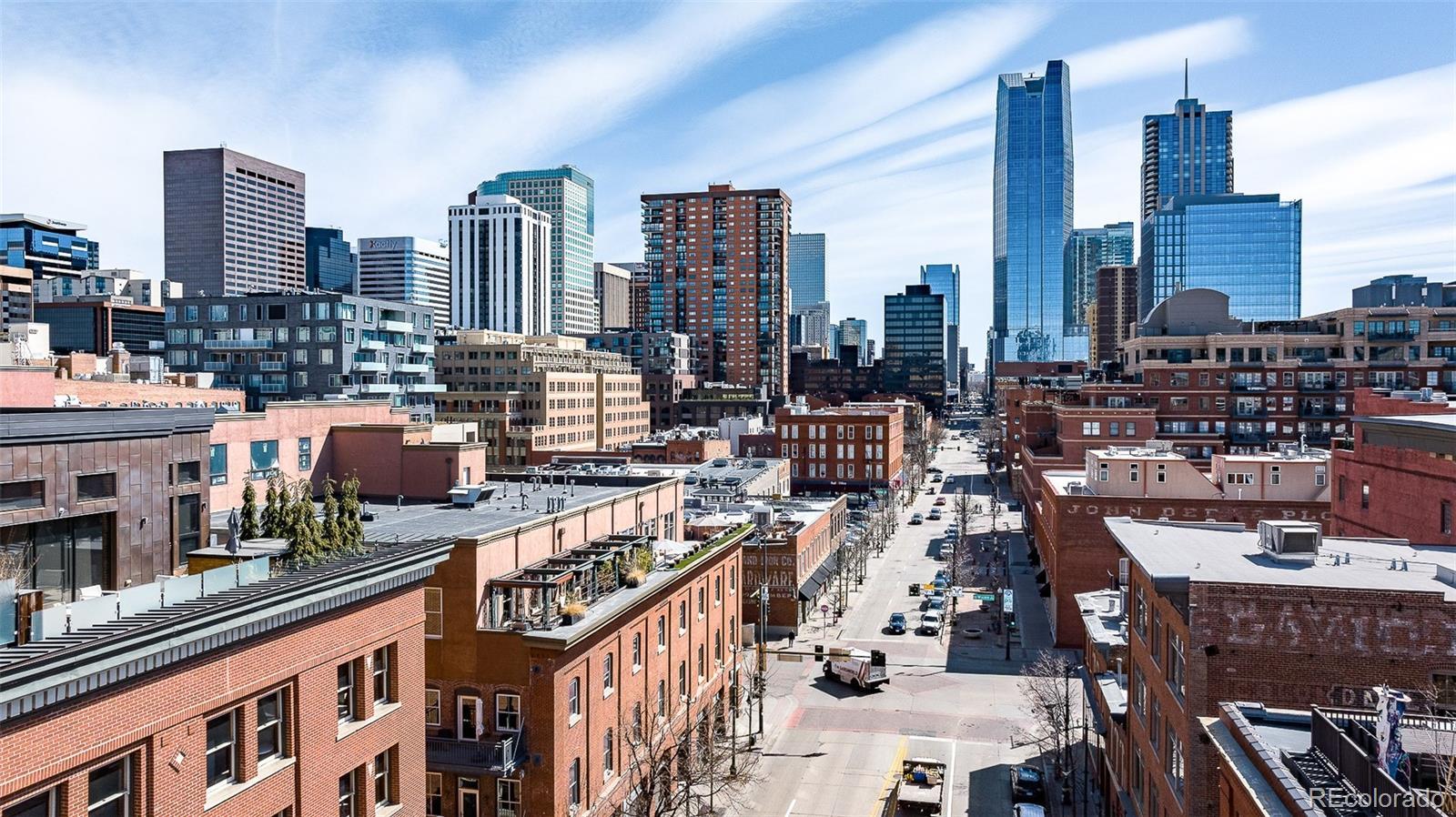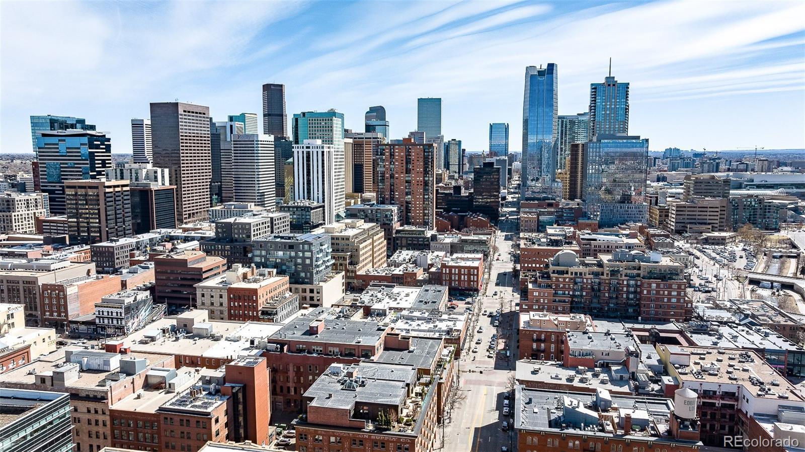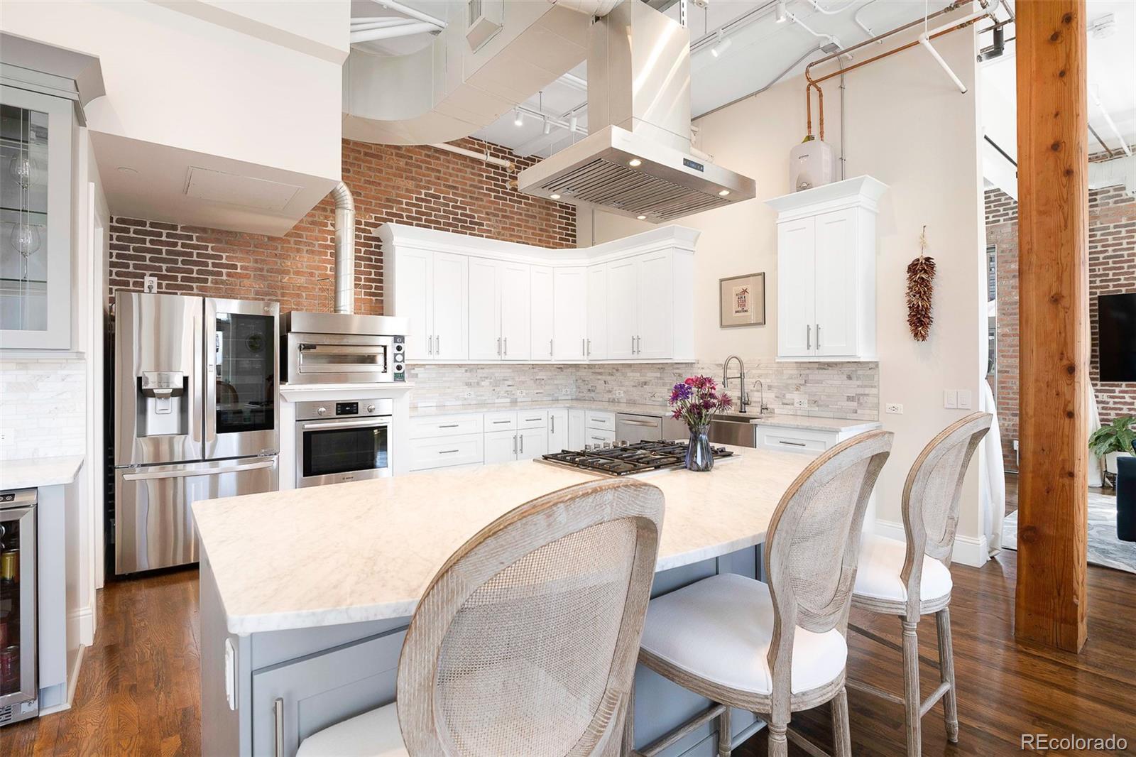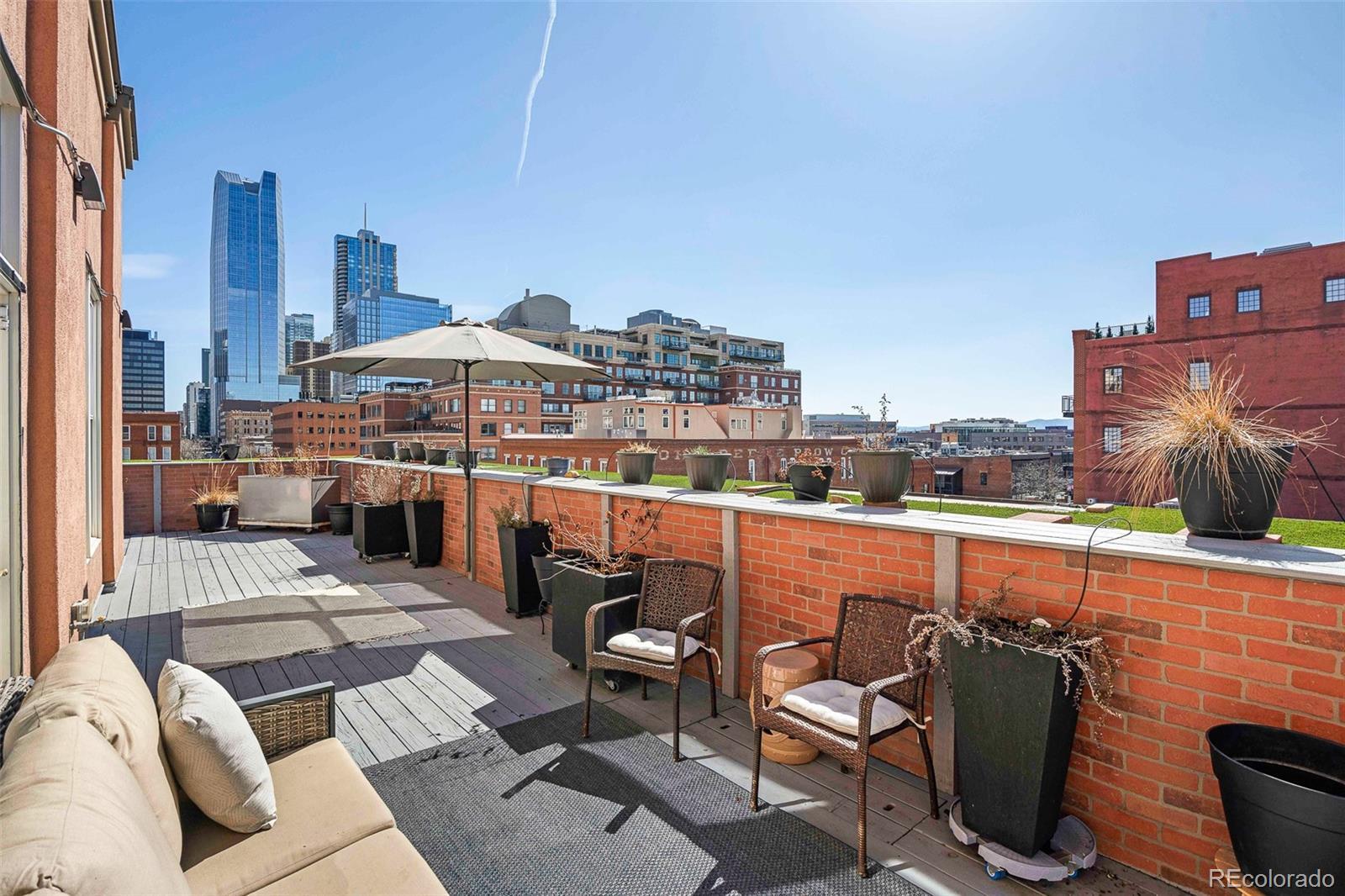 Home is recently remodeled for city oasis & entertainment hub. This top floor 2 BR / 2 BA loft is located in Lodo’s historic Hardware Block Lofts! The home was completely remodeled (2020) to provide modern amenities, while simultaneously protecting the original character of the building. Upon entry, one is greeted by the hardwood floors, exposed brick, 12 ft high ceilings, timber beams, large windows on all sides & an open floor plan that defines true loft living. This spectacular home has 2 primary highlights. First, the kitchen is made for gathering & entertaining. The kitchen has been outfitted with high-end Stainless Steel Appliances, Italian carrara marble slab counters & white high-end shaker cabinets. The jewel of the kitchen is the pizza oven, imported from Italy. The second, & best, feature is the 900 SF wrap- around rooftop deck/balcony. Enjoy morning coffee or hosting evening cocktails on this private spot overlooking downtown. And on a hot summer day you can turn on the misters to help cool things down. The huge primary bedroom easily accommodates a king bed & features en-suite bathroom with a large walk-in closet, which is also accessed by a secret door. Both bathrooms feature luxurious Italian carrara marble. The home is plumbed for: (1) a gas fireplace & (2) an ice machine at the wet bar. (Above the entrance of the bedroom & office there are 22-gauge steel beams that were designed to handle steel doors) The Loft has 2 deeded garage parking spaces; a rarity for this price. Just steps out the door to: Union Station 5 min; Coors Field 10 min; Ball Arena 10 min: & I-25, 5 min drive. Located on a tranquil block of LoDo, so not much disturbance. The unit’s original owner was the architect of the remodeled building & chose this loft because it was “the best unit in the building.” With the price & location, you won't find a better opportunity in Lodo!