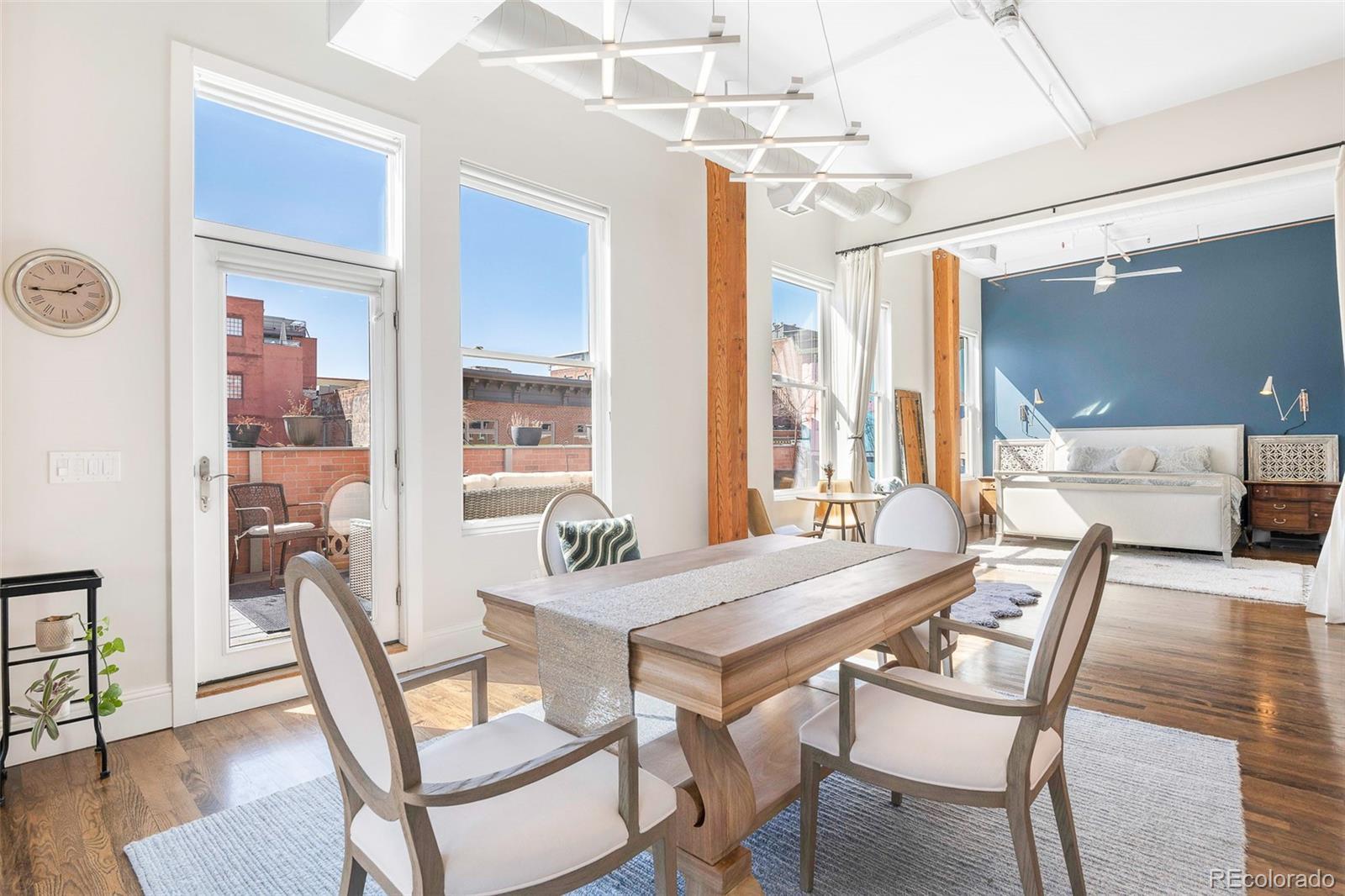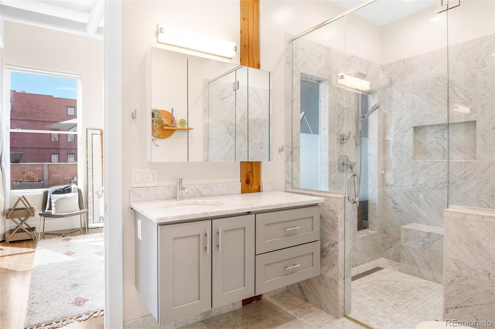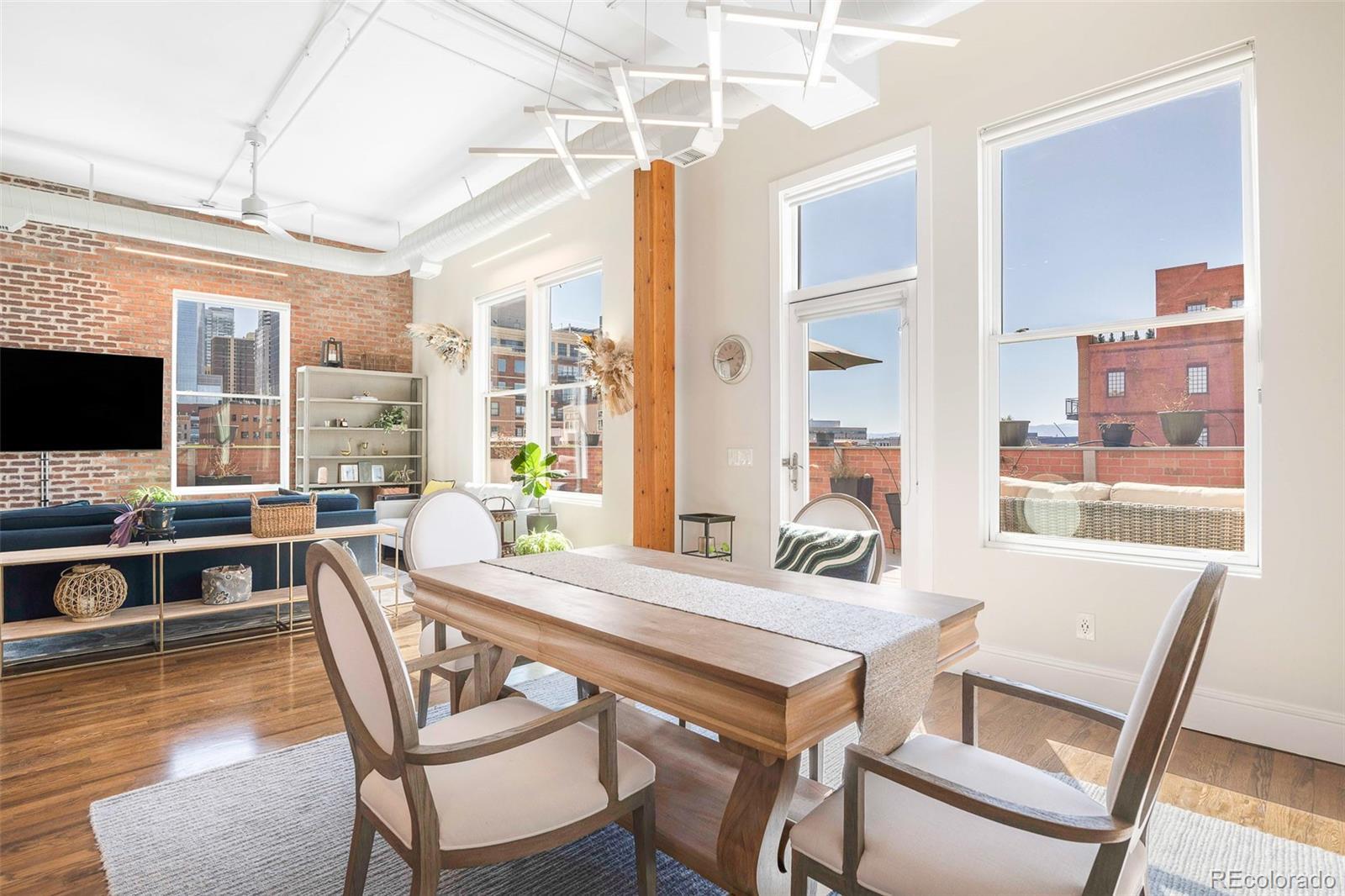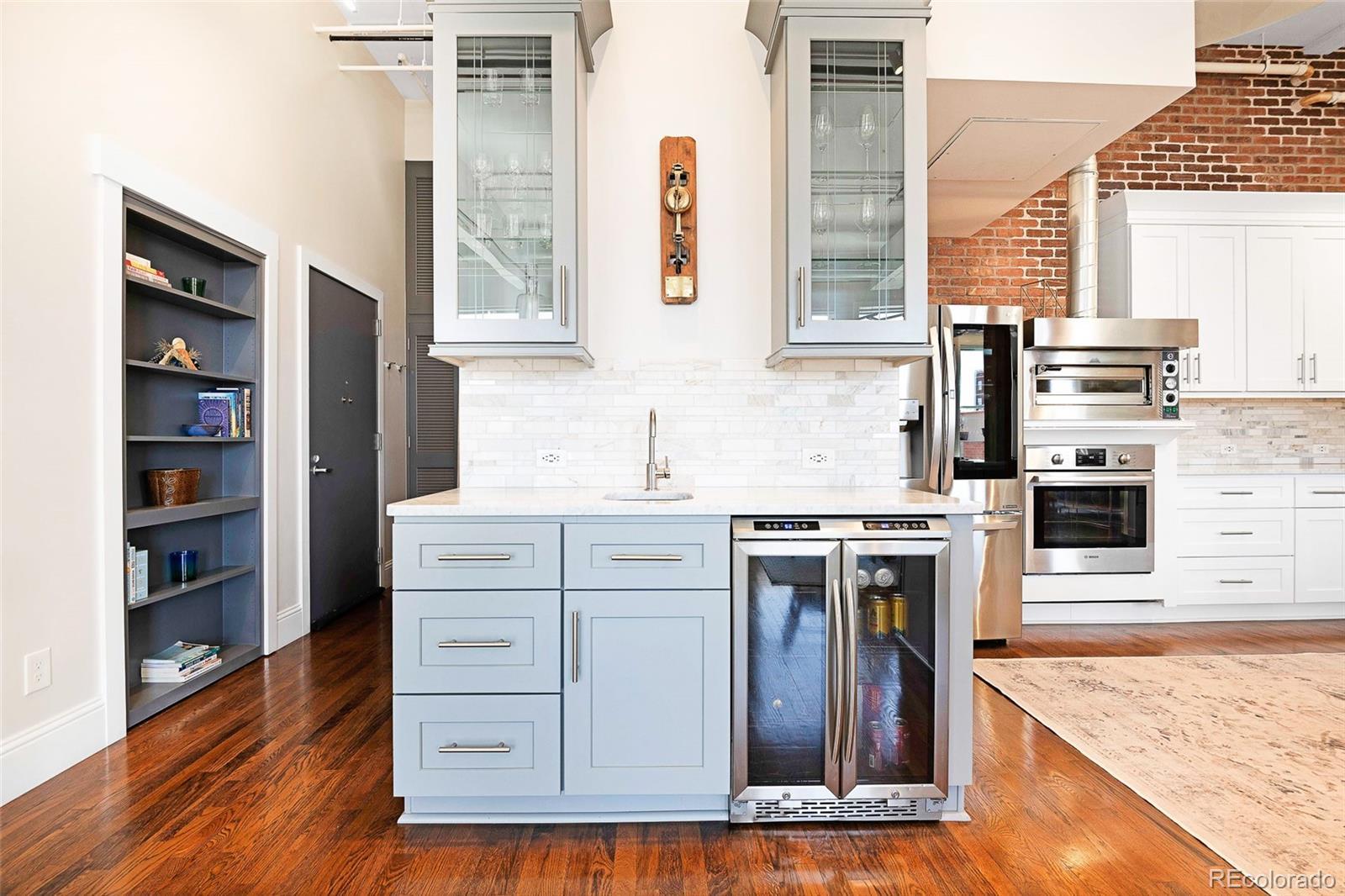 Home is recently remodeled for city oasis & entertainment hub. This top floor 2 BR / 2 BA loft is located in Lodo’s historic Hardware Block Lofts! The home was completely remodeled (2020) to provide modern amenities, while simultaneously protecting the original character of the building. Upon entry, one is greeted by the hardwood floors, exposed brick, 12 ft high ceilings, timber beams, large windows on all sides & an open floor plan that defines true loft living. This spectacular home has 2 primary highlights. First, the kitchen is made for gathering & entertaining. The kitchen has been outfitted with high-end Stainless Steel Appliances, Italian carrara marble slab counters & white high-end shaker cabinets. The jewel of the kitchen is the pizza oven, imported from Italy. The second, & best, feature is the 900 SF wrap- around rooftop deck/balcony. Enjoy morning coffee or hosting evening cocktails on this private spot overlooking downtown. And on a hot summer day you can turn on the misters to help cool things down. The huge primary bedroom easily accommodates a king bed & features en-suite bathroom with a large walk-in closet, which is also accessed by a secret door. Both bathrooms feature luxurious Italian carrara marble. The home is plumbed for: (1) a gas fireplace & (2) an ice machine at the wet bar. (Above the entrance of the bedroom & office there are 22-gauge steel beams that were designed to handle steel doors) The Loft has 2 deeded garage parking spaces; a rarity for this price. Just steps out the door to: Union Station 5 min; Coors Field 10 min; Ball Arena 10 min: & I-25, 5 min drive. Located on a tranquil block of LoDo, so not much disturbance. The unit’s original owner was the architect of the remodeled building & chose this loft because it was “the best unit in the building.” With the price & location, you won't find a better opportunity in Lodo!