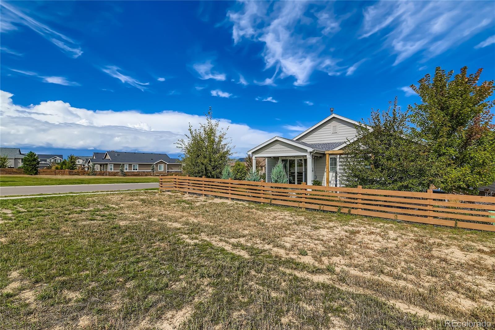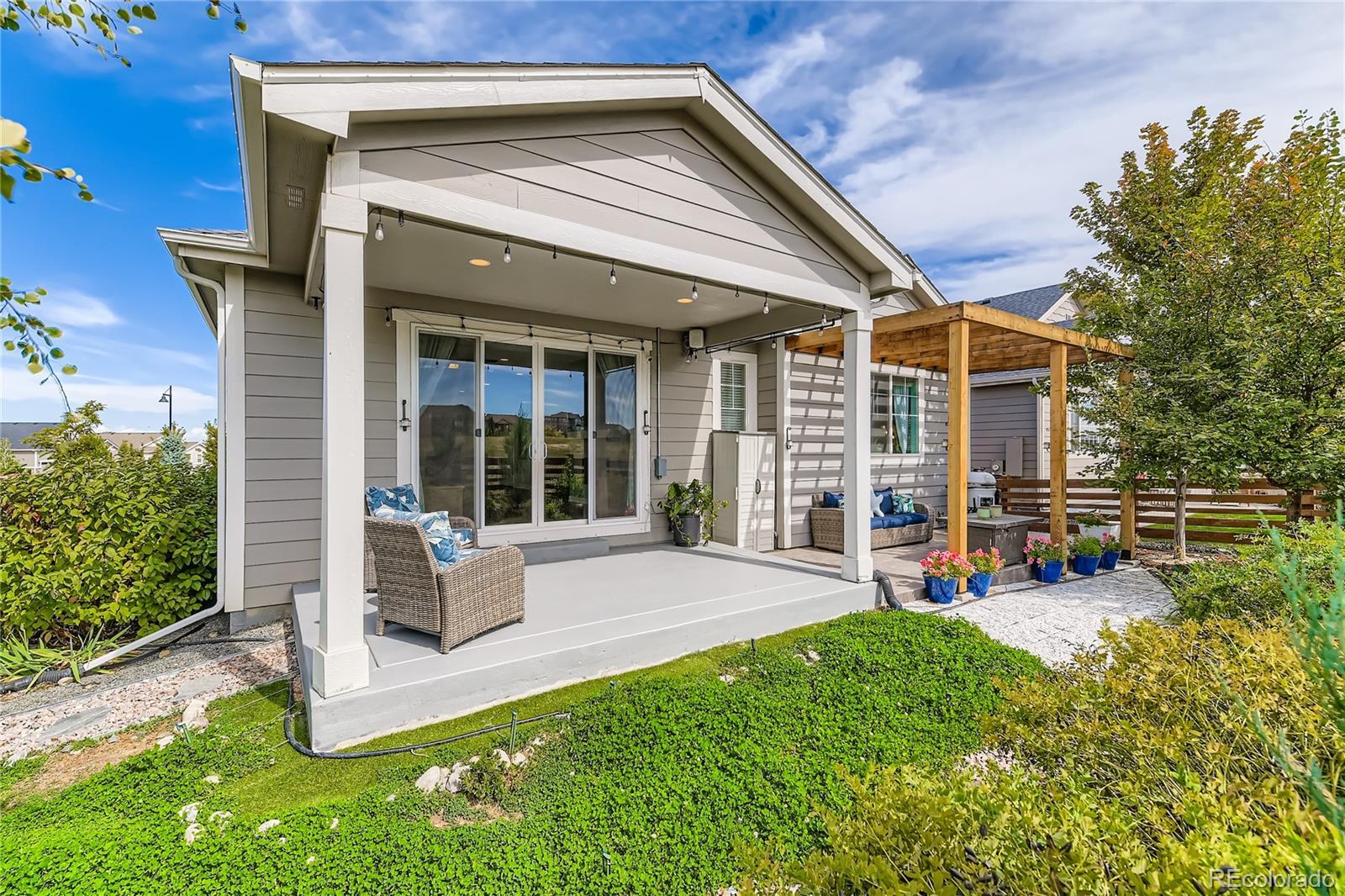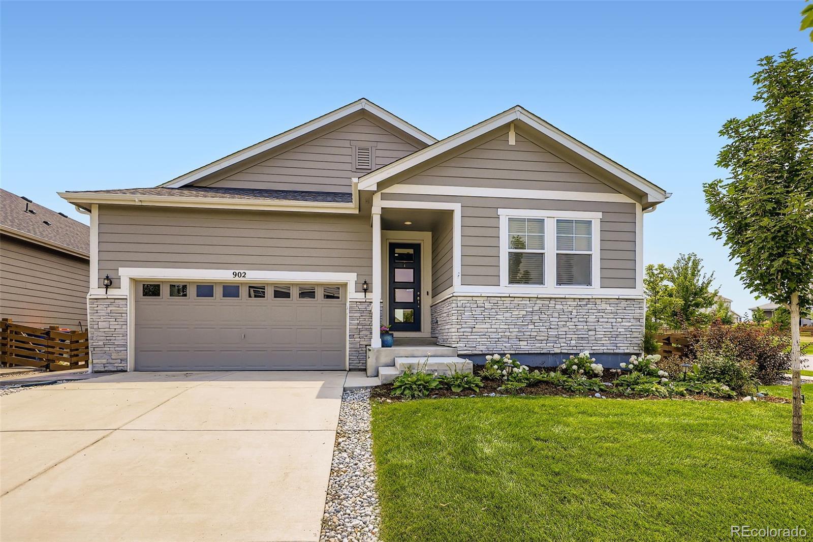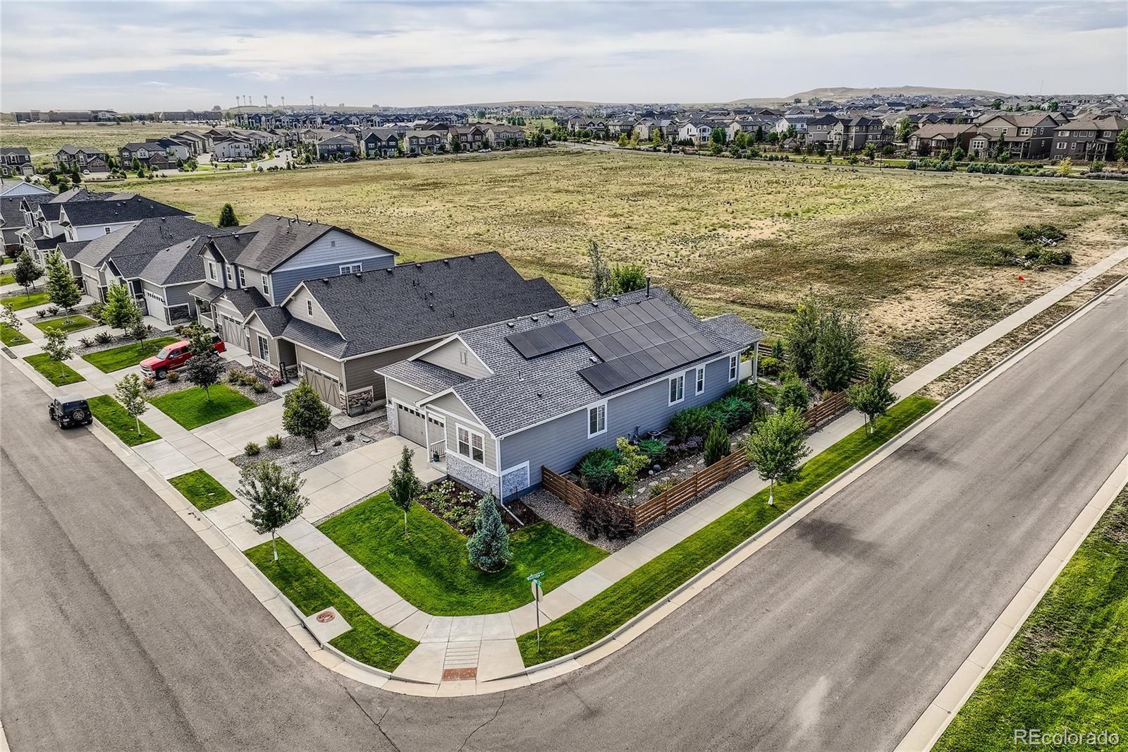 Welcome to this exceptional and nearly-new ranch located on a premium corner lot in Collier Hills offering unparalleled privacy with no homes directly behind (land scheduled for an elementary school). Meticulously constructed, this residence incorporates nearly every available builder upgrade and is offered at a significant value, priced well below new construction. The home is further enhanced by the seller's addition of a fully paid for active solar system ensuring low utility bills. The upgraded gourmet kitchen is a chef's dream, featuring an expansive center island, solid wood cabinetry, top-of-the-line appliances, quartz countertops, and large pantry. Flowing seamlessly from the kitchen the living room offers a stylish tile fireplace, integrated surround sound, and direct access to your private outdoor oasis: a 2-tier covered patio with pergola and a vibrant xeriscaped yard showcasing over 100 native perennial flowering plants and bushes. The oversized primary suite is a retreat with a coffered ceiling, spacious walk-in closet, and an upgraded 5-piece deluxe bath with a separate soaking tub and shower. Two additional main-floor bedrooms offer flexibility, with one perfectly suited as a study/home office. A convenient large main-floor laundry/mud room offers one level living with the washer and dryer being included. The finished basement offers a remarkable secondary living space with 9-foot ceilings, a large wet bar designed like a full kitchen (with quartz counters and extensive cabinetry), a spacious recreation room with surround sound, two additional bedrooms, and a versatile exercise/hobby room. The finished two-car garage features a 220-volt Powerhub for convenient electric vehicle charging, epoxy floor and additional storage space. Throughout the home you'll find engineered wood floors, upgraded carpet, quartz countertops, and more. A dream home move in ready. Colliers Hill is a planned community with pools, clubhouse, parks, playgrounds, and trails.