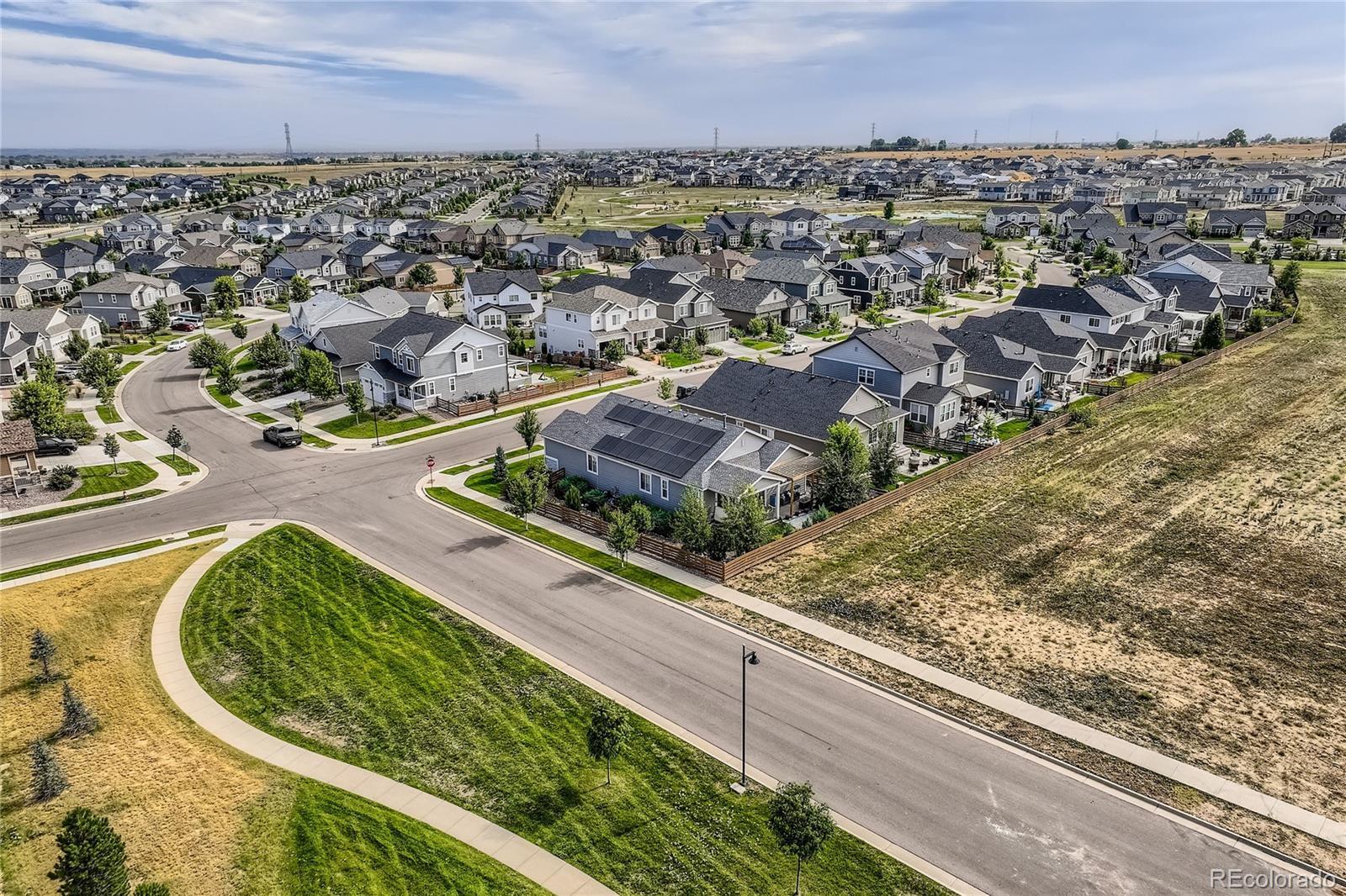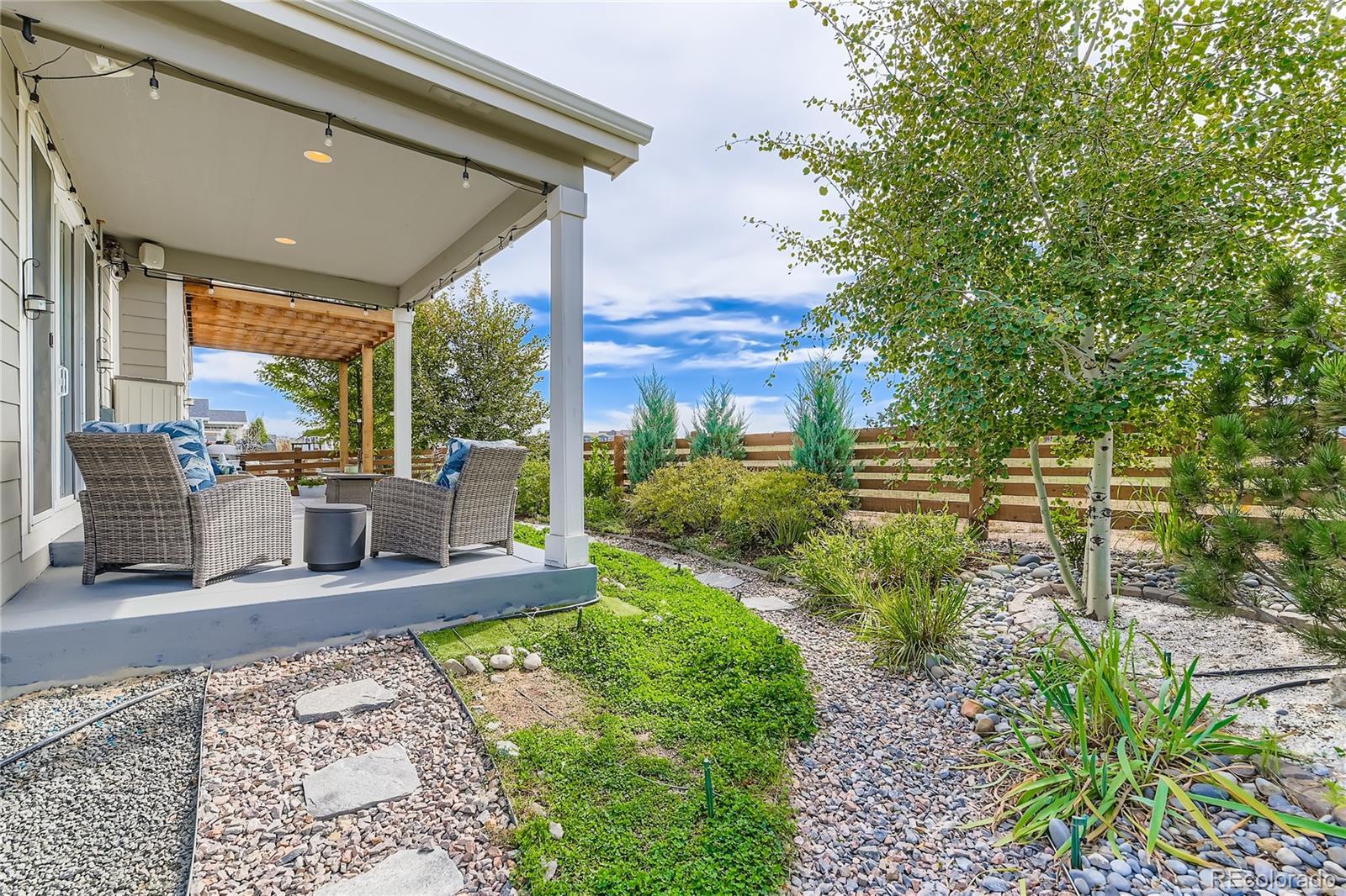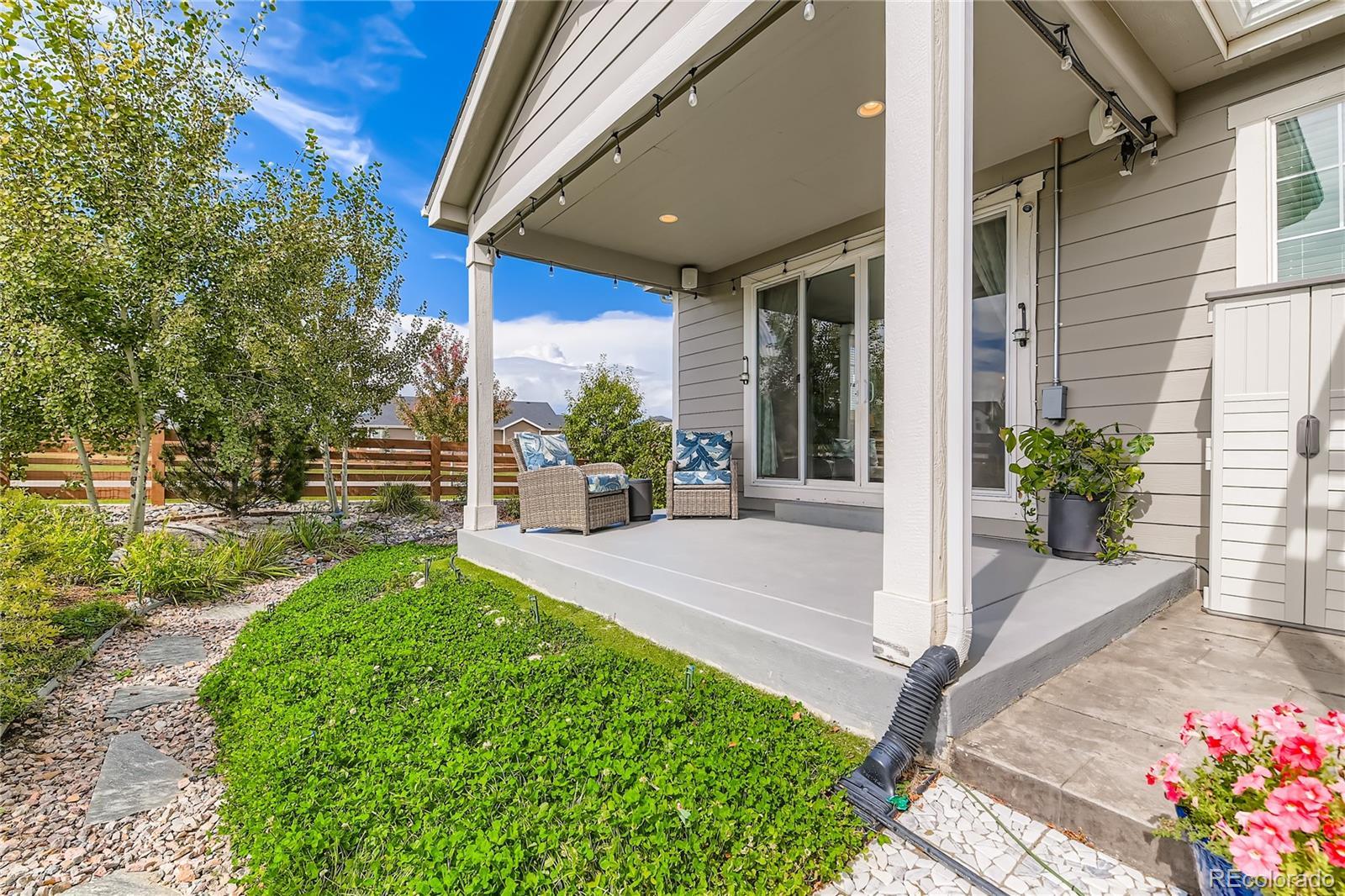 Welcome to this exceptional and nearly-new ranch located on a premium corner lot in Collier Hills offering unparalleled privacy with no homes directly behind (land scheduled for an elementary school). Meticulously constructed, this residence incorporates nearly every available builder upgrade and is offered at a significant value, priced well below new construction. The home is further enhanced by the seller's addition of a fully paid for active solar system ensuring low utility bills. The upgraded gourmet kitchen is a chef's dream, featuring an expansive center island, solid wood cabinetry, top-of-the-line appliances, quartz countertops, and large pantry. Flowing seamlessly from the kitchen the living room offers a stylish tile fireplace, integrated surround sound, and direct access to your private outdoor oasis: a 2-tier covered patio with pergola and a vibrant xeriscaped yard showcasing over 100 native perennial flowering plants and bushes. The oversized primary suite is a retreat with a coffered ceiling, spacious walk-in closet, and an upgraded 5-piece deluxe bath with a separate soaking tub and shower. Two additional main-floor bedrooms offer flexibility, with one perfectly suited as a study/home office. A convenient large main-floor laundry/mud room offers one level living with the washer and dryer being included. The finished basement offers a remarkable secondary living space with 9-foot ceilings, a large wet bar designed like a full kitchen (with quartz counters and extensive cabinetry), a spacious recreation room with surround sound, two additional bedrooms, and a versatile exercise/hobby room. The finished two-car garage features a 220-volt Powerhub for convenient electric vehicle charging, epoxy floor and additional storage space. Throughout the home you'll find engineered wood floors, upgraded carpet, quartz countertops, and more. A dream home move in ready. Colliers Hill is a planned community with pools, clubhouse, parks, playgrounds, and trails.