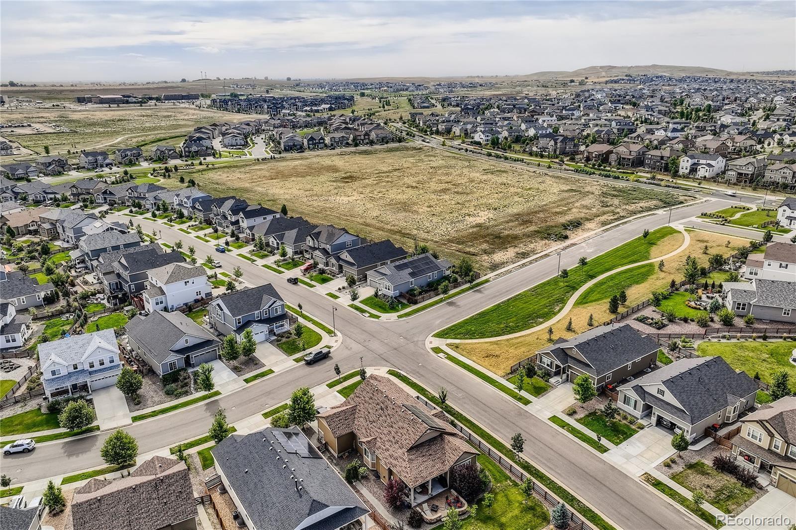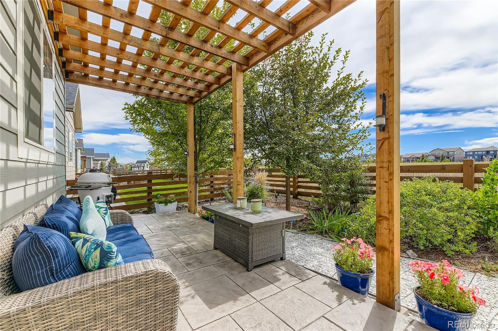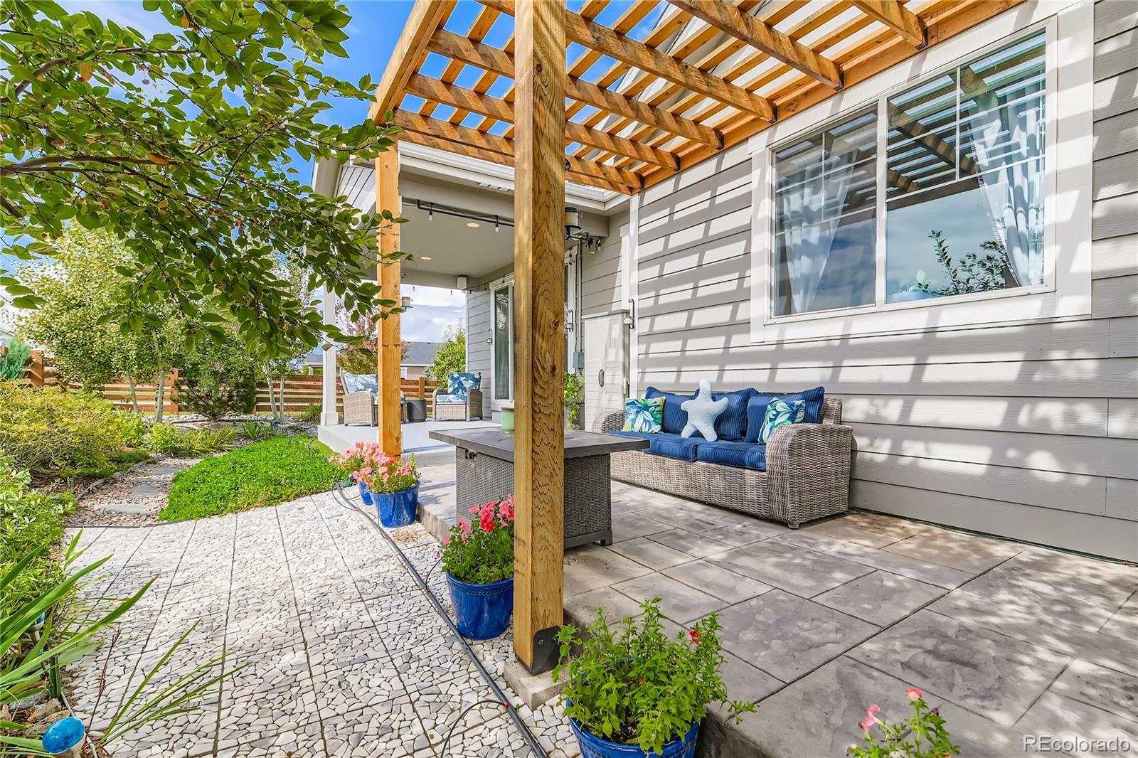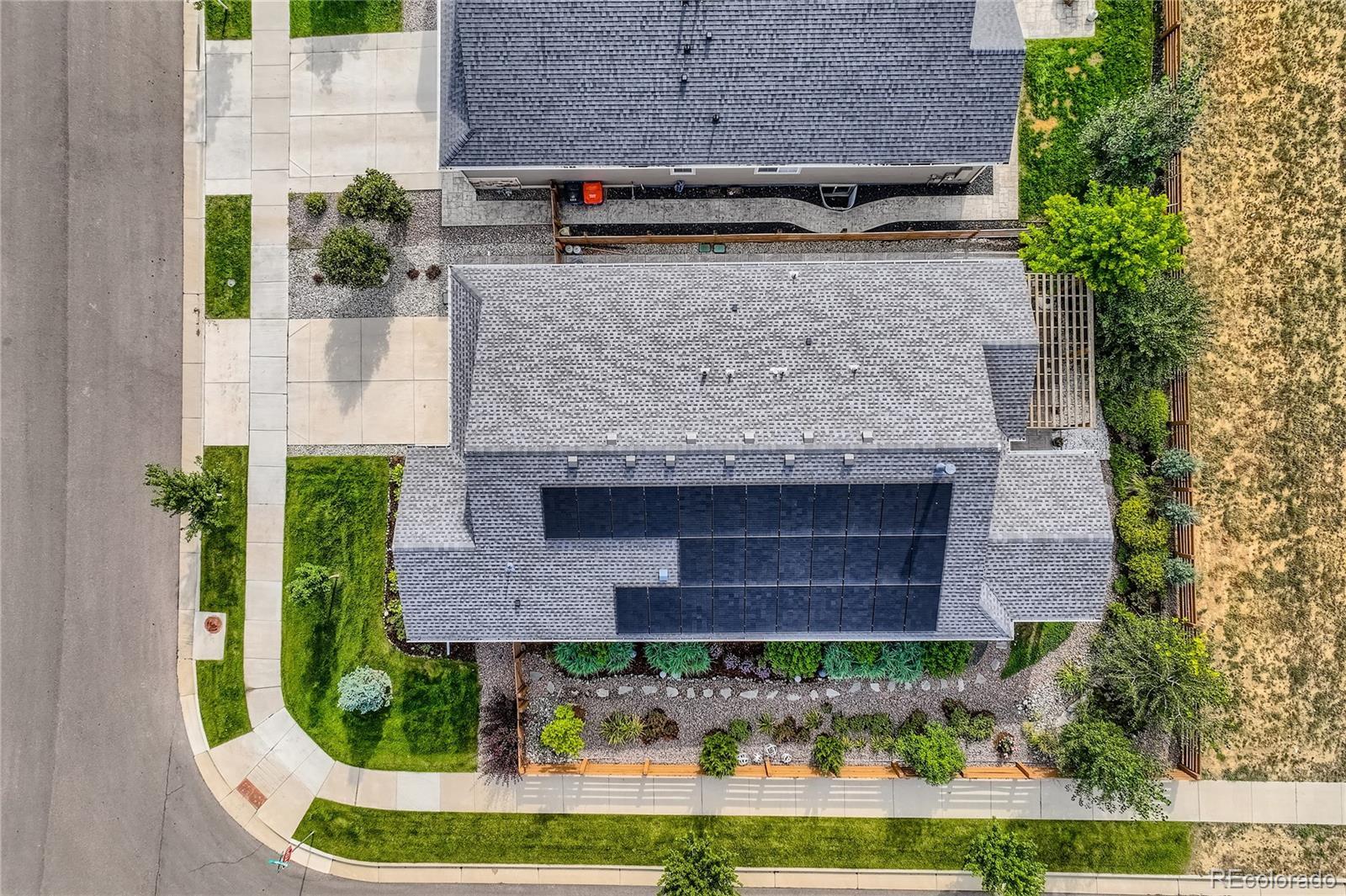 Welcome to this exceptional and nearly-new ranch located on a premium corner lot in Collier Hills offering unparalleled privacy with no homes directly behind (land scheduled for an elementary school). Meticulously constructed, this residence incorporates nearly every available builder upgrade and is offered at a significant value, priced well below new construction. The home is further enhanced by the seller's addition of a fully paid for active solar system ensuring low utility bills. The upgraded gourmet kitchen is a chef's dream, featuring an expansive center island, solid wood cabinetry, top-of-the-line appliances, quartz countertops, and large pantry. Flowing seamlessly from the kitchen the living room offers a stylish tile fireplace, integrated surround sound, and direct access to your private outdoor oasis: a 2-tier covered patio with pergola and a vibrant xeriscaped yard showcasing over 100 native perennial flowering plants and bushes. The oversized primary suite is a retreat with a coffered ceiling, spacious walk-in closet, and an upgraded 5-piece deluxe bath with a separate soaking tub and shower. Two additional main-floor bedrooms offer flexibility, with one perfectly suited as a study/home office. A convenient large main-floor laundry/mud room offers one level living with the washer and dryer being included. The finished basement offers a remarkable secondary living space with 9-foot ceilings, a large wet bar designed like a full kitchen (with quartz counters and extensive cabinetry), a spacious recreation room with surround sound, two additional bedrooms, and a versatile exercise/hobby room. The finished two-car garage features a 220-volt Powerhub for convenient electric vehicle charging, epoxy floor and additional storage space. Throughout the home you'll find engineered wood floors, upgraded carpet, quartz countertops, and more. A dream home move in ready. Colliers Hill is a planned community with pools, clubhouse, parks, playgrounds, and trails.