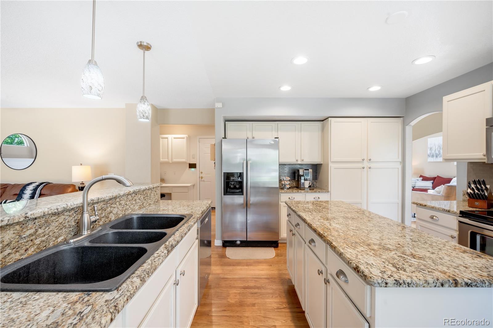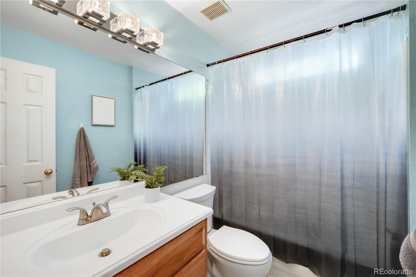 Back on the market because former Buyer's financing fell through. Neatly tucked away on a quiet cul-de-sac, this home invites you in with lush, front yard landscaping, two-story high vaulted ceilings, open rail staircase, and gleaming solid hardwood floors through the main floor. This traditional floorplan features an entryway foyer, a spacious, well- lit living room with skylights, and vaulted ceiling. The formal dining room has plenty of room for entertaining, and is conveniently located just off the kitchen, The kitchen features white cabinets, granite countertops, stainless-steel appliances and opens to the family room. There is also a kitchen bar and breakfast nook for casual dining. In the family room you will find hardwood floors, a cozy mantled fireplace, and access to the outdoor deck. Just off the family room is a cozy office, and well-lit laundry room down the hall. Upstairs, there are three spacious bedrooms, a full, tiled bathroom and a luxurious primay suite with vaulted ceilings, plenty of windows, a large walk-in closet, and an ensuite five piece primary bathroom. The basement has a fabulous bonus room that can be used as an additional den, office, space, game room, – so many possibilities! There is also an additional bedroom and bathroom – perfect for a guest suite – and plenty of closet and storage space. The basement has a sliding door to the backyard, where you can easily access the beautifully landscaped paver patio and lawn space. The location is everything you could want! Easily access the nearby West Tollgate Creek Trail, or spend a day at the nearby Aurora Central Rec Center. Shopping and entertainment are just a half mile away at the Seven Hills Plaza shopping center. This house is move-in ready, with new roof, new exterior paint, new radon mitigation system, new windows, new gutters, newer hot water heater, and newer A/C. Located within the Cherry Creek School District. Buyer to verify all schools.