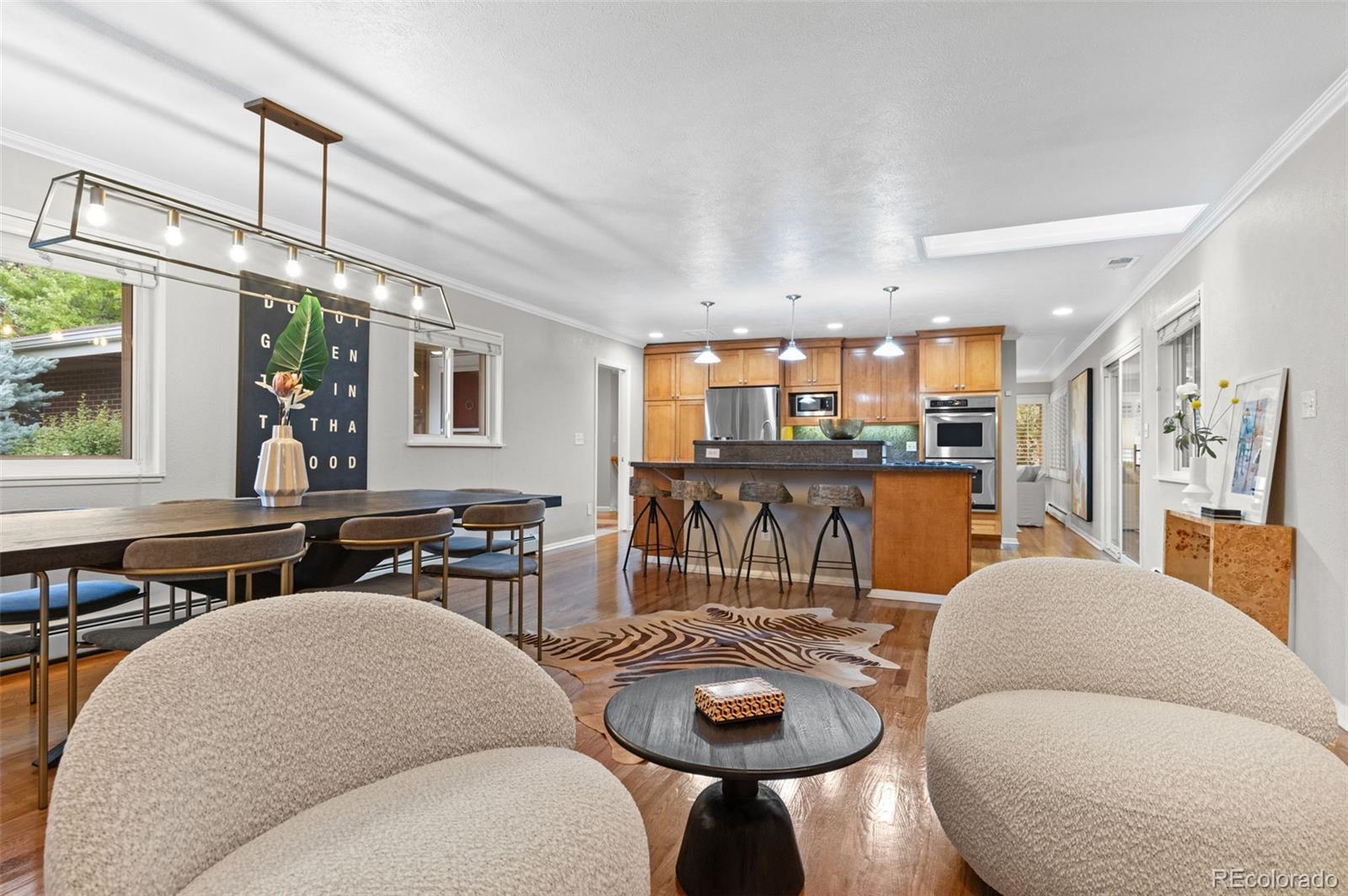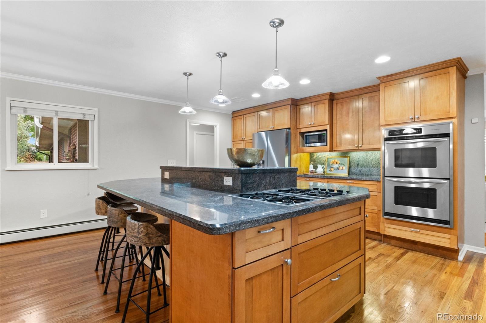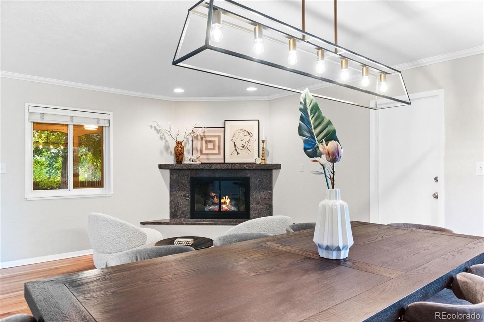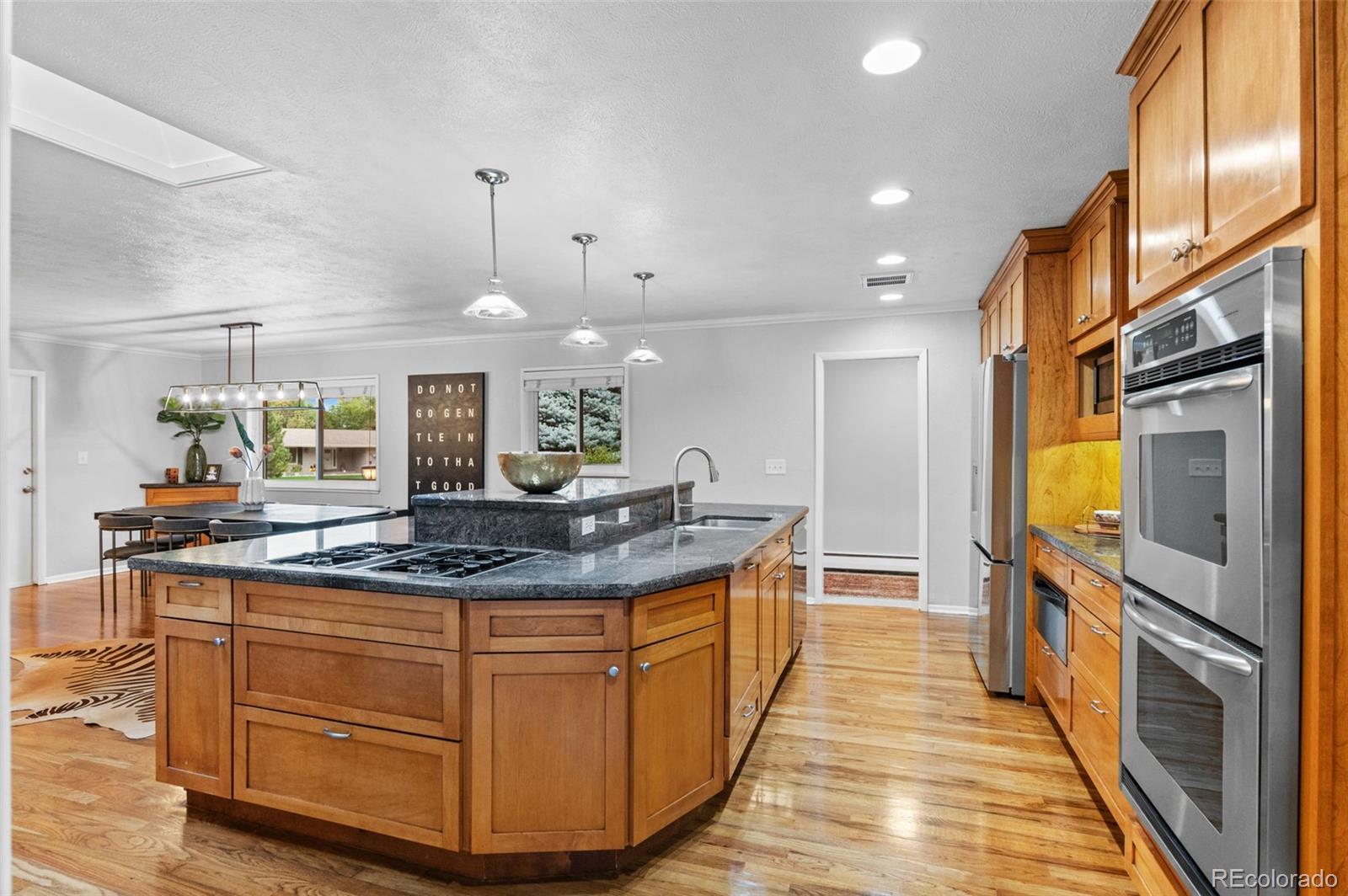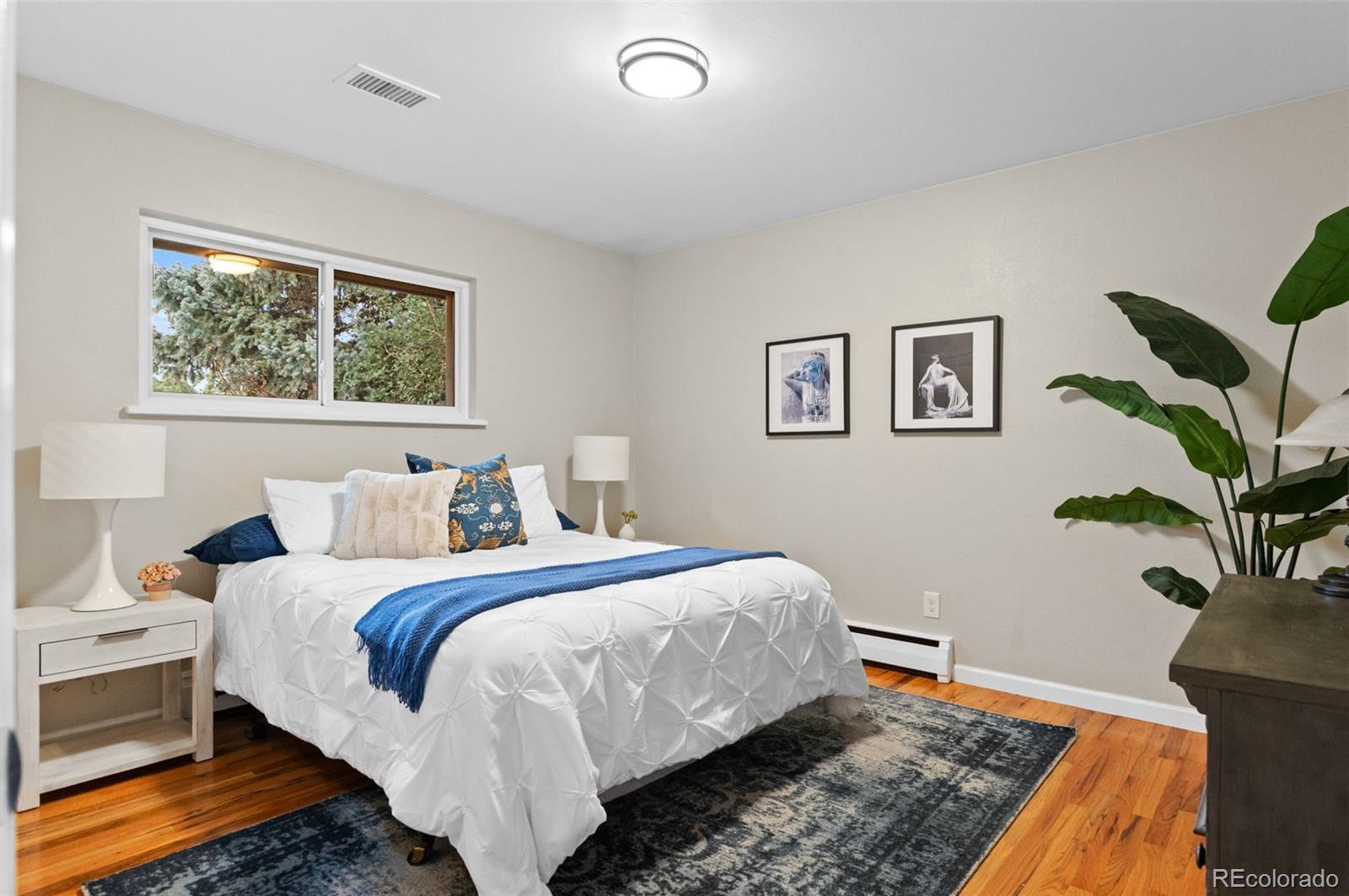 Welcome to this rare find in Cherry Creek Village North! This ranch-style home offers over 2,500 finished square feet above grade, with 4 bedrooms on the main level, gorgeous hardwood floors, and an amazing/ideal layout. The kitchen, family room, and covered patio connect seamlessly, creating the perfect gathering space for friends and family. The kitchen shines with maple cabinets, granite counters, stainless steel appliances, gas cooktop, warming drawer, a large island with bar seating, and a built-in pantry with pull-out shelving. The inviting family room features custom built-ins and flows to the backyard patio with a built-in gas fire pit and natural gas grill, ideal for summer nights with friends or family. The primary suite is a retreat of its own with a cozy fireplace, private patio access, custom cabinetry, and a bathroom and closet suite that feel like another wing of the home. The finished basement adds nearly 1,000 square feet of versatile space and a large 3/4 bathroom. Great for more living room/bonus area or a 5th bedroom. Major updates include a newer 100 year steel-coated stone roof and fully owned solar panels for maximum efficiency and monthly savings! The location is unmatched: walk to Belleview Elementary, Campus Middle, and Cherry Creek High School, as well as restaurants, King Soopers, and Village Greens Park with its playground, climbing wall, frisbee golf course, and mountain biking trails. Right next door is Cherry Creek State Park, where you can hike, boat, swim, or simply enjoy the beach. Commuting is easy with quick access to I-225, I-25, and the Denver Tech Center. Living in Greenwood Village means access to outstanding city services, a renowned Parks & Rec department, community events, and Greenwood Village Day each July, where you can watch fireworks from your own driveway. The neighborhood $125/year HOA keeps things fun and flexible with frequent social gatherings. Come see this home today!
