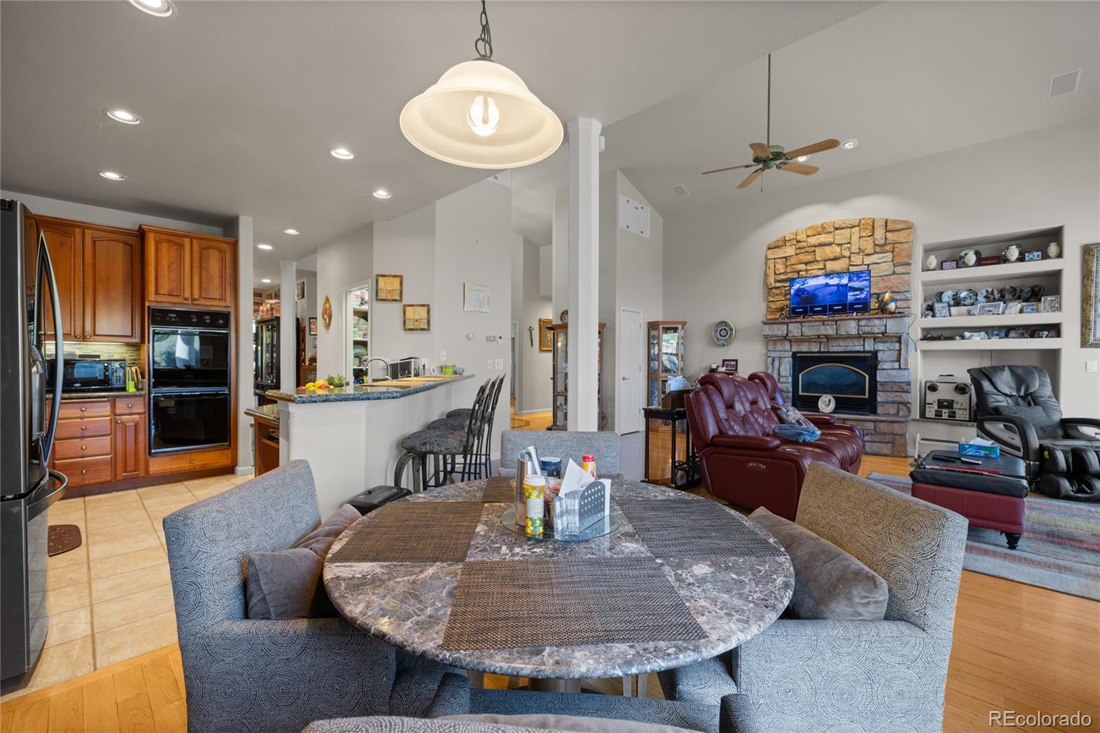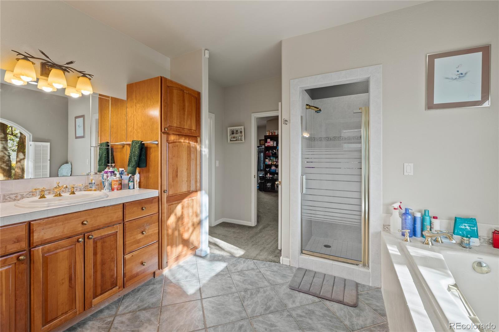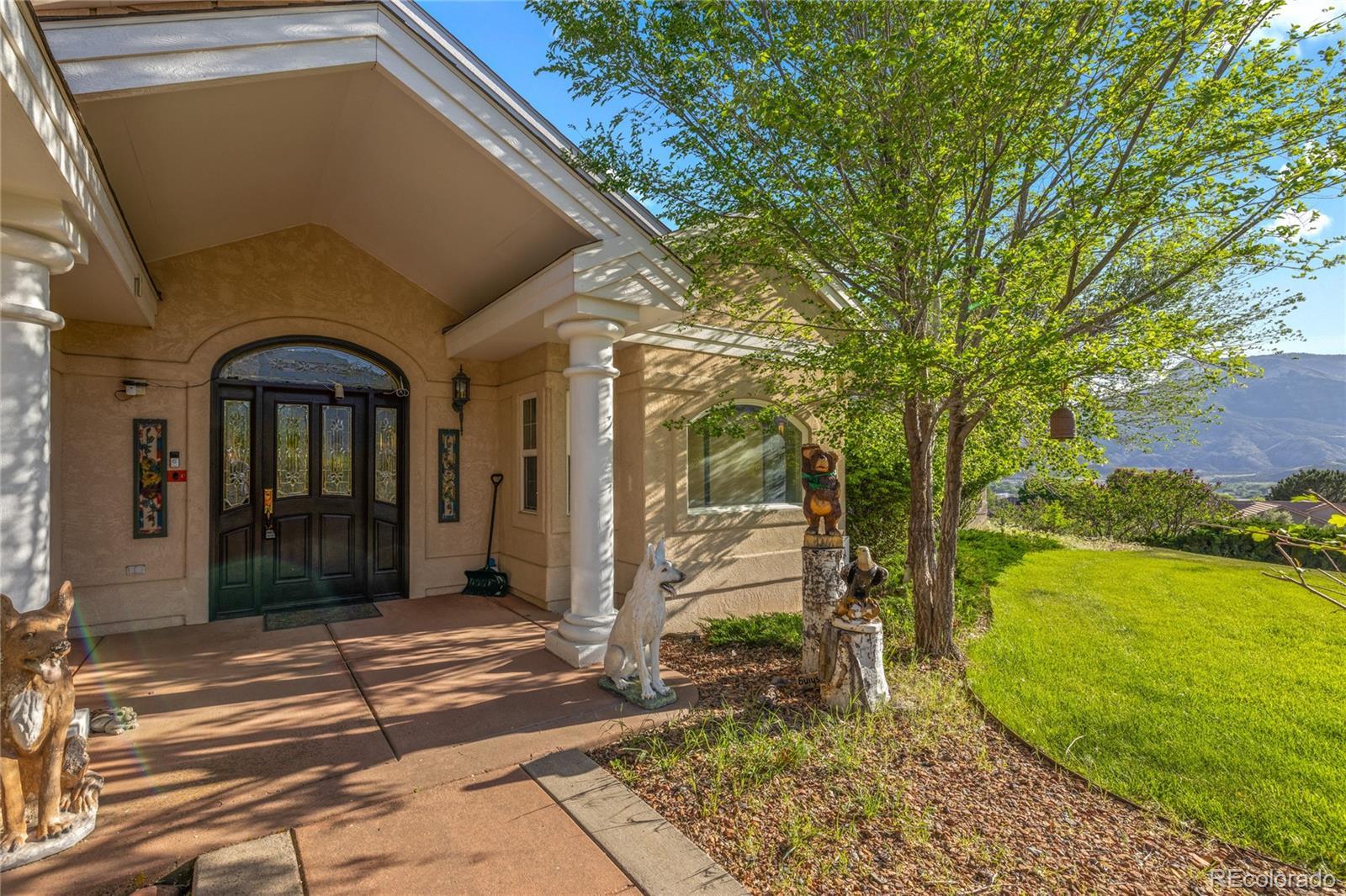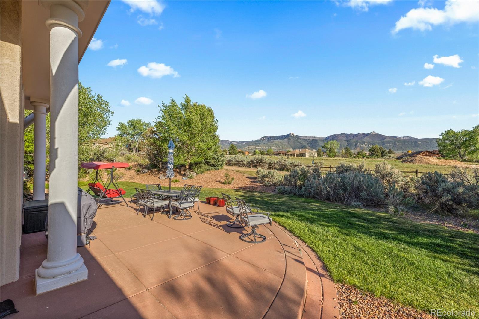 Beautiful ranch-style home with absolutely stunning 360-degree mountain views and standout curb appeal! This spacious 3-bedroom, 3.5-bath home offers luxurious comfort and thoughtful design throughout. The expansive Owner’s Suite is a true retreat—featuring a sitting area, gas fireplace, private patio access, and a walk-through closet system with space for hundreds of pairs of shoes and everything in between. The spa-like 5-piece bath includes a large soaker tub, walk-in shower, and double vanity. The In-Law Suite is perfect for extended family or guests, complete with a kitchenette, dining space, large bedroom with walk-in closet, en-suite bath, sitting/TV room, and private patio access. The third bedroom is generously sized as well, featuring built-ins and its own en-suite bath—ideal for a home office or guest suite. Set just around the corner from a golf course, this home offers daily mountain vistas and frequent wildlife visits, making it feel like a private Colorado retreat in a highly desirable location.