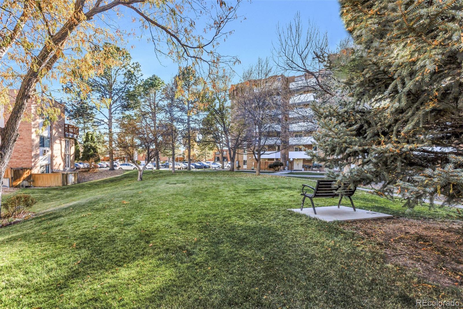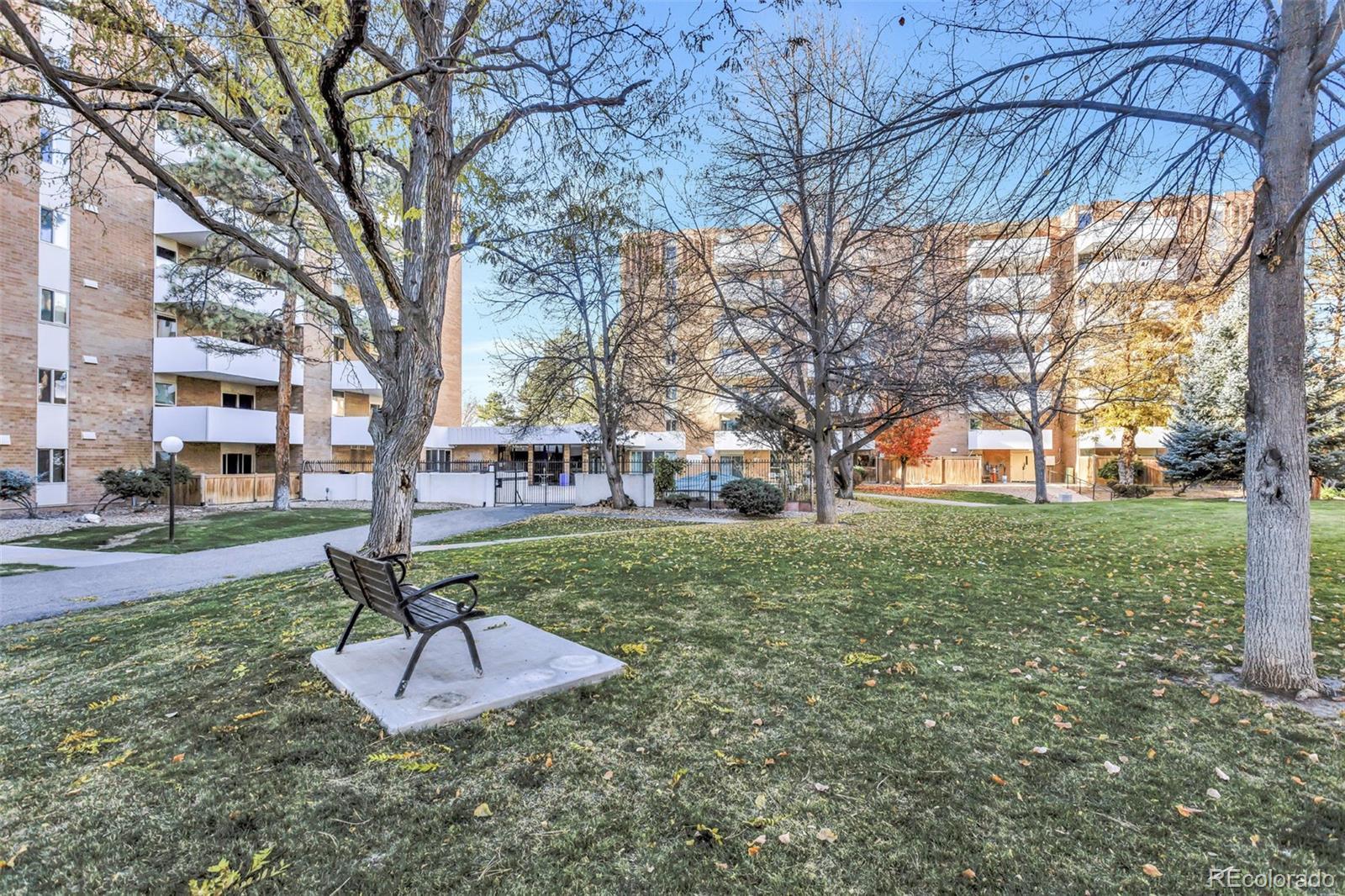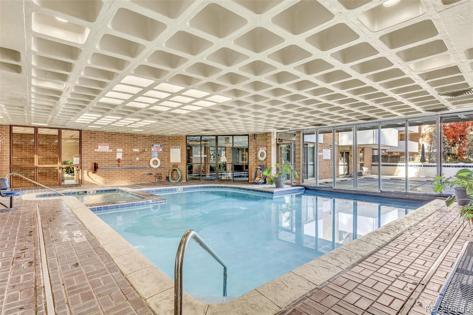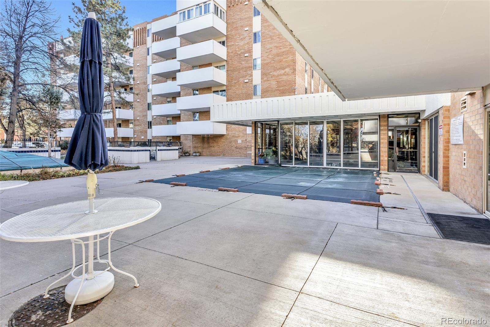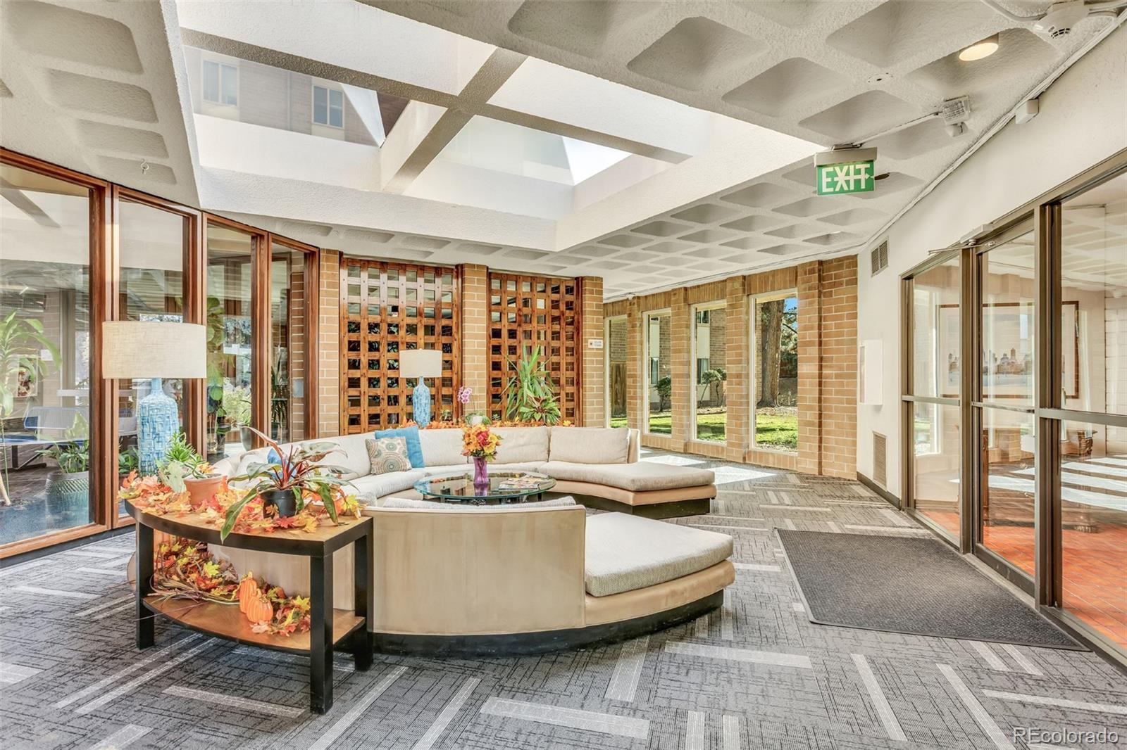 Discover unparalleled, resort-style living in this meticulously updated mid-century modern condo. This rare find blends contemporary design with comprehensive amenities and ultimate sophisticated, low-maintenance living. This home boasts new, remodeled windows throughout, ensuring energy efficiency and tranquil interiors. Step into the voluminous, sun-drenched living space, anchored by bespoke, built-in bookshelves and featuring elegant laminate flooring. Modern track lighting provides adaptable illumination, complementing the dedicated dining area. The adjacent kitchen is an aspiring chef’s dream, appointed with a stainless steel stove (electric glass cooktop), new refrigerator, and a Martha Stewart dishwasher. It features a new double sink with a modern black pull-out faucet, Formica countertops, and a clever cut-through to the dining area. The primary suite is a true private retreat, designed for tranquility. It connects directly to your private concrete patio via a new sliding glass door. This space faces west toward the mountains and stunning Colorado sunsets, offering a premium vantage point. The remodeled ensuite 3/4 bath is well-appointed, featuring tile floors, a new vanity with a double sink, a newer toilet, and updated lighting. The thoughtful design includes a walk-through dressing area with dual, custom closet systems for optimized storage. Residents enjoy extraordinary community amenities, including the dramatic lobby, a modern remodeled work room, and a year-round indoor pool and hot tub. The chic recreation lounge features a pool table and ping pong. The beautifully landscaped grounds feature outdoor fountains and offer park-like serenity. Enjoy the convenience of elevator access and dedicated parking. Secure your sophisticated, stress-free Denver living today.