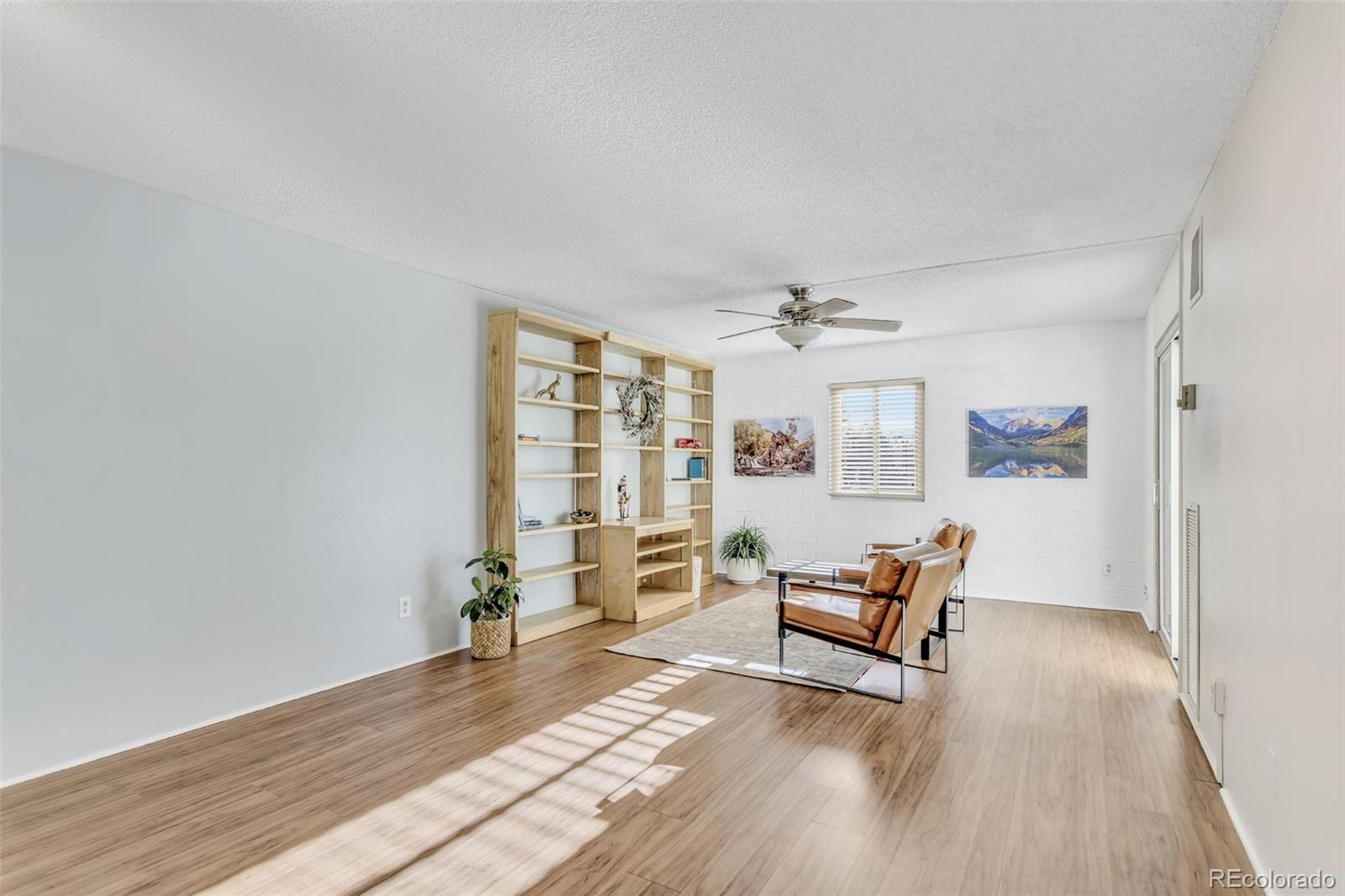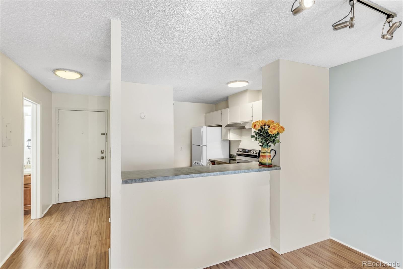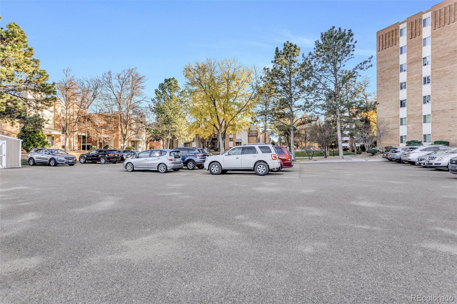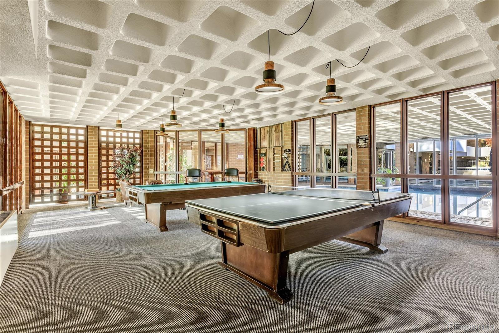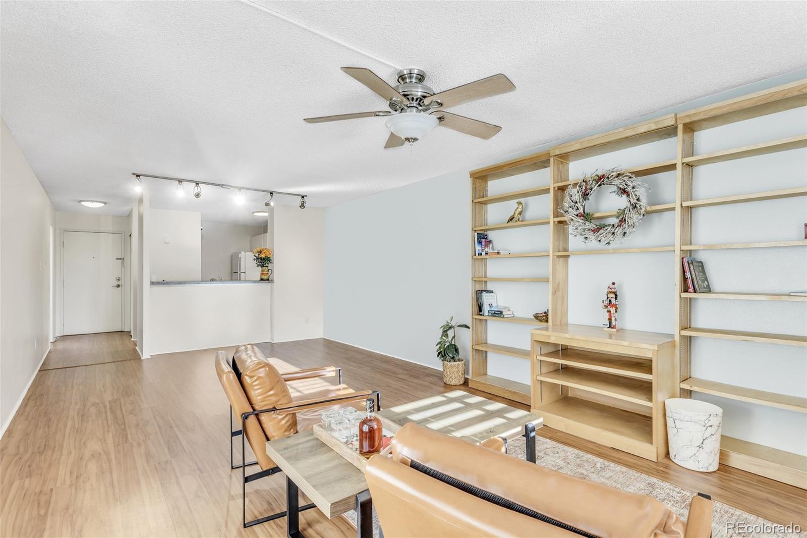 Discover unparalleled, resort-style living in this meticulously updated mid-century modern condo. This rare find blends contemporary design with comprehensive amenities and ultimate sophisticated, low-maintenance living. This home boasts new, remodeled windows throughout, ensuring energy efficiency and tranquil interiors. Step into the voluminous, sun-drenched living space, anchored by bespoke, built-in bookshelves and featuring elegant laminate flooring. Modern track lighting provides adaptable illumination, complementing the dedicated dining area. The adjacent kitchen is an aspiring chef’s dream, appointed with a stainless steel stove (electric glass cooktop), new refrigerator, and a Martha Stewart dishwasher. It features a new double sink with a modern black pull-out faucet, Formica countertops, and a clever cut-through to the dining area. The primary suite is a true private retreat, designed for tranquility. It connects directly to your private concrete patio via a new sliding glass door. This space faces west toward the mountains and stunning Colorado sunsets, offering a premium vantage point. The remodeled ensuite 3/4 bath is well-appointed, featuring tile floors, a new vanity with a double sink, a newer toilet, and updated lighting. The thoughtful design includes a walk-through dressing area with dual, custom closet systems for optimized storage. Residents enjoy extraordinary community amenities, including the dramatic lobby, a modern remodeled work room, and a year-round indoor pool and hot tub. The chic recreation lounge features a pool table and ping pong. The beautifully landscaped grounds feature outdoor fountains and offer park-like serenity. Enjoy the convenience of elevator access and dedicated parking. Secure your sophisticated, stress-free Denver living today.