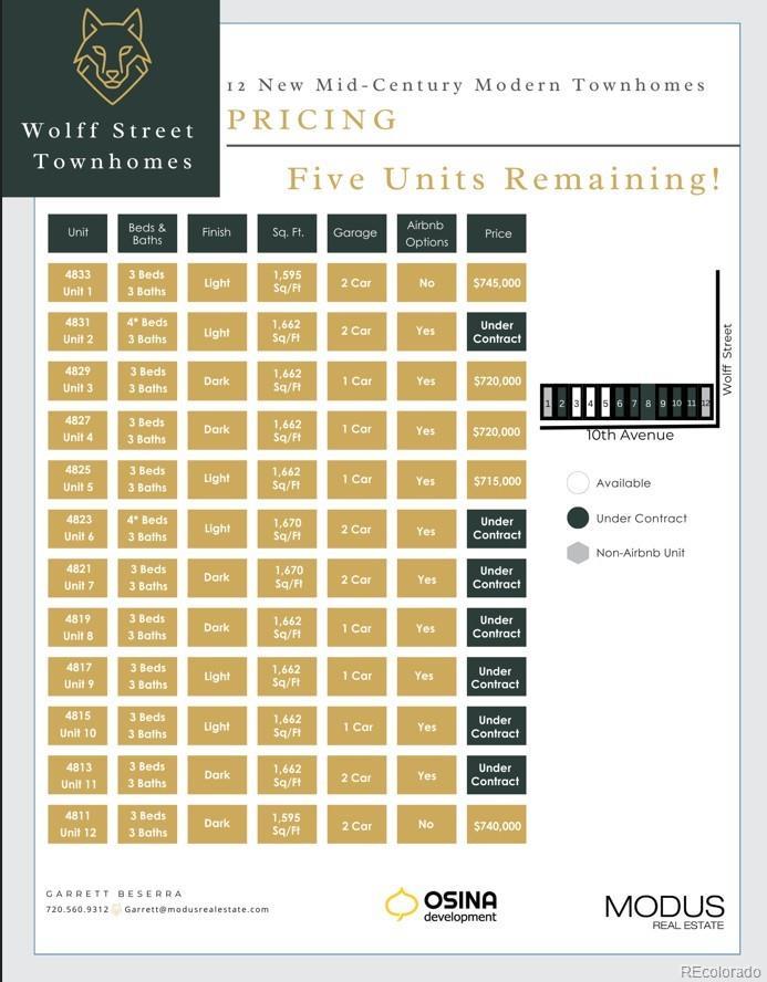 ONLY 5 UNITS LEFT- PROJECTED TO FINISH UNITS MID-MARCH The Wolff St Townhomes-Priced from $699,000 to $750,000 –where modern design meets investment opportunity in a prime Denver location. Situated at the corner of 10th & Wolff, these newly constructed homes are just minutes from Sloan’s Lake, the W Line light rail, Empower Field, and Downtown Denver. Enjoy walkable access to some of the city’s best dining and entertainment, including Cholon, Gusto!, and the vibrant Edgewater Public Market. Each townhome features a spacious 3- to 4-bedroom layout with 3 full bathrooms, private rooftop deck, backyard, and many with 2-car garages. Interiors showcase a curated blend of mid-century modern and Scandinavian finishes, creating a timeless and stylish living space. What sets Wolff St Townhomes apart is the customizable Airbnb lockoff—offering flexibility and income potential. Upgrade options range from a standard suite to a full guest unit with kitchenette, washer/dryer, and bar seating. AirDNA projects $20,000- $30,000 in annual short-term rental income, making this an ideal opportunity for homeowners and investors alike. Priced from $699,000 to $750,000, including a 1.75% credit toward closing costs, rate buydown, or a 2/1 buydown to lower your monthly payments via the community reinvestment act. Lenders are also offering $10,000 in down payment assistance. Experience the perfect blend of lifestyle, location, and income potential at Wolff St Townhomes. Project is projected to be completed mid March 2026. https://garrettbeserra.com/wolff-street-townhomes/ Keywords: New construction, airbnb, VRBO, Short term rental, Lock off, lock-off, Airbnb, 2/1 buydown, New build, CRA loan, in-law suite, ADU, adu, income producing, income property.