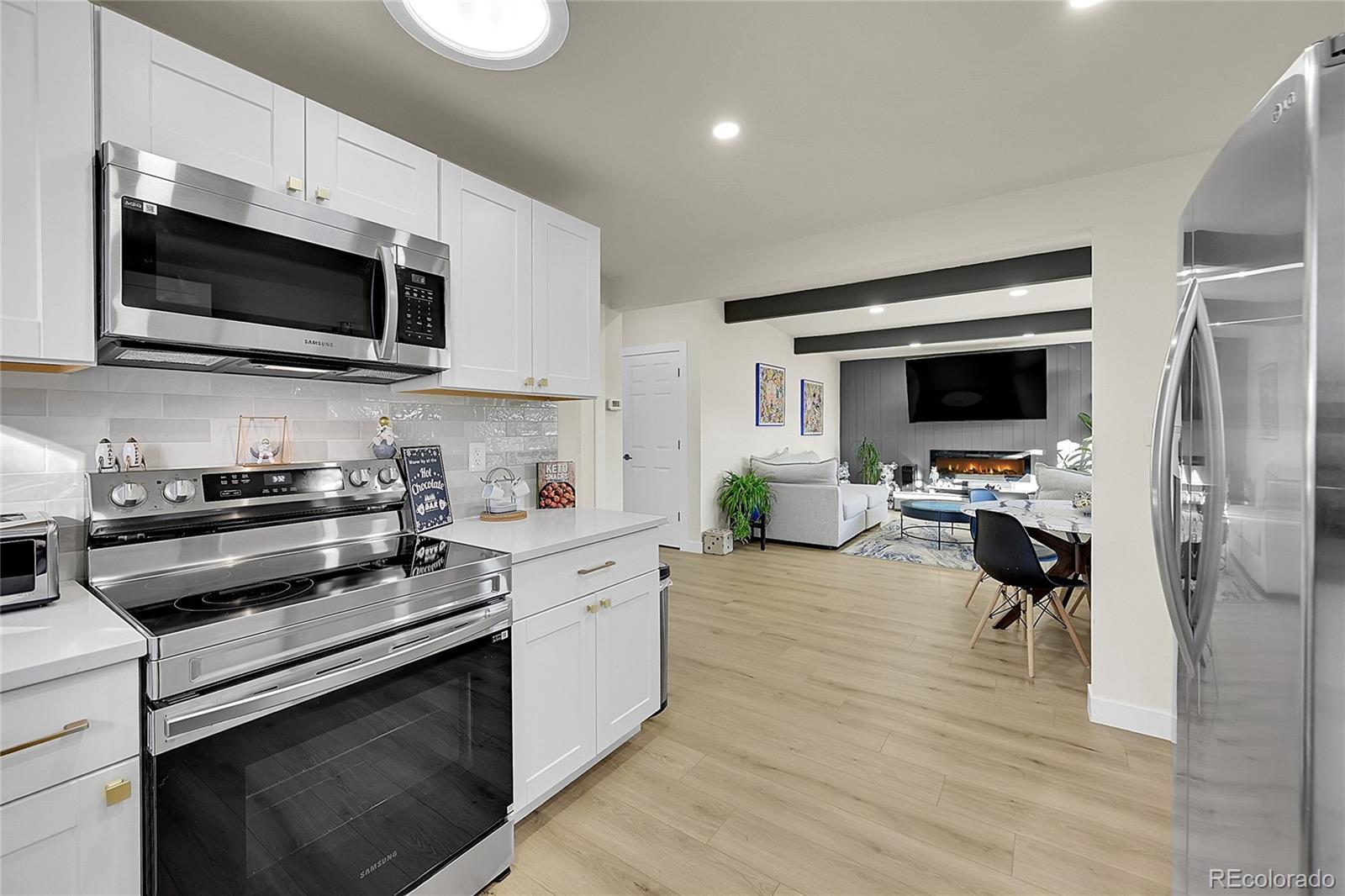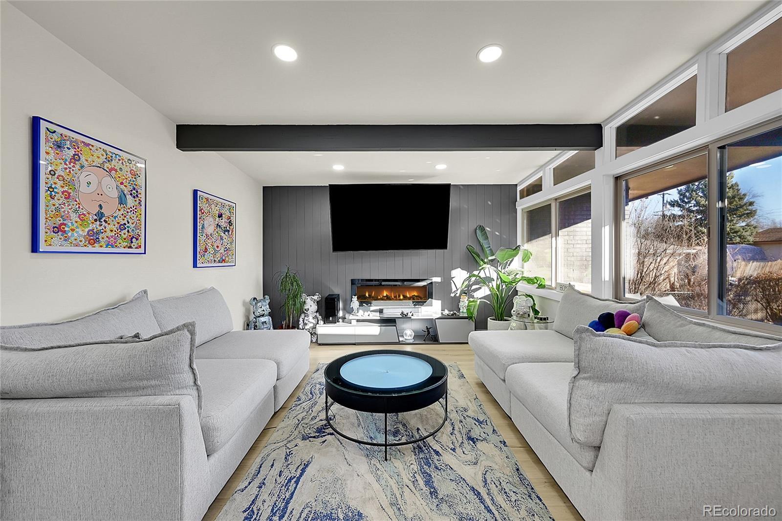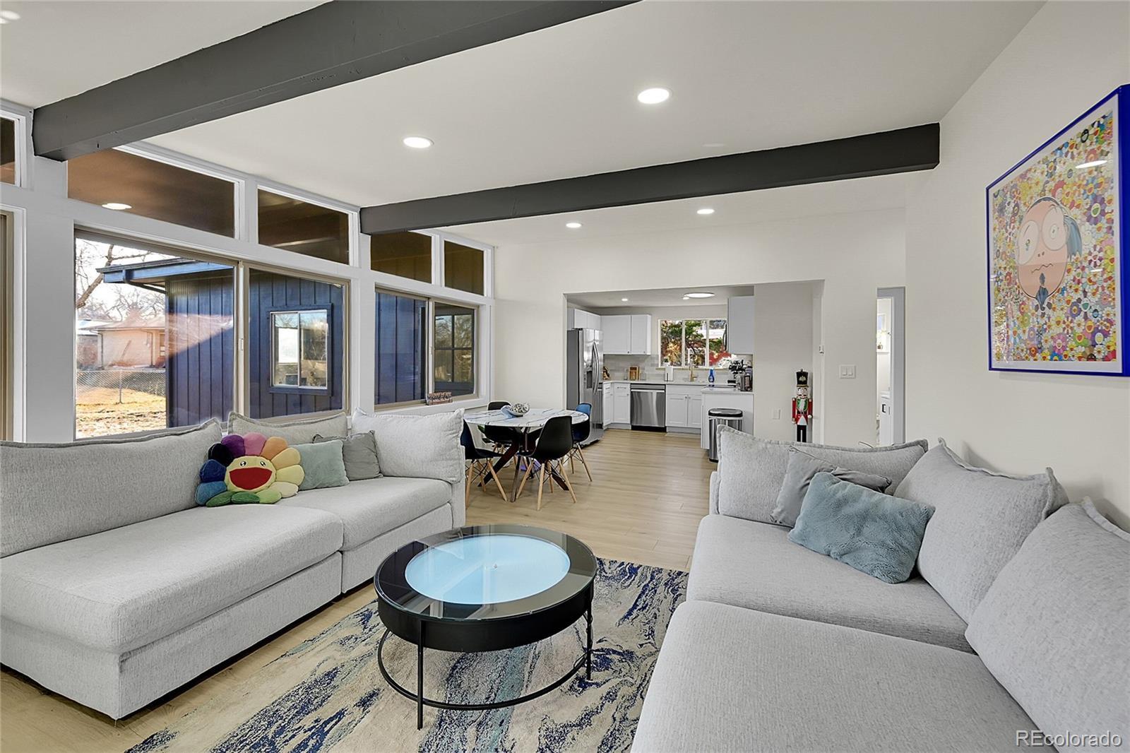 Welcome to this fully remodeled Mid-Century Modern gem perfectly situated in the heart of Lakewood, just three minutes from Belmar Shopping Mall and all the dining, retail, and entertainment you could ask for. Spanning over 2,000 square feet, this 3-bedroom, 3-bath home blends timeless mid-century architecture with today’s modern finishes for the ideal balance of character and comfort. Step inside to discover a bright, open-concept living space featuring vaulted ceilings, large picture windows, and sleek new flooring throughout. The custom-designed kitchen showcases quartz countertops, soft-close cabinetry, and brand-new stainless steel appliances. The seamless flow between living, dining, and kitchen areas makes this home perfect for entertaining or relaxing with family. The spacious primary suite includes a fully updated ensuite bath with designer tile, nice vanity, and walk-in shower. Two additional bedrooms and bathrooms have been tastefully renovated with high-end finishes and thoughtful design details. Outside, enjoy a large private yard with a nice zen stream running through the yard, ideal for gatherings, gardening, or simply taking in the Colorado sunshine. With a one-car garage, modern systems, brand-new roof, and meticulous top-to-bottom renovation, this home offers true move-in-ready peace of mind. Located in a highly desirable pocket of Lakewood, minutes from O’Kane Park, schools, Belmar’s urban amenities, and just a short drive to downtown Denver — this home is a rare find that blends style, location, and lifestyle in one exceptional package.