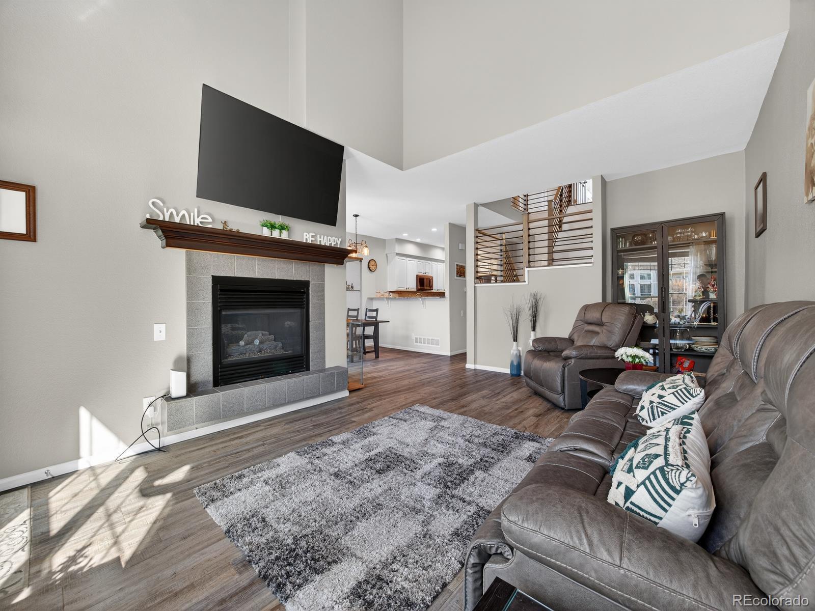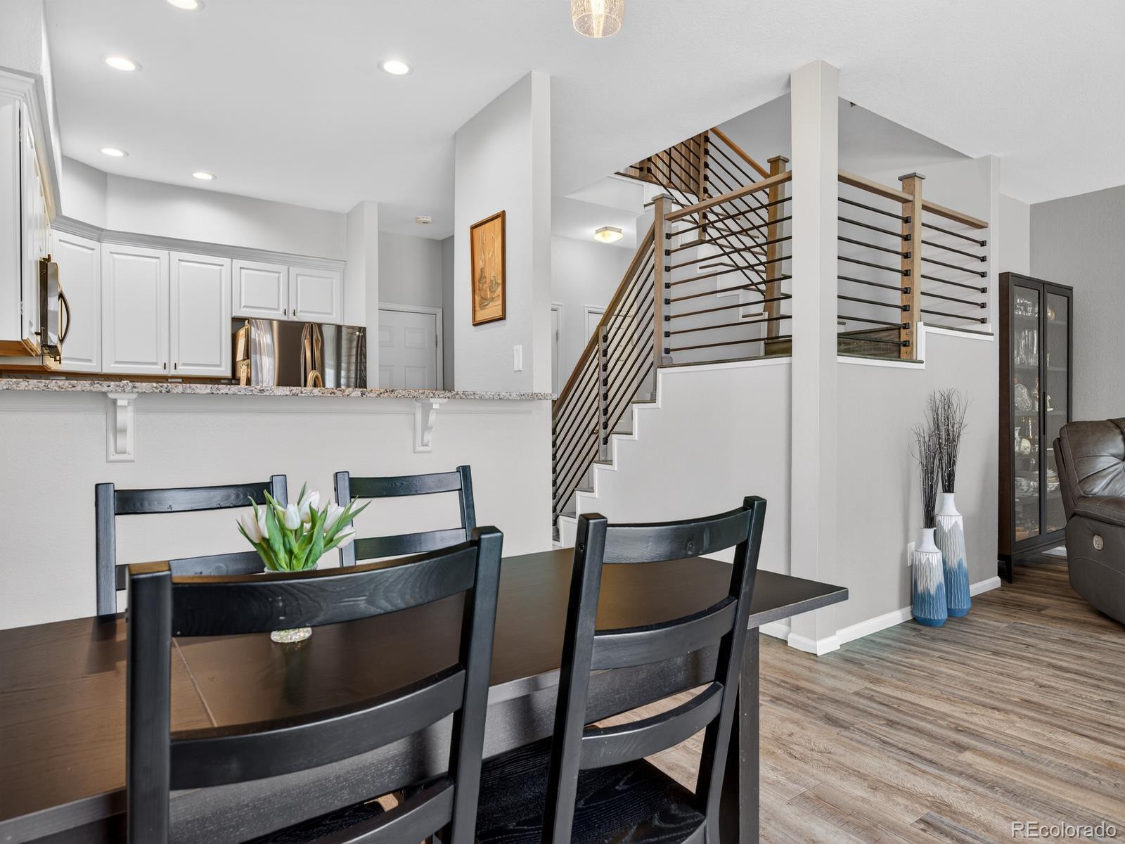 Welcome home to this light-filled Southpark townhome in Littleton!From the moment you step inside, you’ll be welcomed by soaring vaulted ceilings and an open, airy layout.Beautiful hardwood floors complement the cozy, tile-bordered fireplace, creating a warm and inviting living space.The bright kitchen features painted cabinetry, an updated backsplash, high counter seating, and a double oven—perfect for cooking and entertaining.The dining area opens to a private patio through sliding glass doors, ideal for relaxing or enjoying outdoor meals.Just off the kitchen is convenient access to the oversized garage with a spacious workbench for hobbies, crafting, or woodworking.The main level also includes a laundry area with built-in storage and a half bath with an updated vanity and faucet.Upstairs you’ll find two bedrooms, full bath and linen closet.In addition to the two bedrooms, the spacious primary suite overlooks the green space and offers a beautifully remodeled bathroom with tile flooring, tiled walk-in shower, double-sink vanity, and large walk-in closet.New carpet and paint throughout upstairs.The unfinished basement includes an egress window providing excellent potential for future living space.A radon mitigation system is already installed for peace of mind.Recent updates include: new roof, gutters, and downspouts (2024), a quiet Chamberlain garage door opener (2024), new lighting throughout, new patio railing, and fresh exterior paint (2025).An outdoor umbrella is included as well as TV mount over the fireplace.Enjoy an unbeatable location just minutes from Aspen Grove, Southwest Plaza, and charming Downtown Littleton, offering shopping, dining, and entertainment.With easy access to light rail, Santa Fe Drive, and C-470, commuting is effortless.Community amenities include a pool, clubhouse, tennis courts, and pickleball courts.This move-in-ready home offers comfort, convenience, and an exceptional location, don’t miss the opportunity to make it yours!