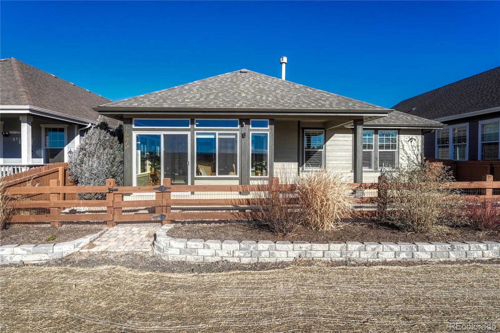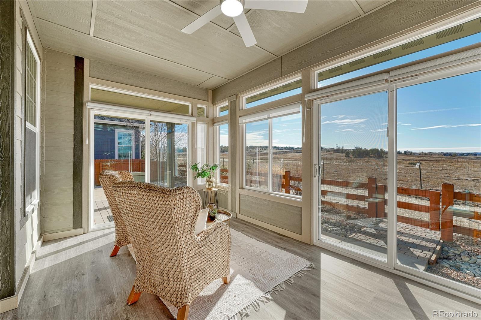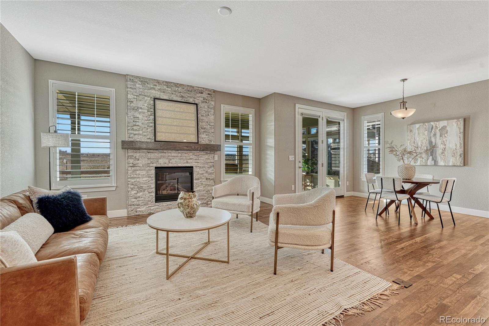 Welcome to your dream home in the highly desirable Pinery West neighborhood. This stunning low-maintenance ranch style home will impress from the moment you enter. Beautiful hardwood floors flow throughout this three-bedroom, three-bathroom home. The eat-in kitchen is the heart of the home with an oversized island, stainless steel appliances and warm granite countertops. The kitchen flows seamlessly into a cozy living room, featuring a gas fireplace and rustic mantle with hardwood floors and plantation shutters. The sun filled private primary suite boasts a large walk-in closet, and a , with dual sinks and walk in shower with upgraded tile throughout the bathroom. Two secondary bedrooms and full bathroom are situated on the opposite end of the home, ensuring maximum privacy. Directly off the living area is an enclosed lanai with lots of windows, electric, and electric shades which makes it perfect for year-round enjoyment. The Backyard was Professionally planned out to maximize your privacy. The home is nestled in Pinery West, a small, gated neighborhood. Very little maintenance is required, with the HOA that mows the front lawn, and removes snow from the driveway and sidewalks. A bike-golf path connects the neighborhood underneath Parker Road to the Pinery Country Club and all of the amenities it has to offer. 27 holes of golf, tennis, pools, restaurant and social events are minutes from the home. Access to Cherry Creekâs extensive walking-bike path is right outside your door, this location epitomizes Colorado living at its best. The neighborhood boasts a community park, dog park, and a gazebo for gatherings.