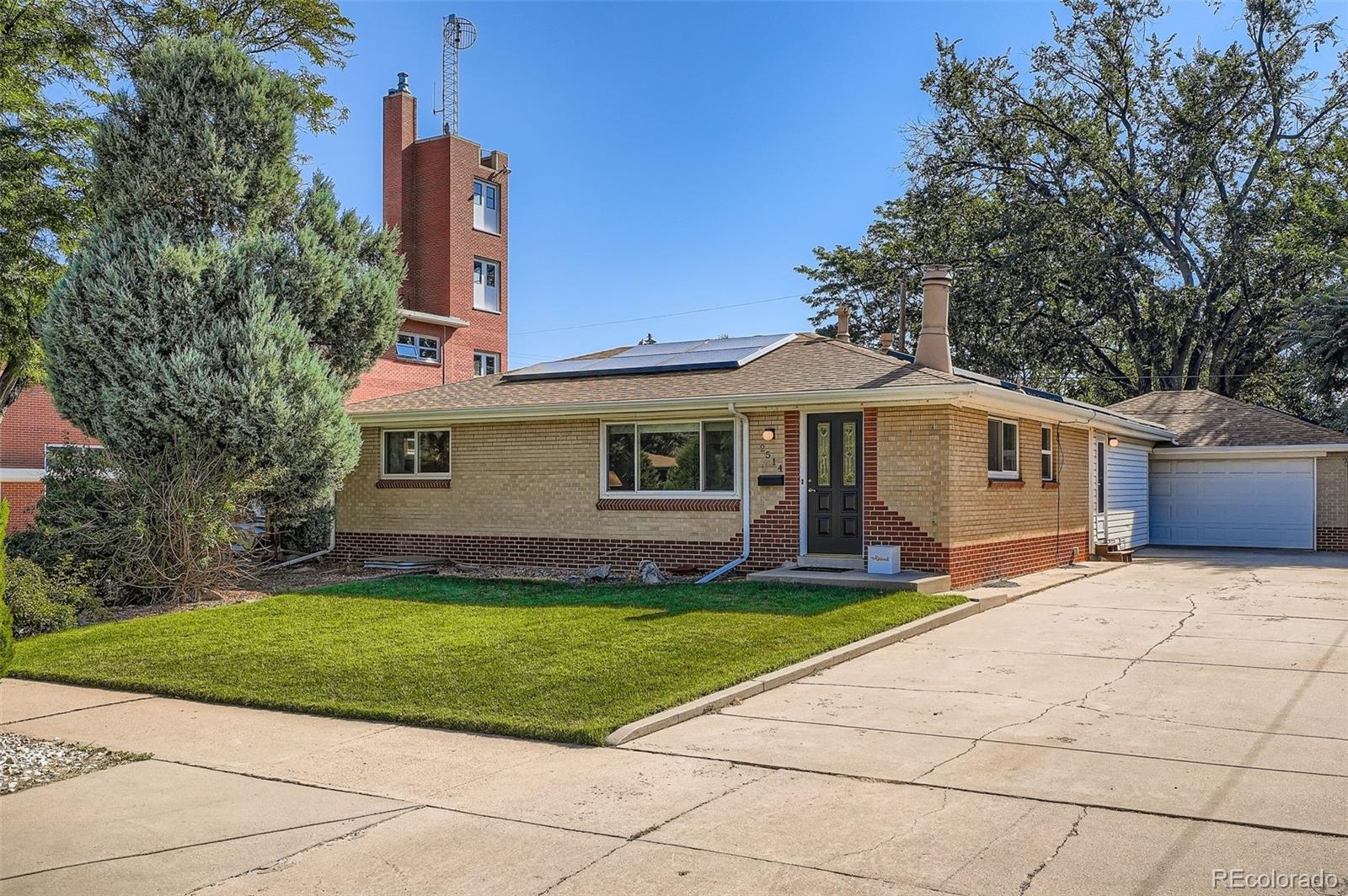 Stunning 4-bed, 2-bath mid-century ranch in desirable Harvey Park. This gorgeous brick home combines original charm with thoughtful updates, including a renovated kitchen with white Mid-Continental cabinetry, black pearl leathered granite countertops, Italian subway tile backsplash, floating shelves, and stainless steel appliances. The main floor features 3 bedrooms and a full bath with an updated floating vanity. Other highlights include oak plank flooring, recessed lighting, a coffered ceiling in the dining room, and newer Anderson windows upstairs. The spacious lower-level primary suite boasts built-in nightstands, French doors, crown molding, and a custom bath with a walk-in shower, double floating vanity, and ample closet space. The lower level also includes a large living area with new carpet, a wood-burning stove, and a bonus area with LVP, perfect for an office or home gym, plus a newly remodeled laundry room with shelving, cabinets, and a utility sink. Additional updates include custom paint, doors, trim, updated electrical, plumbing, newer roof/gutters, sewer line, radon mitigation system, and a new AC. Tesla solar panels (7.15kW system) with a power wall provide significant energy efficiency and savings. The large 2.5-car garage offers ample storage with a full attic. Enjoy a great backyard with a newly painted pergola, perfect for outdoor living! Conveniently located with easy access to major highways, parks, shopping, dining, and enjoying the benefits of living next to the fire station with great neighbors who respect quiet hours—no lights and sirens at night!