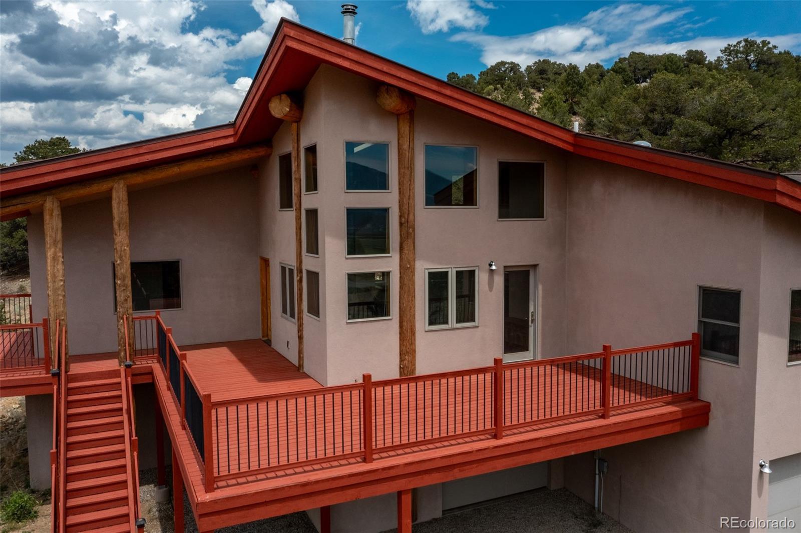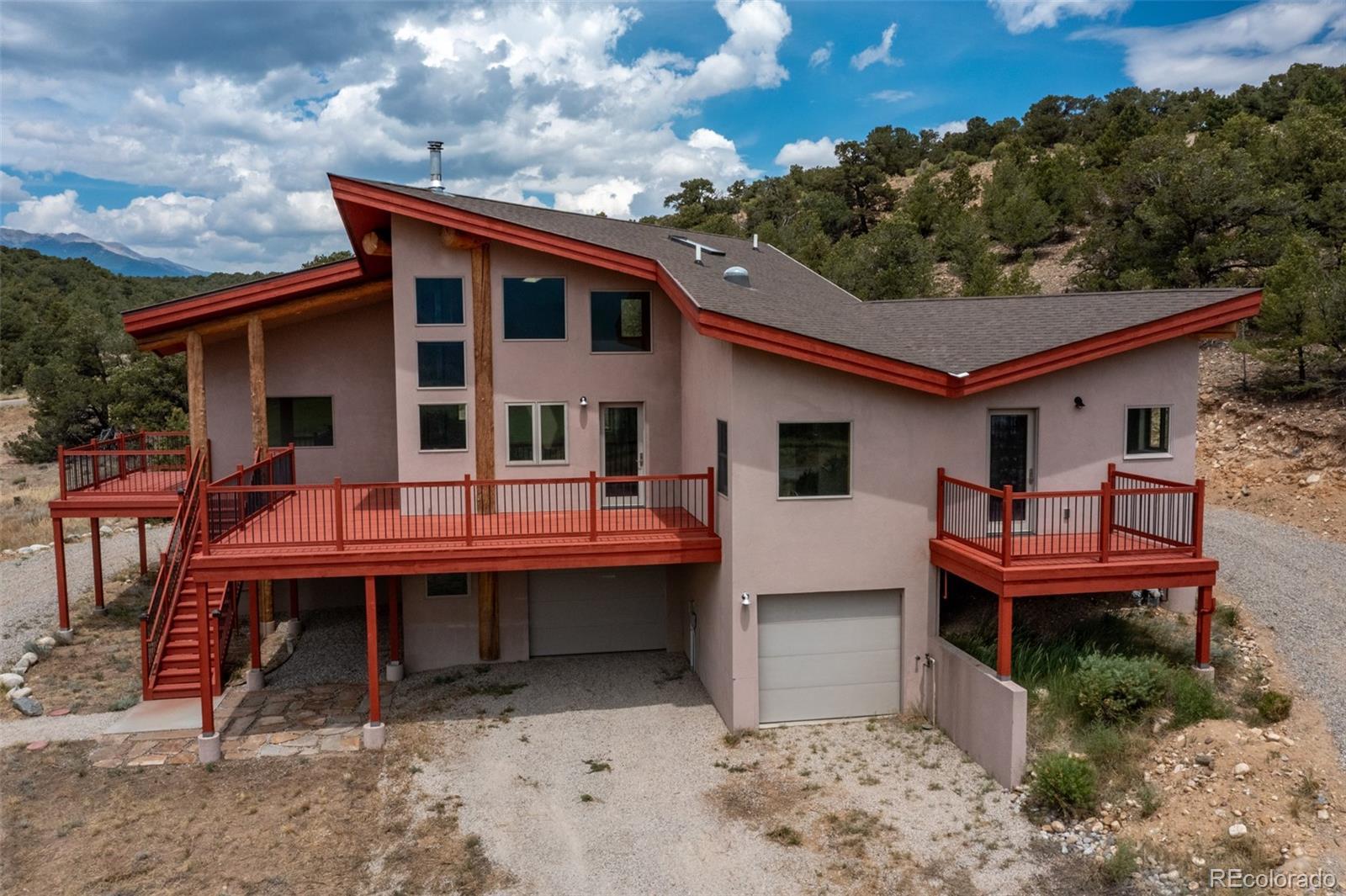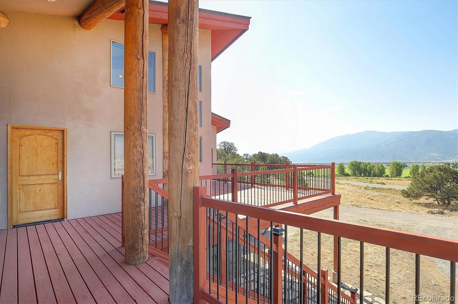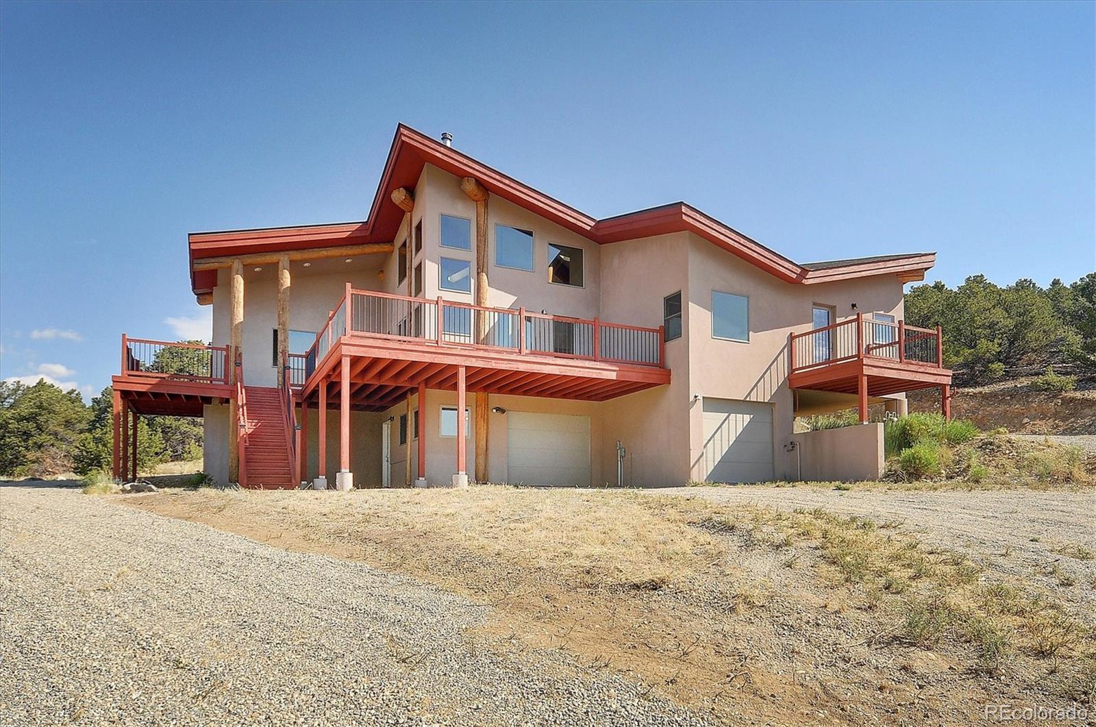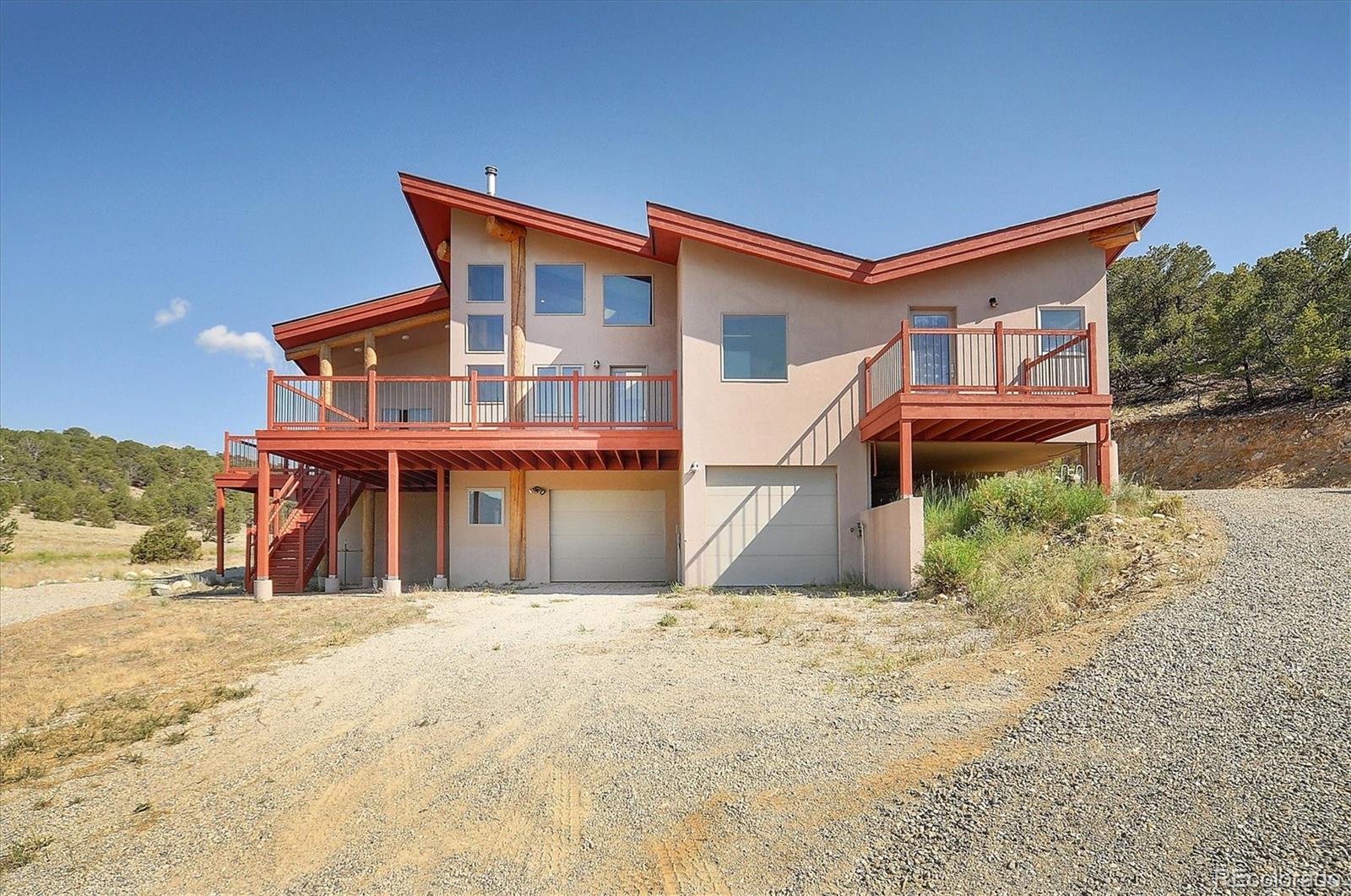 Looking for a home that blends architectural character, abundant natural light, and breathtaking views - all just outside of town? This unique property may be exactly what you've been waiting for. Crafted with distinctive design elements, including striking log accents, vaulted ceilings, and expansive windows, this home invites you in with warmth and style. The open-concept floor plan includes a bright and functional kitchen that will delight any home chef, featuring a Jenn-Air cooktop, built-in wall oven, bar seating, and even a convenient desk area. Upstairs, a spacious loft with its own half bath offers a perfect retreat for a home office, workout space, or creative studio. Both bedrooms boast en suite bathrooms, including a luxurious primary suite with a jetted soaking tub and a stunning walk-in glass shower. Step outside onto more than 700 square feet of wraparound decking, ideal for relaxing or entertaining, while soaking in panoramic views. As an added bonus, the property borders more than 5 acres of HOA-protected open space, including an irrigation ditch, ensuring unobstructed views and permanent privacy - this land cannot be developed. Additional highlights include: in-floor radiant heat throughout, plus a wood-burning stove for cozy ambiance. Oversized two-stall attached garage with plenty of room for recreational gear. A thoughtfully extended driveway that wraps around the back of the home to an added rear entrance for single-level access and easier grocery unloading. On-demand water heaters, natural gas, and a mechanical room conveniently located off the garage. The well permits irrigation for up to 1,400 square feet of lawn or garden — ideal for adding landscaping or keep it naturally low-maintenance. Don't miss your chance to experience this one-of-a-kind home with peace, privacy, and amazing scenery all just a short drive from town. Click through the 3D Tour to explore the layout, then call to schedule your private showing!