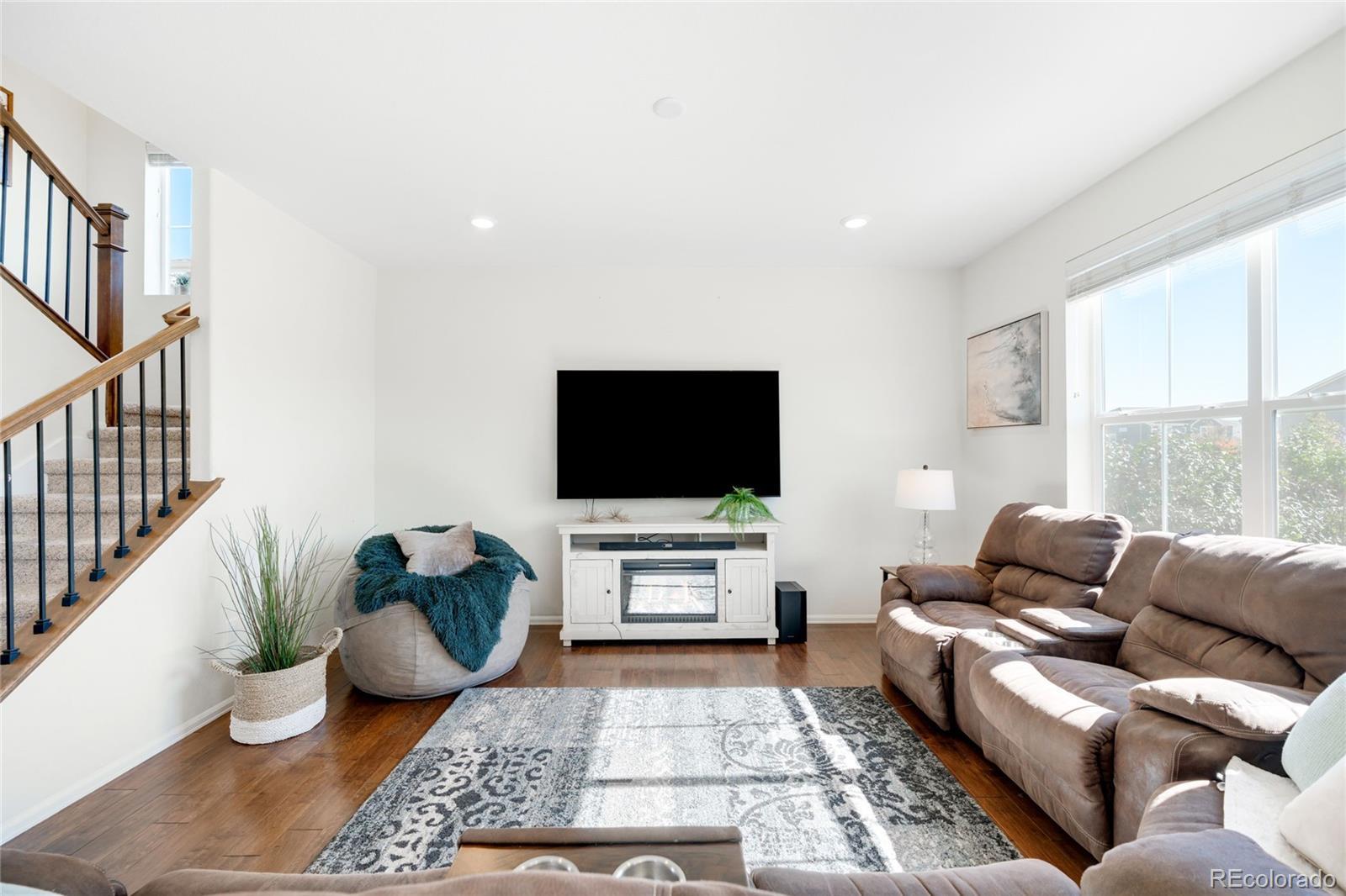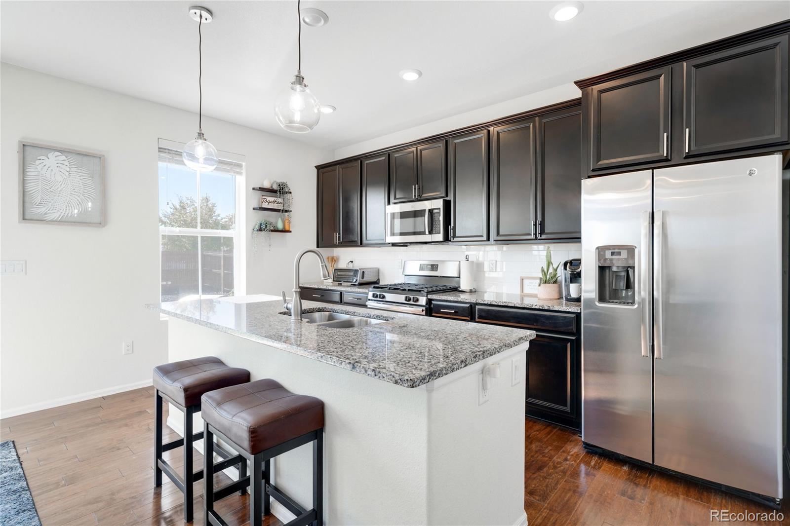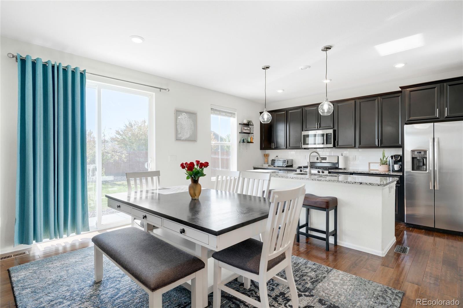 Impeccably maintained and move-in ready, this STUNNING Orchard Farms residence blends modern details with classic design in one of Thornton’s most coveted neighborhoods. Gleaming hardwood floors extend throughout the main level creating a cohesive and seamless open floor plan which connects the bright living area to a gourmet kitchen adorned with sleek granite countertops, subway tile backsplash, stainless steel appliances, a large island and a walk-in pantry. Three bedrooms await upstairs, including the spacious primary suite featuring a serene master bathroom w/ a walk-in shower as well as a substantial walk in closet. The oversized laundry room is a blank canvas and ready for you to create an organized dream space that is already complete w/ a washer and dryer set for added convenience. Outdoors, the huge EXTENDED patio and meticulously manicured backyard space will greet you and your guests with open arms and invite you to relax and enjoy the Colorado sunshine. Ample storage is found in a two-car attached garage and additional highlights include solar energy, QUICK AND CONVENIENT ACCESS to I-25, all shopping amenities, restaurants, E-470, and the beautiful nearby parks with basketball and tennis courts — The PERFECT blend of style, sustainability, and location.