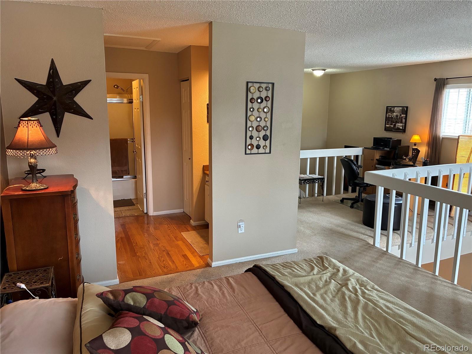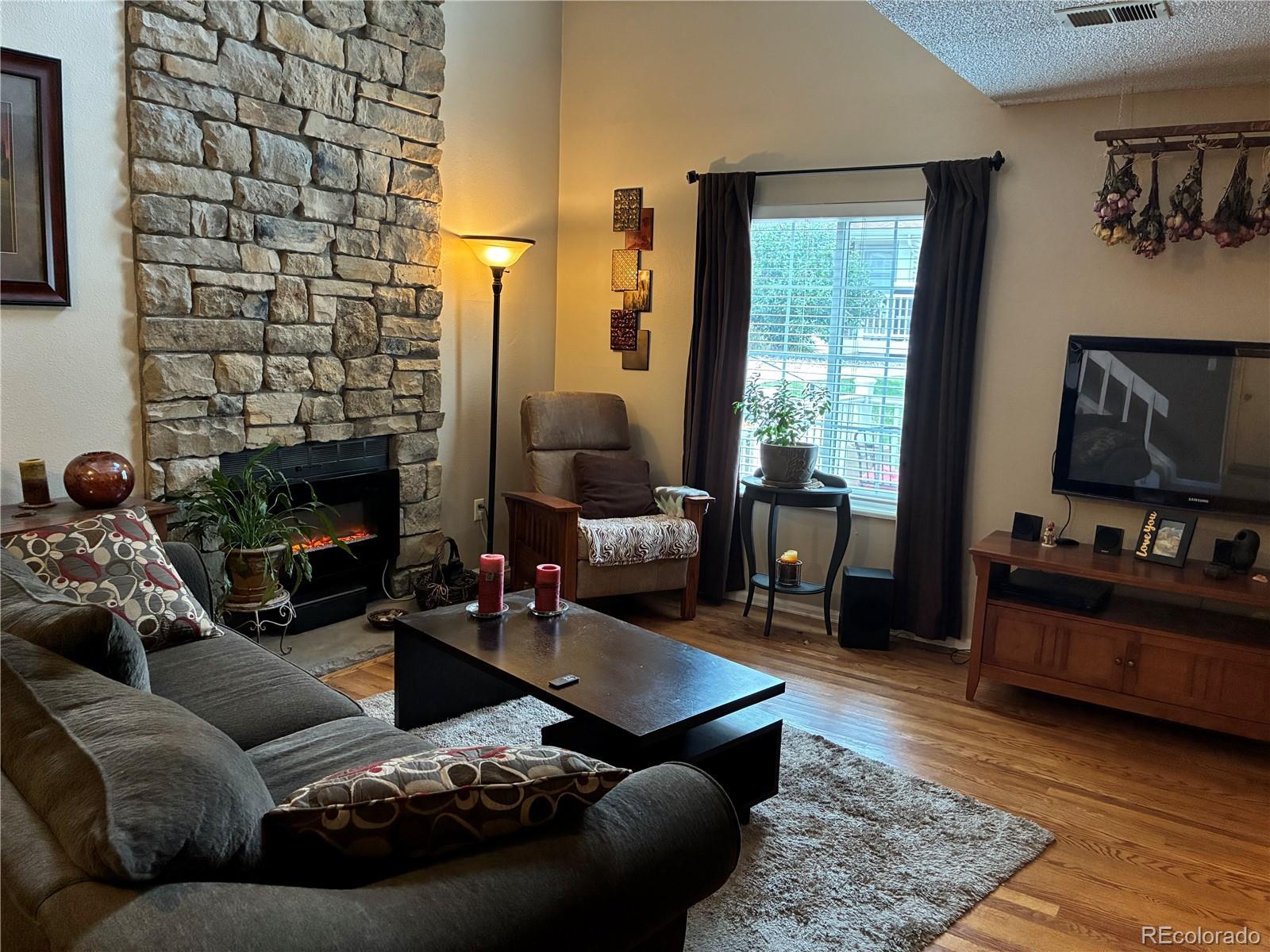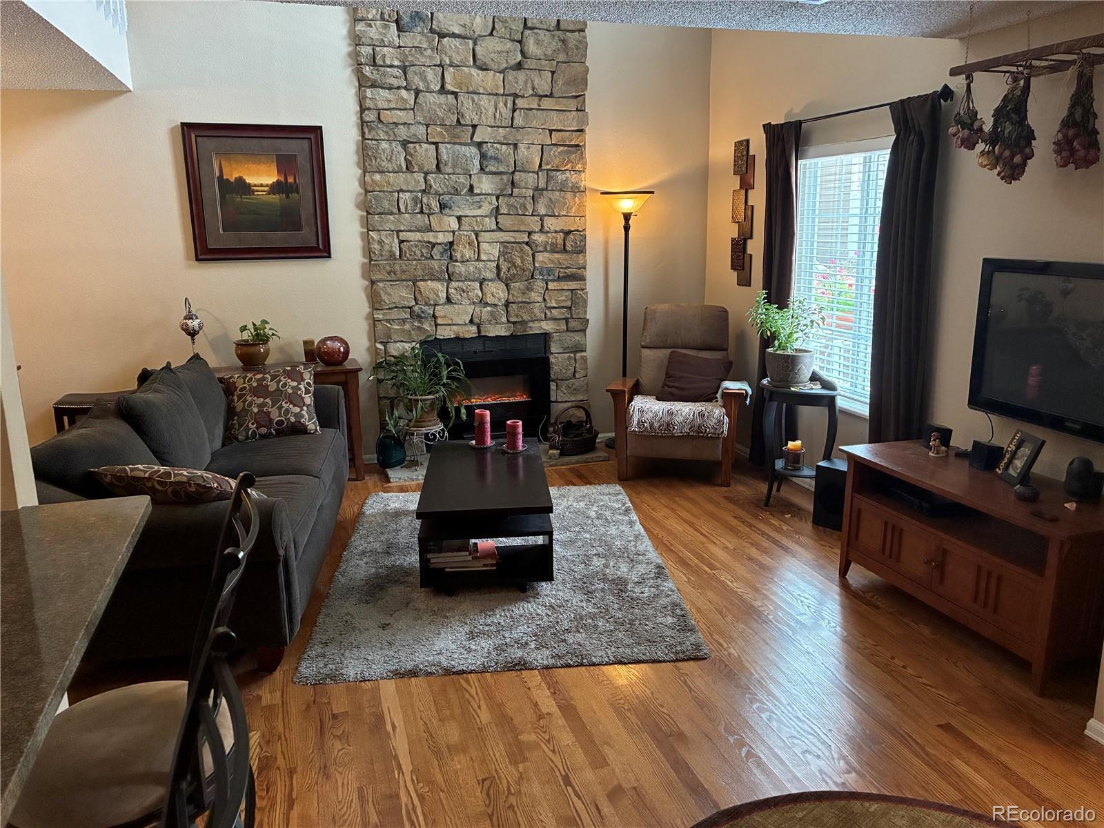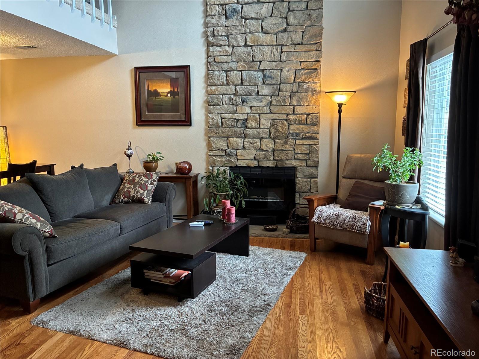 Rare one bedroom/loft with one car attached garage in prime Timber Cove location. Open and vaulted unit with beautiful hardwood flooring throughout main level. Impressive great room showcases large windows, and a stone wood burning fireplace. Quartz counters, stainless steel appliances, warm dark wood cabinets, and an eat up counter emphasizes the galley kitchen. Half bath and stackable washer/dryer with access to garage completes the main level. Open loft and bedroom on second floor overlooks the great room below with an attached full bathroom. Loft could be used as an office or sitting area. Private fenced deck overlooks common area with lots of trees. 5X6 storage room with work bench in garage. Hot water heater and dishwasher installed in 2025. Close to Standley Lake, walking trails, shopping, and restaurants.