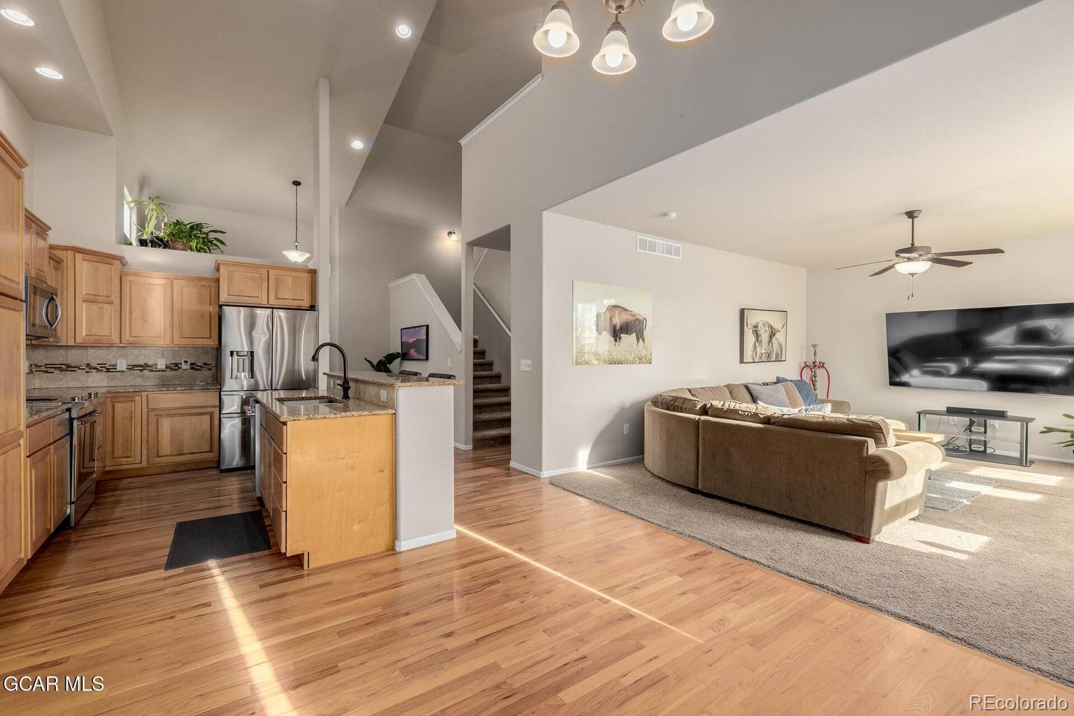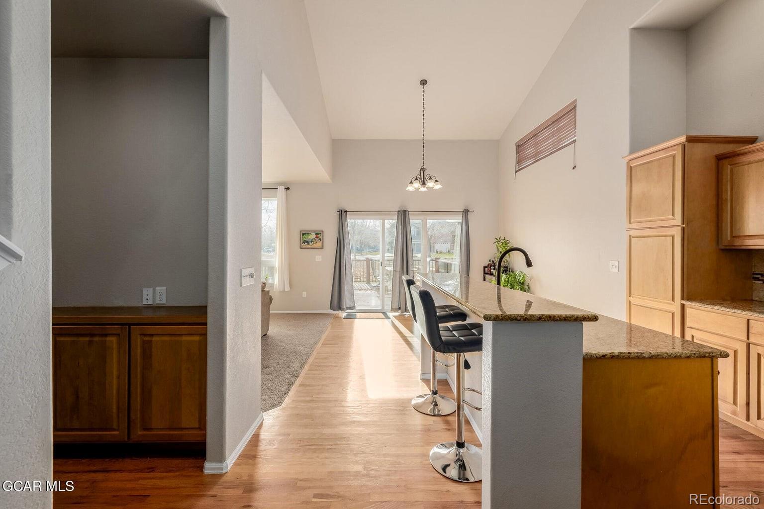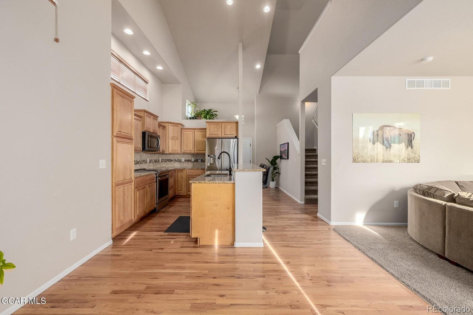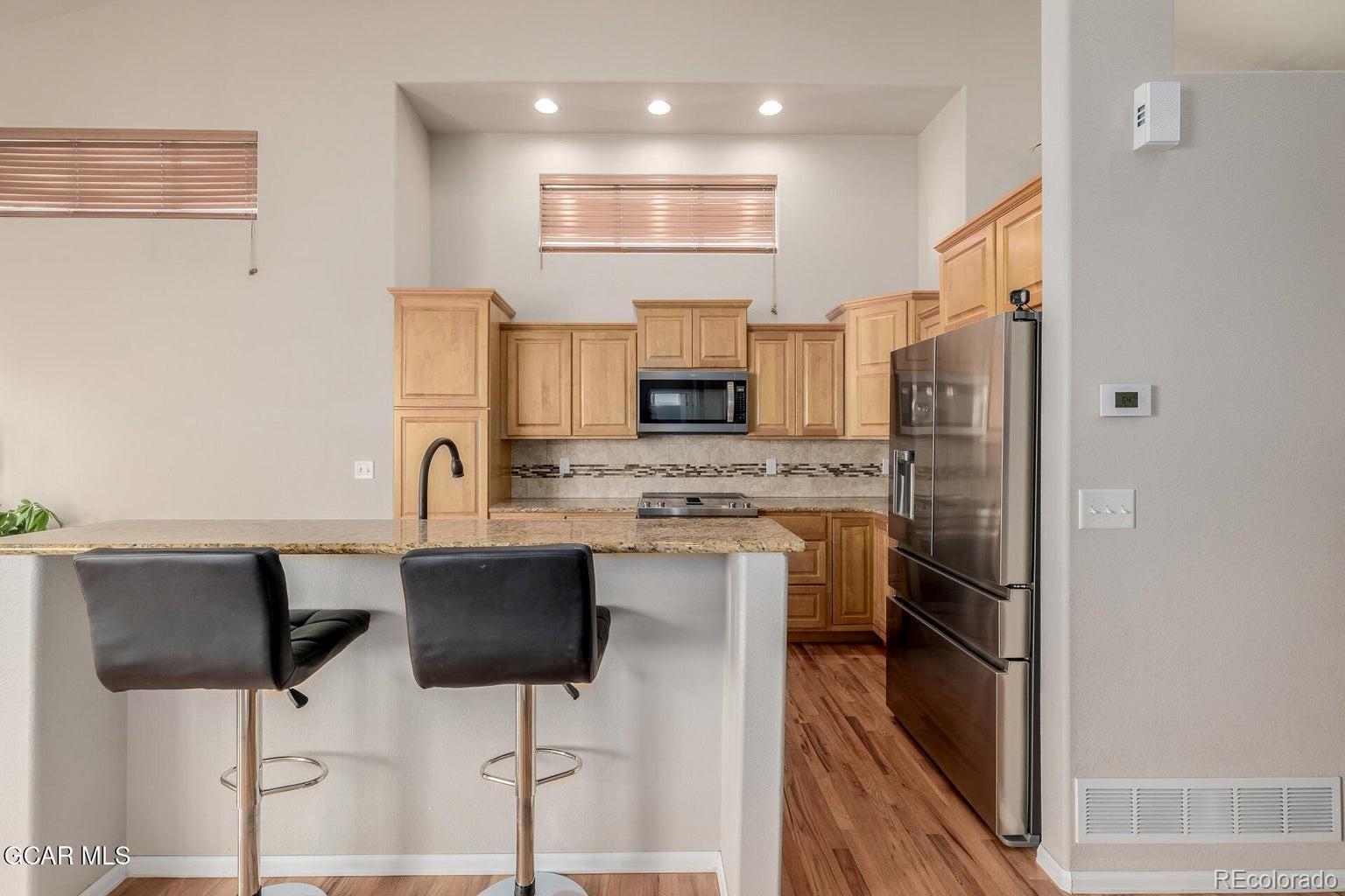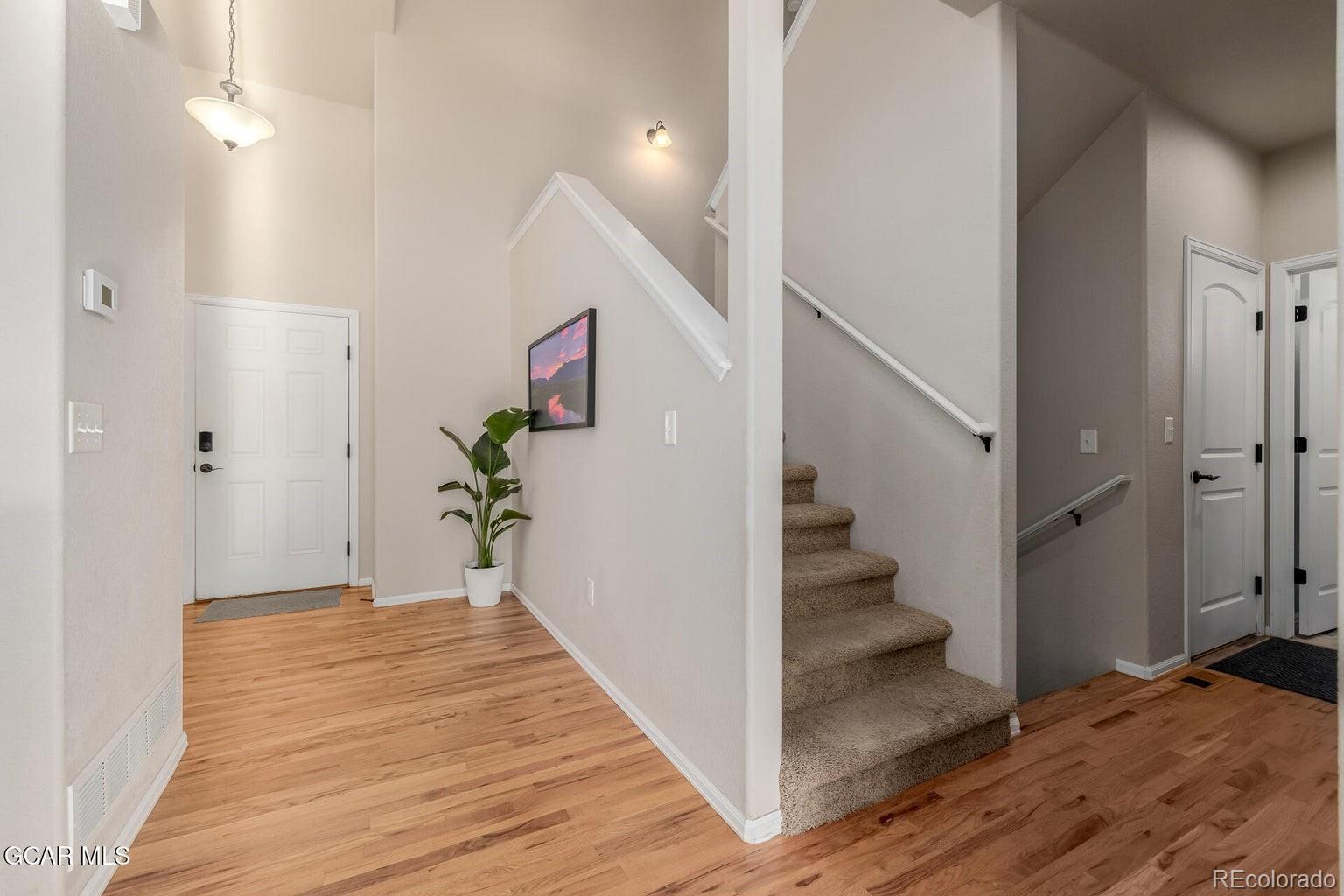 The search is finally over! This beautiful 3-bedroom home nestled on a corner lot is the one! The facade offers a 2-car garage, stone accents, and a welcoming front porch. The large great room has sliding glass doors that seamlessly blend the indoor experience with the outdoors. Wood flooring, granite countertops, vaulted ceilings, abundant natural light, and neutral tone are worth mentioning. The kitchen comes with recessed lighting, tile backsplash, ample cabinet space, new stainless-steel appliances, granite counters, and a prep island with a breakfast bar. Home has new roof, new paint, gorgeous landscaping and unfinished basement. Impeccable primary bedroom offers plush carpet, an ensuite with dual sinks, and a walk-in closet. Tranquility awaits in the large backyard that backs to open space. You will love the location and is adjacent to nearby walking and hiking trails. Easy access to schools, nearby shopping and is close to I-25. This convenient location is nearby a handful of parks and 10 minute drive to mountains.