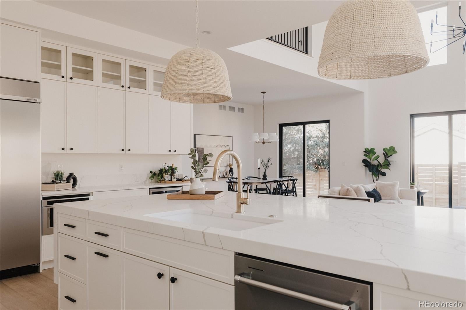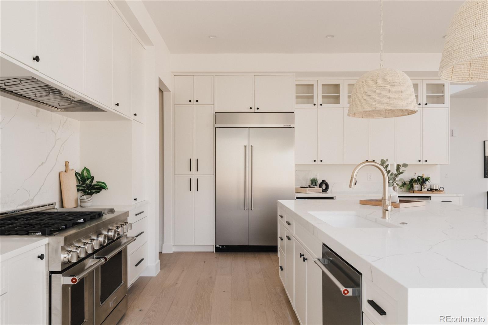 Experience elevated living in this stunning ~4,400 sq. ft. modern single-family home adjacent to Panorama Park. Designed for comfort and style, this 5-bedroom + office, 5-bath residence blends open-concept luxury with thoughtful details throughout. Step into a grand living area featuring 20-foot vaulted ceilings, a central fireplace, and expansive windows that fill the home with natural light. The chef’s eat-in kitchen is an entertainer’s dream, boasting professional-grade appliances, a 48" range with double ovens, a built-in 48" refrigerator, and a custom walk-in pantry. Upstairs, the XL primary suite offers a serene retreat with dual showers in the master bath, a freestanding soaking tub, two vanities, and a large walk-in closet with custom built-ins. Vaulted ceilings continue into the secondary bedrooms, adding to the home’s airy feel. The finished basement is perfect for recreation and entertaining, featuring a spacious rec room and a built-in wet bar. Dual furnaces and AC systems ensure year-round comfort with zoned temperature control. Located just minutes from Downtown Denver, this home combines modern luxury, functional design, and unbeatable convenience—right next to a beautiful park.