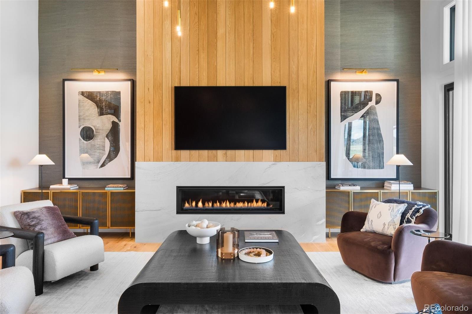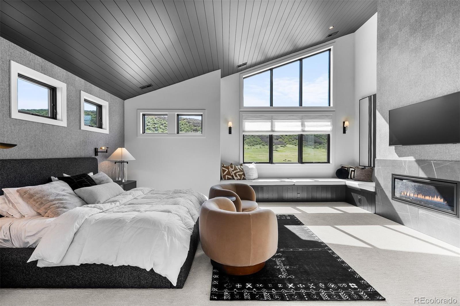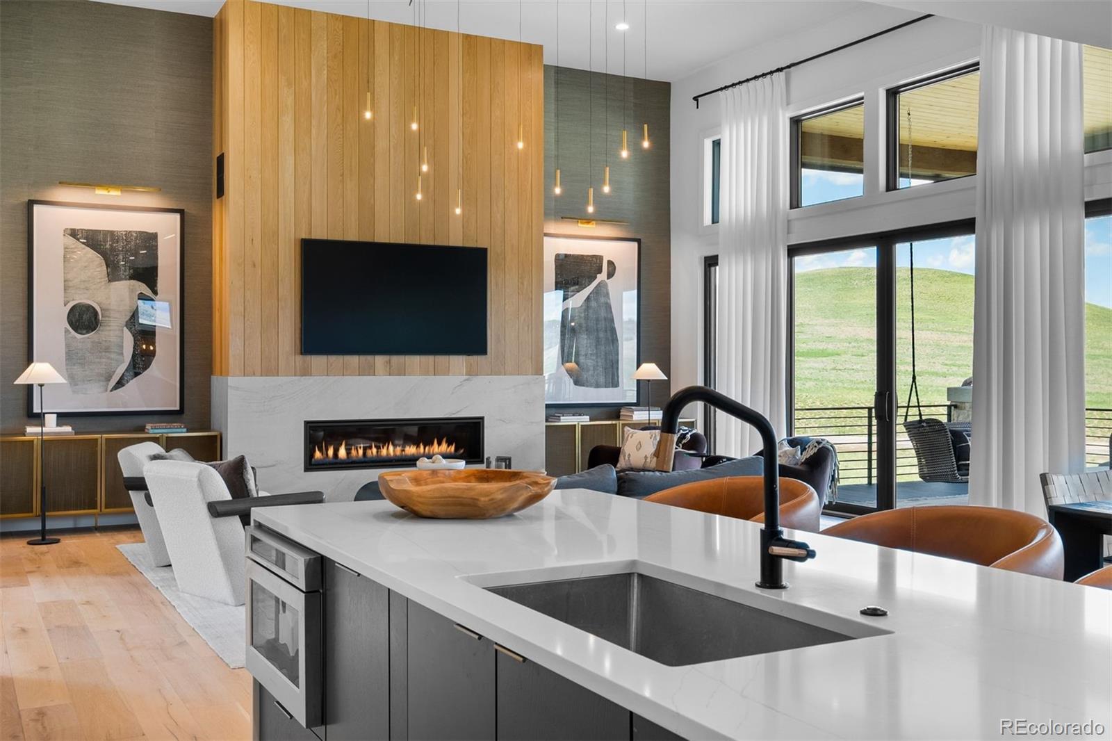 Inside, wide-plank white oak floors stretch across the main level, flowing through open spaces grounded by clean lines and elevated finishes. A floating open-riser staircase with horizontal iron railings sets the tone in the entry, while large windows bring in ever-changing light. The great room features 13-foot ceilings, a modern chandelier, and a fireplace that acts as both anchor and art piece—wrapped in marble and framed by white oak tongue-and-groove. The kitchen continues the visual story with white oak floor-to-ceiling cabinetry, a quartz waterfall island, and top-tier Monogram appliances. Two sliding doors extend the living space to a full-length covered deck that captures morning sun and quiet evenings alike. The primary suite is a retreat in every sense. A double-door entry leads to a vaulted ceiling with tongue-and-groove detail, a cozy fireplace with modern tile and wallpaper accents, and an L-shaped window bench that perfectly frames the views. Dual walk-in closets with built-ins offer generous storage, while the spa-worthy bath includes a freestanding tub, frameless shower with multiple heads, and dual floating marble vanities. On the lower level, the recreation room continues the home’s thoughtful design with the same marble-and-oak fireplace, space for a game table, and a sleek wet bar with open shelving and a drink fridge. Sliding doors open to a covered patio and grassy lawn. The exercise room keeps energy high with wood floors, mirrored walls, and built-in speakers. A playful kids’ zone with a built-in fort and Dutch door adds charm, while guest quarters and storage rooms bring comfort and function full circle. Located 25 minutes from downtown Castle Rock and with easy access to both Denver and Colorado Springs. Some homes are beautiful. Others are bold. This one gets it just right.