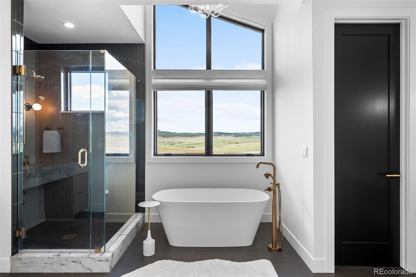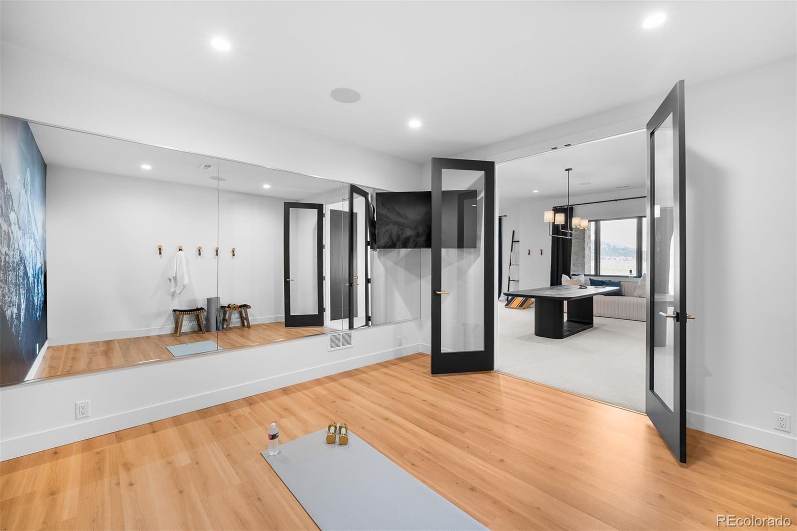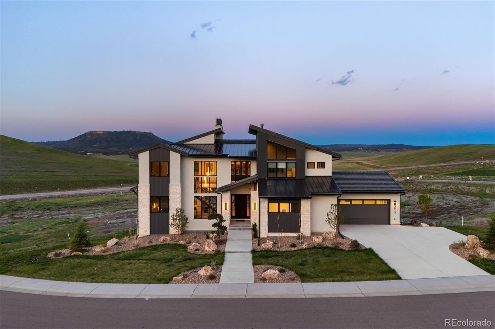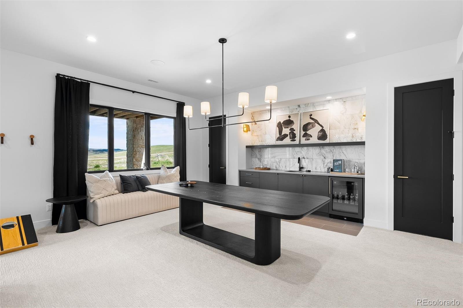 Inside, wide-plank white oak floors stretch across the main level, flowing through open spaces grounded by clean lines and elevated finishes. A floating open-riser staircase with horizontal iron railings sets the tone in the entry, while large windows bring in ever-changing light. The great room features 13-foot ceilings, a modern chandelier, and a fireplace that acts as both anchor and art piece—wrapped in marble and framed by white oak tongue-and-groove. The kitchen continues the visual story with white oak floor-to-ceiling cabinetry, a quartz waterfall island, and top-tier Monogram appliances. Two sliding doors extend the living space to a full-length covered deck that captures morning sun and quiet evenings alike. The primary suite is a retreat in every sense. A double-door entry leads to a vaulted ceiling with tongue-and-groove detail, a cozy fireplace with modern tile and wallpaper accents, and an L-shaped window bench that perfectly frames the views. Dual walk-in closets with built-ins offer generous storage, while the spa-worthy bath includes a freestanding tub, frameless shower with multiple heads, and dual floating marble vanities. On the lower level, the recreation room continues the home’s thoughtful design with the same marble-and-oak fireplace, space for a game table, and a sleek wet bar with open shelving and a drink fridge. Sliding doors open to a covered patio and grassy lawn. The exercise room keeps energy high with wood floors, mirrored walls, and built-in speakers. A playful kids’ zone with a built-in fort and Dutch door adds charm, while guest quarters and storage rooms bring comfort and function full circle. Located 25 minutes from downtown Castle Rock and with easy access to both Denver and Colorado Springs. Some homes are beautiful. Others are bold. This one gets it just right.