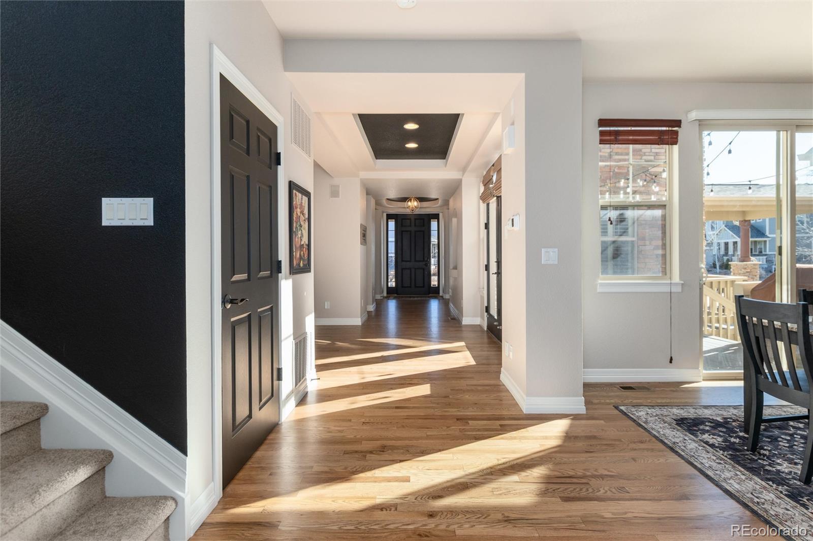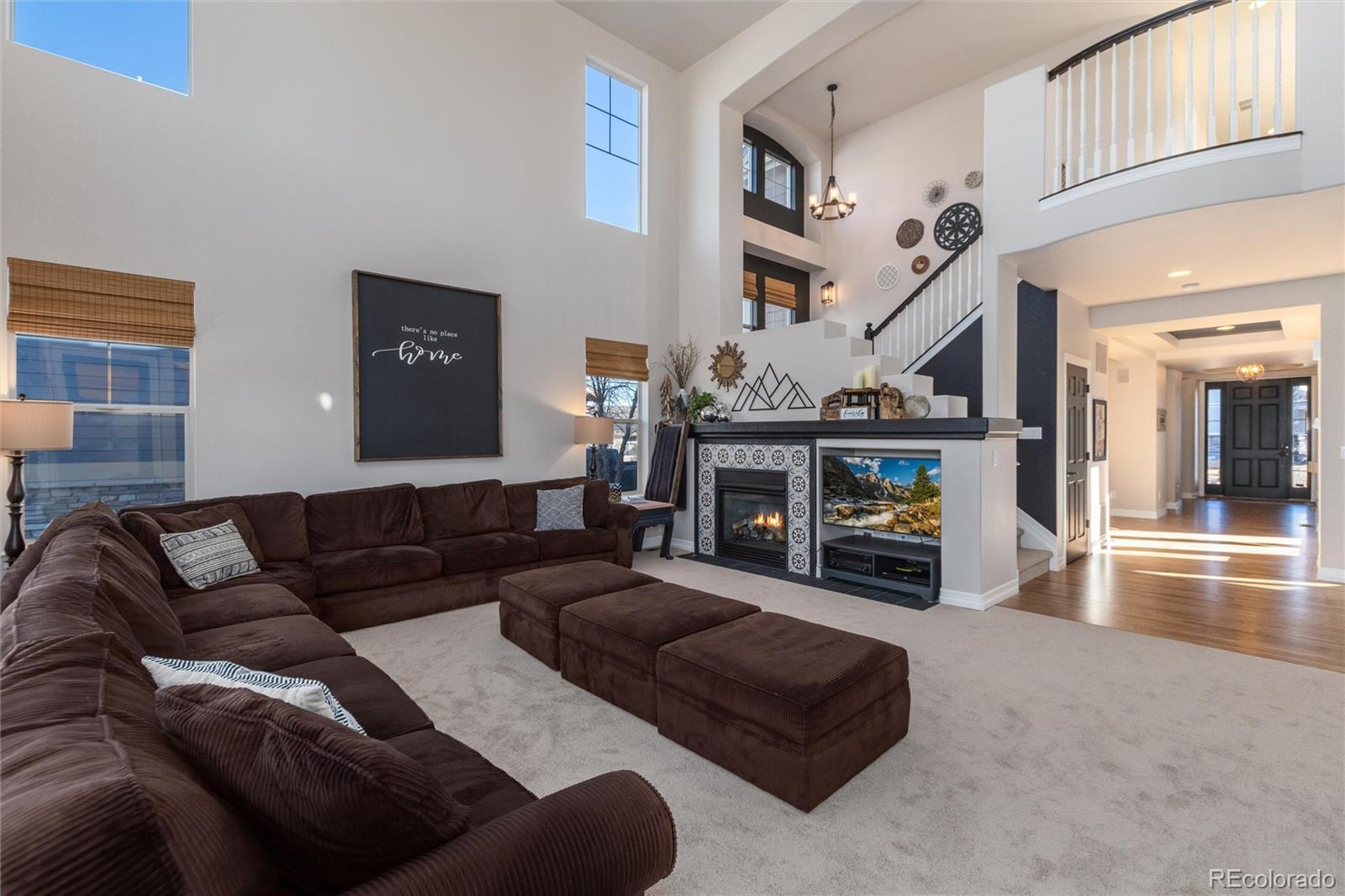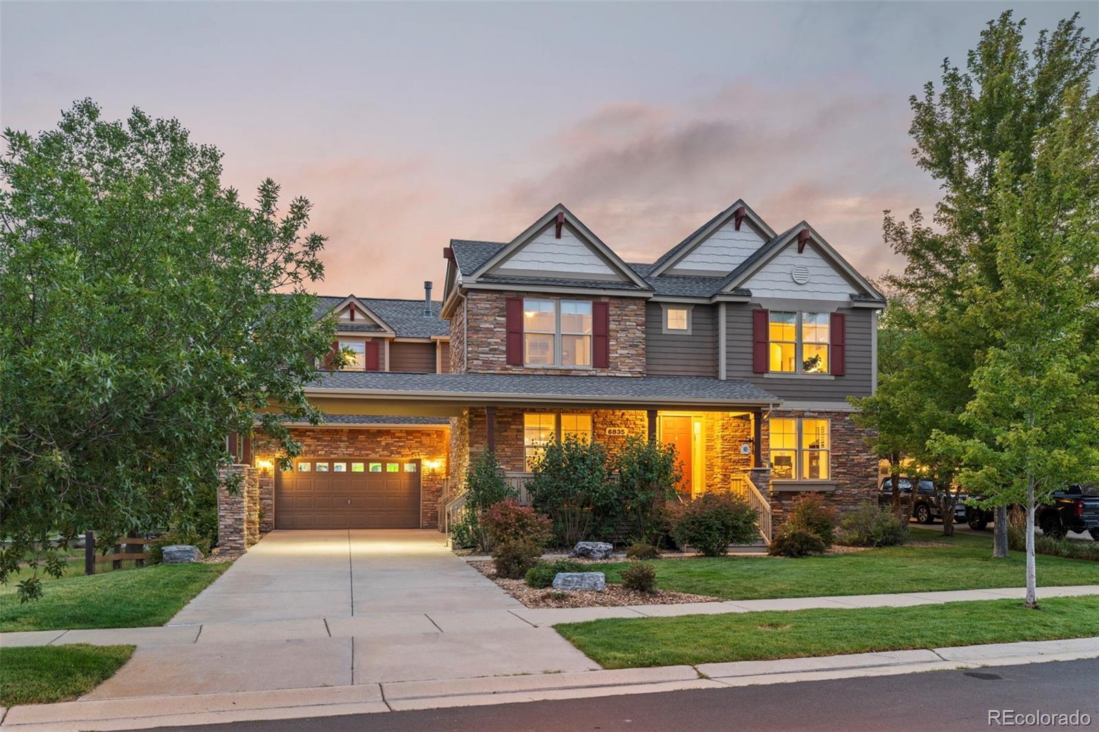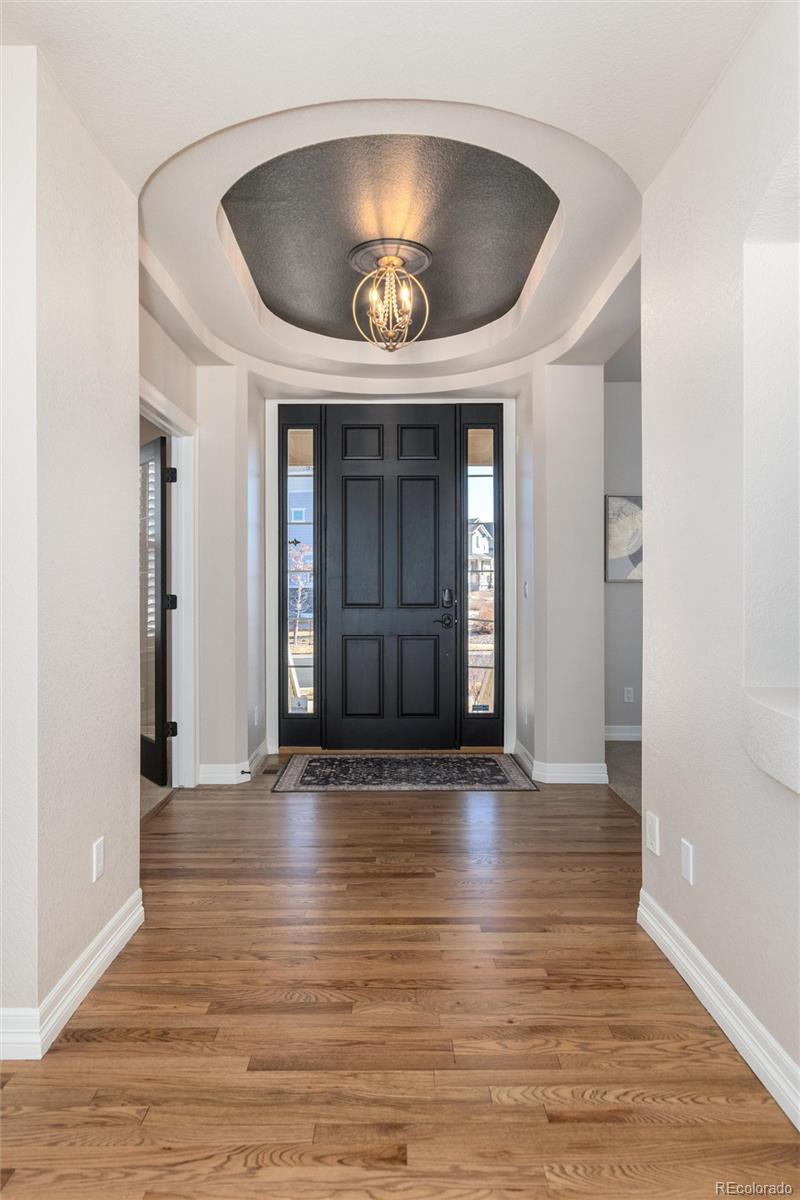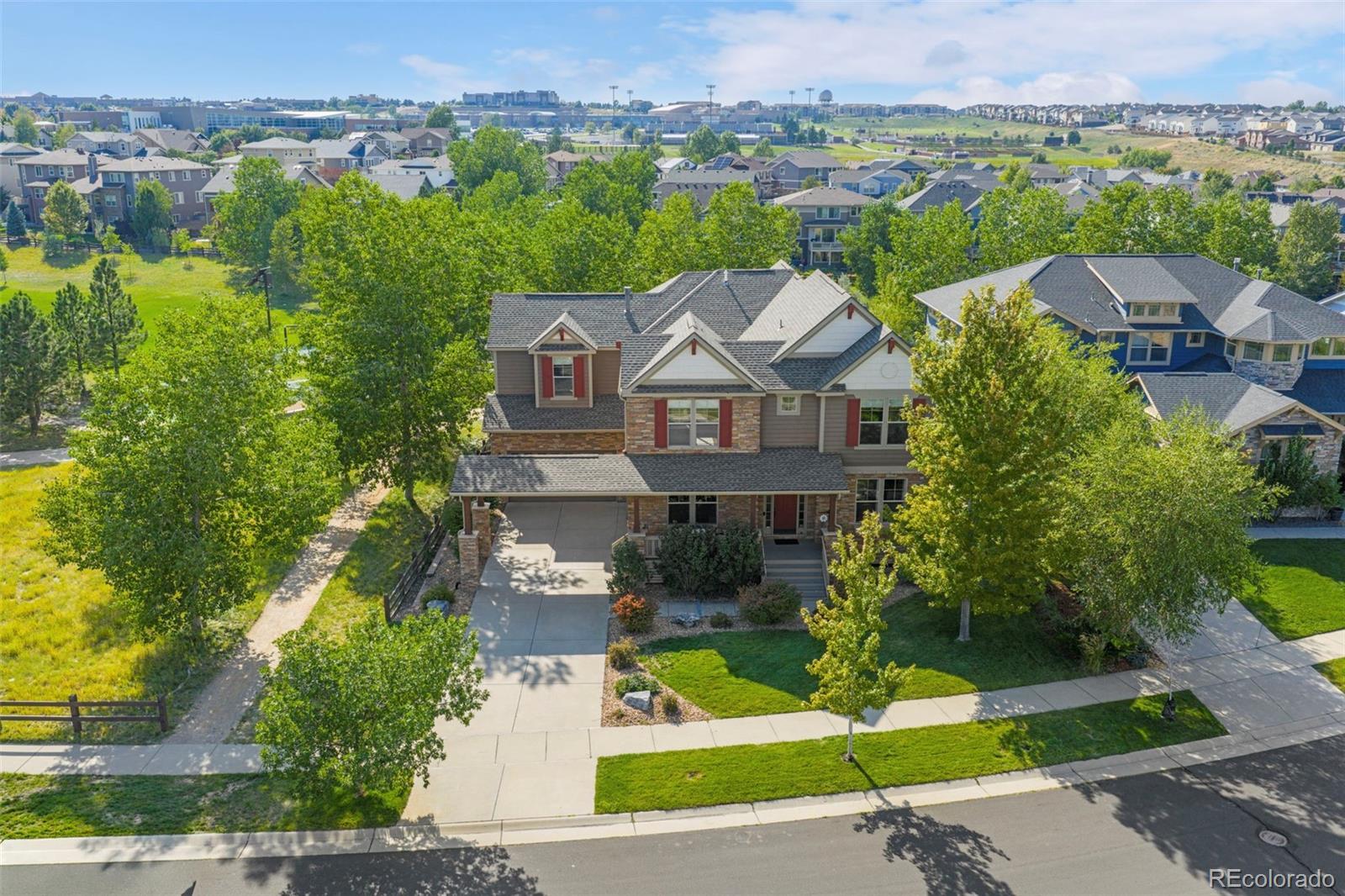 Discover a truly one-of-a-kind home with unparalleled character in the heart of Southshore, one of only two floorplans like this in the entire community! Offering over 5,300 sqft, this remarkable residence blends character with comfort on a large 1/4 acre private lot that backs and sides to green space, parks and peaceful waterfall. Elegant refinished hardwood flooring and a grand foyer opens this home to a functional floor plan. A private main floor office with dual glass doors is located just off the entry and across from a formal den, which could also serve as a perfect second home office-if needed. The hardwood flooring flows throughout the main floor including the formal dining room and updated dine in kitchen with gorgeous refaced cabinets and stainless steel appliances including double ovens for Holiday meals. Off the kitchen is one of three outdoor living spaces with a courtyard-like patio; perfect to enjoy a glass of wine, or cup of coffee. The main floor living room showcases high ceilings, an updated gas fireplace and brand new carpet. Upstairs features four bedrooms including the incredibly private primary suite, which showcases updated laminate flooring set against a second fireplace and is accessed by a private hallway completely separate from the rest of the upstairs. Laminate flooring continues with two additional bedrooms, which share a Jack and Jill bath, while a third bedroom enjoys a full bathroom of it's own. The finished basement offers plenty of space for movies, sleepovers and gaming with a living room with third fireplace, bonus room and an additional bedroom with bath perfect for guests. Located within walking distance to elementary, middle and high schools in the Cherry Creek School District. Southshore is the only community in all of SE Aurora with two private clubhouses, two private fitness facilities, multiple pools, a private dog park, trails and access to the Aurora Reservoir for paddle boarding, biking, fishing and a swim beach.
