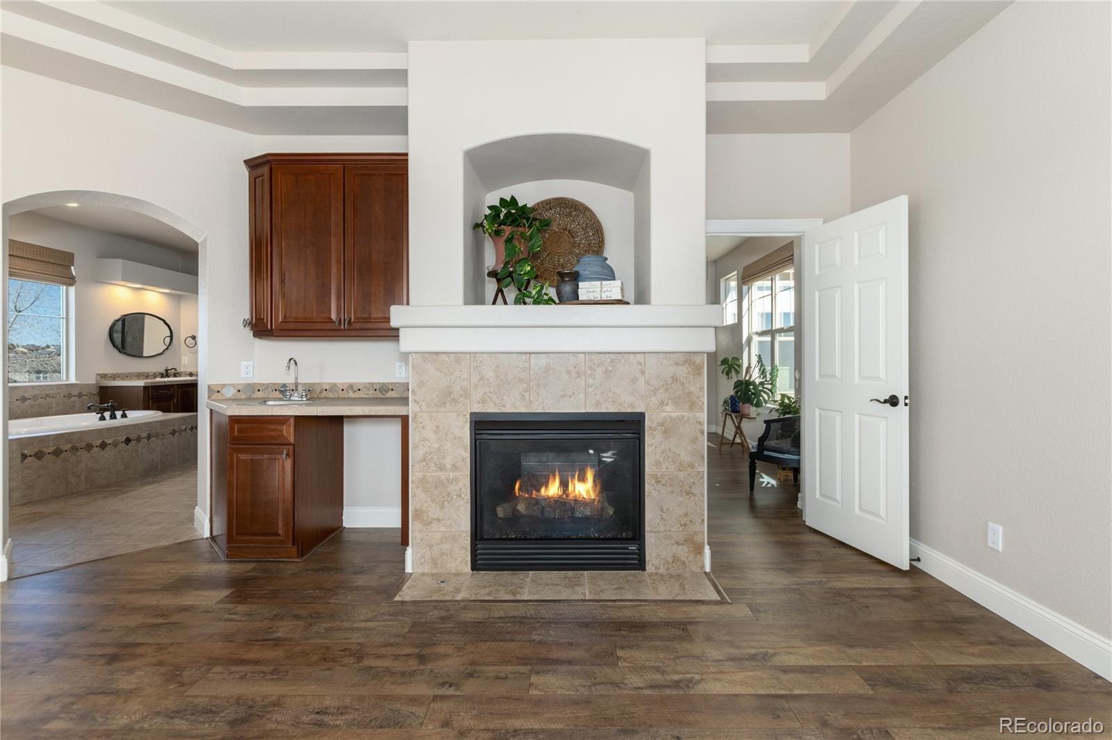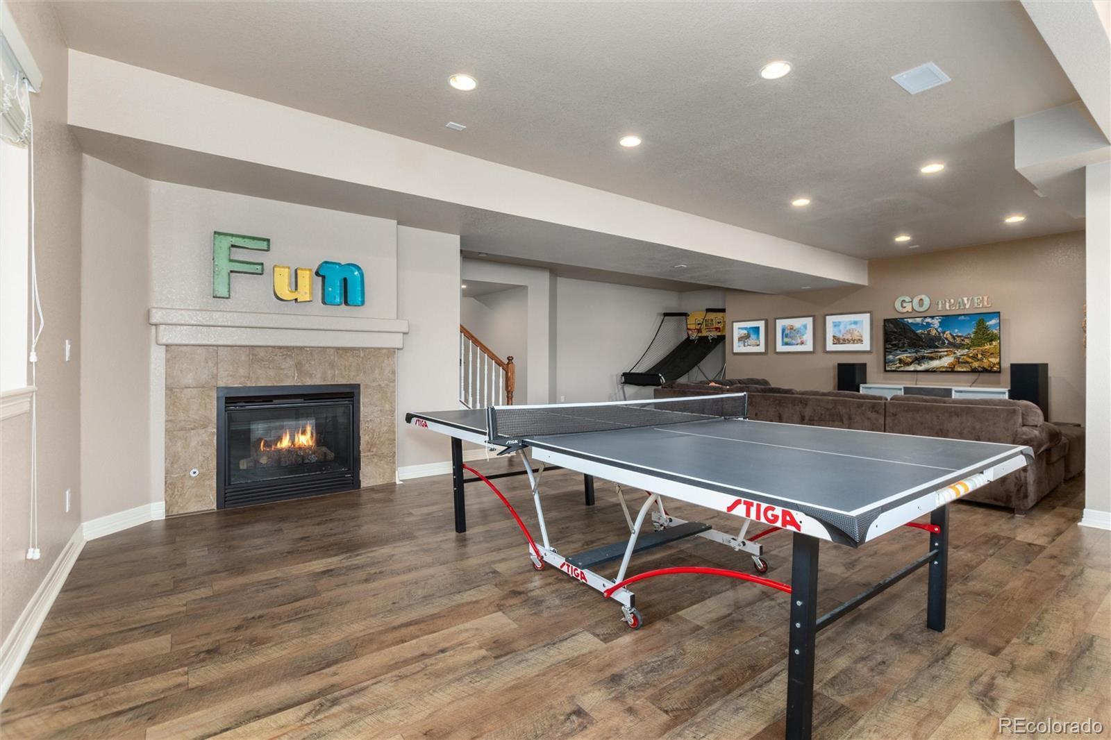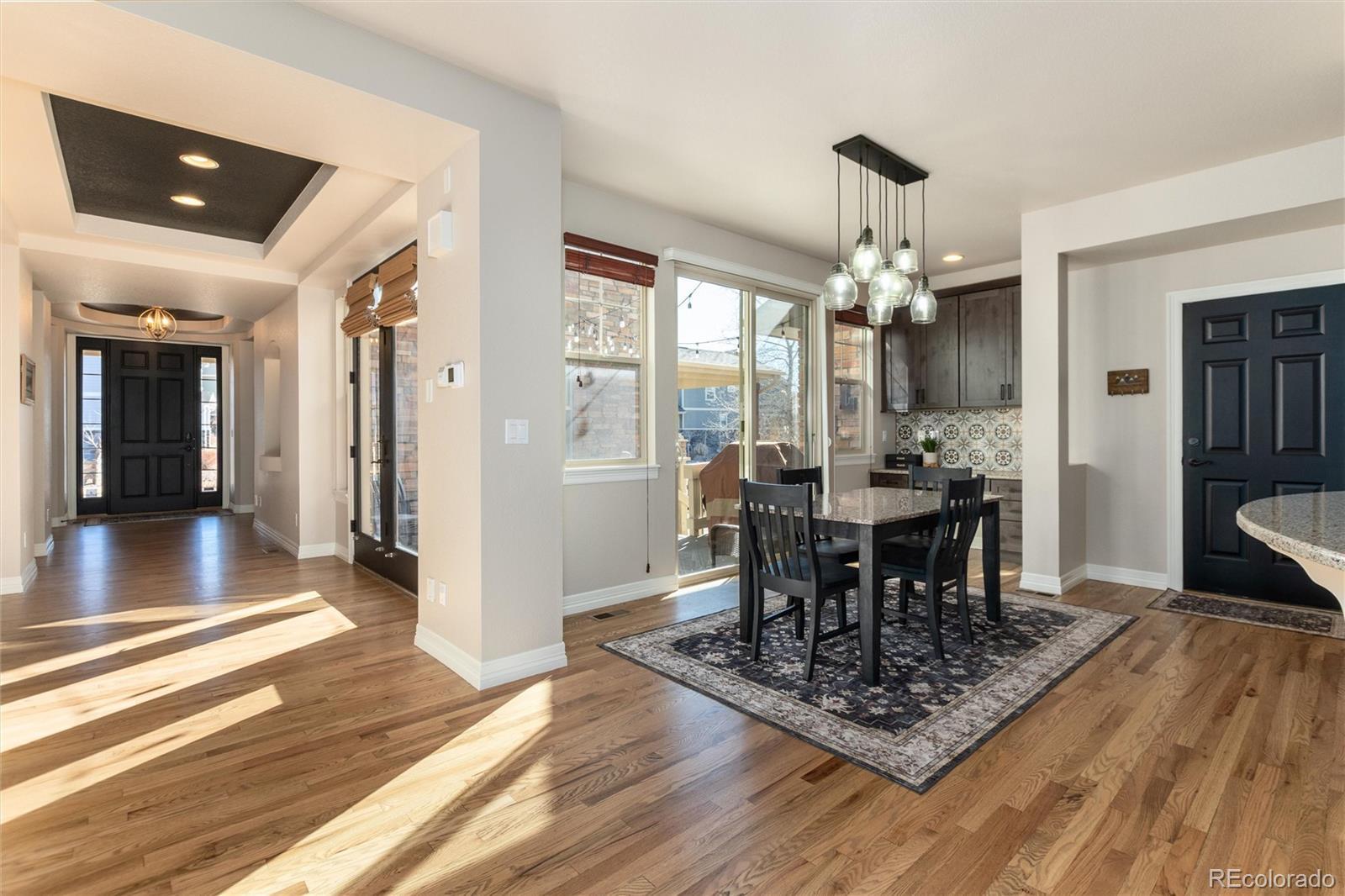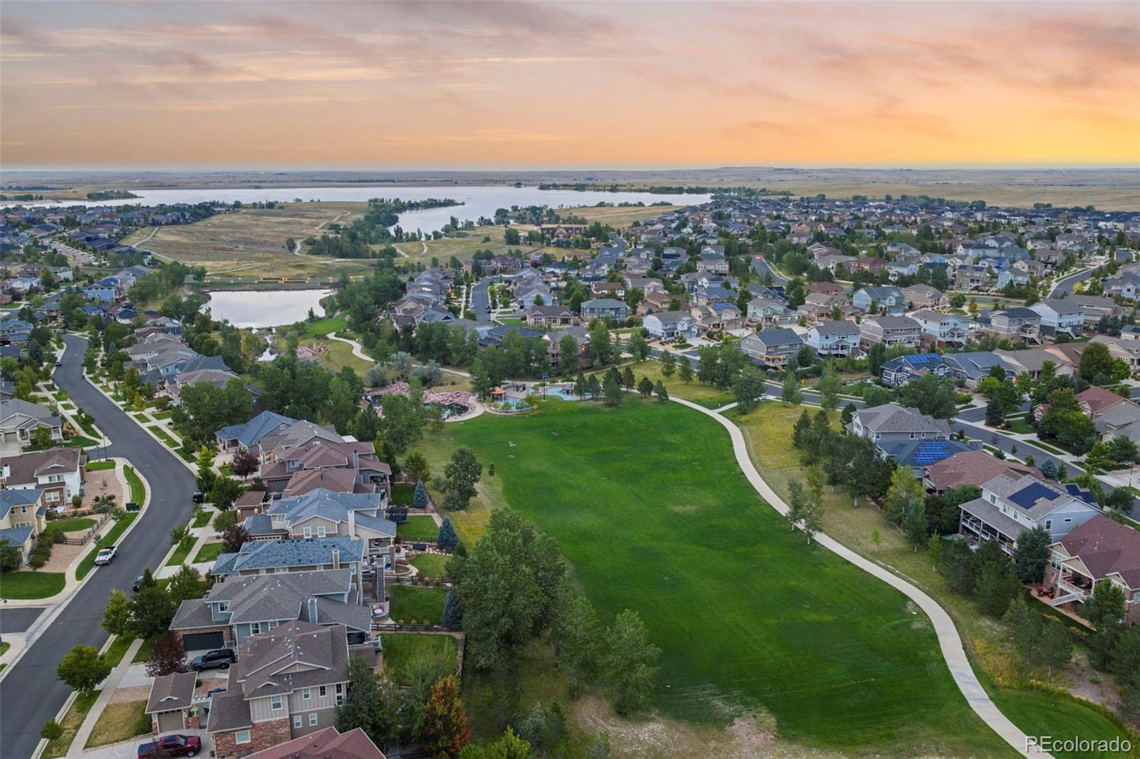 Discover a truly one-of-a-kind home with unparalleled character in the heart of Southshore, one of only two floorplans like this in the entire community! Offering over 5,300 sqft, this remarkable residence blends character with comfort on a large 1/4 acre private lot that backs and sides to green space, parks and peaceful waterfall. Elegant refinished hardwood flooring and a grand foyer opens this home to a functional floor plan. A private main floor office with dual glass doors is located just off the entry and across from a formal den, which could also serve as a perfect second home office-if needed. The hardwood flooring flows throughout the main floor including the formal dining room and updated dine in kitchen with gorgeous refaced cabinets and stainless steel appliances including double ovens for Holiday meals. Off the kitchen is one of three outdoor living spaces with a courtyard-like patio; perfect to enjoy a glass of wine, or cup of coffee. The main floor living room showcases high ceilings, an updated gas fireplace and brand new carpet. Upstairs features four bedrooms including the incredibly private primary suite, which showcases updated laminate flooring set against a second fireplace and is accessed by a private hallway completely separate from the rest of the upstairs. Laminate flooring continues with two additional bedrooms, which share a Jack and Jill bath, while a third bedroom enjoys a full bathroom of it's own. The finished basement offers plenty of space for movies, sleepovers and gaming with a living room with third fireplace, bonus room and an additional bedroom with bath perfect for guests. Located within walking distance to elementary, middle and high schools in the Cherry Creek School District. Southshore is the only community in all of SE Aurora with two private clubhouses, two private fitness facilities, multiple pools, a private dog park, trails and access to the Aurora Reservoir for paddle boarding, biking, fishing and a swim beach.