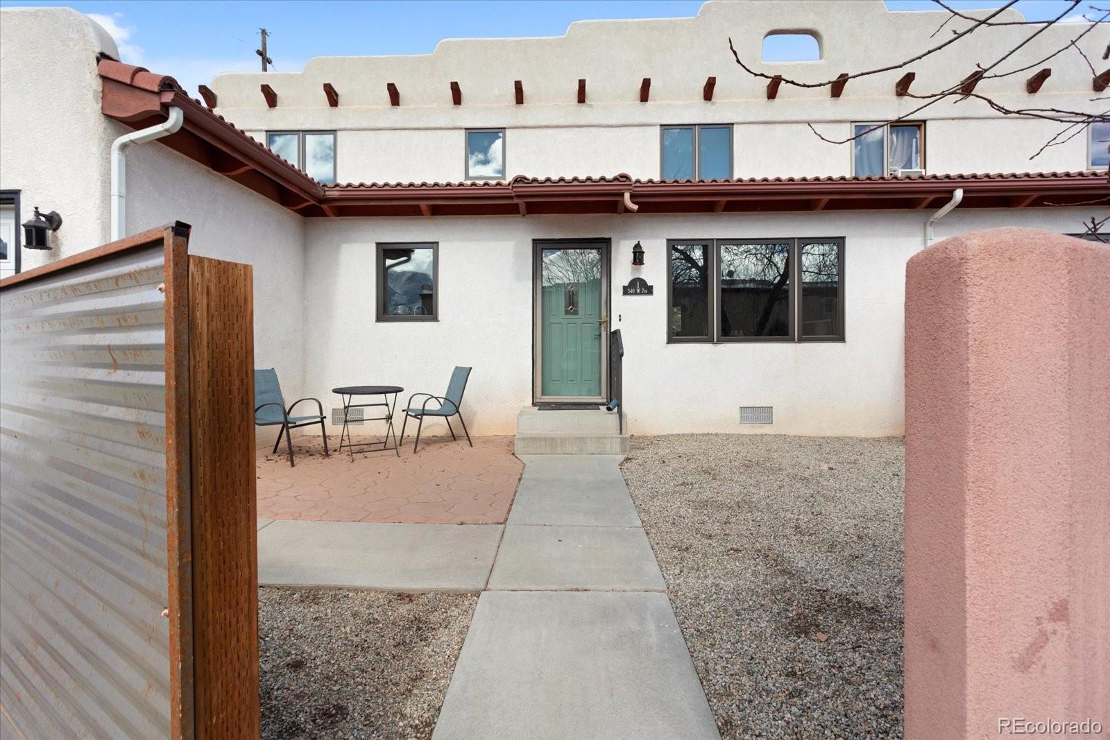 Well appointed end unit is move-in ready! Come look at this beautiful townhome: freshly painted white with lot of natural light pouring in compliments the wood accents throughout this space giving it a modern, yet homey appeal. Private yard with pergola, patio, flagstone, maple, evergreen, Poplar, Elm and Russian Olive trees. You will love this open kitchen, dining, living area with sliding glass doors to private backyard. New Windows were just installed in Nov 2025! Unit has radiant baseboard heat on 4 zones to allow for heating different rooms at various preferred temperatures. (There is also a kick fan heater under sink in kitchen). Furnace was just inspected last fall and hot water heater has recently been serviced as well. Kitchen has laminate counter tops, wood cabinets, a space for a hutch or panty. Bedroom with bathroom located on first floor for one floor living. Upstairs are two more large bedrooms and laundry area. Gorgeous wood vinyl pergo flooring throughout the downstairs and new laminate wood like flooring installed in July of 2025 upstairs. Unit cooled with ceiling fans. Enjoy mountain views and the convenience of living in downtown Salida: easy walking and biking distance to the river, music venues, restaurants, single track trails, stores, parks, schools and more! Quiet neighborhood. And don't miss the garage: two car attached garage with extra workspace. This well-loved gem is waiting for you!