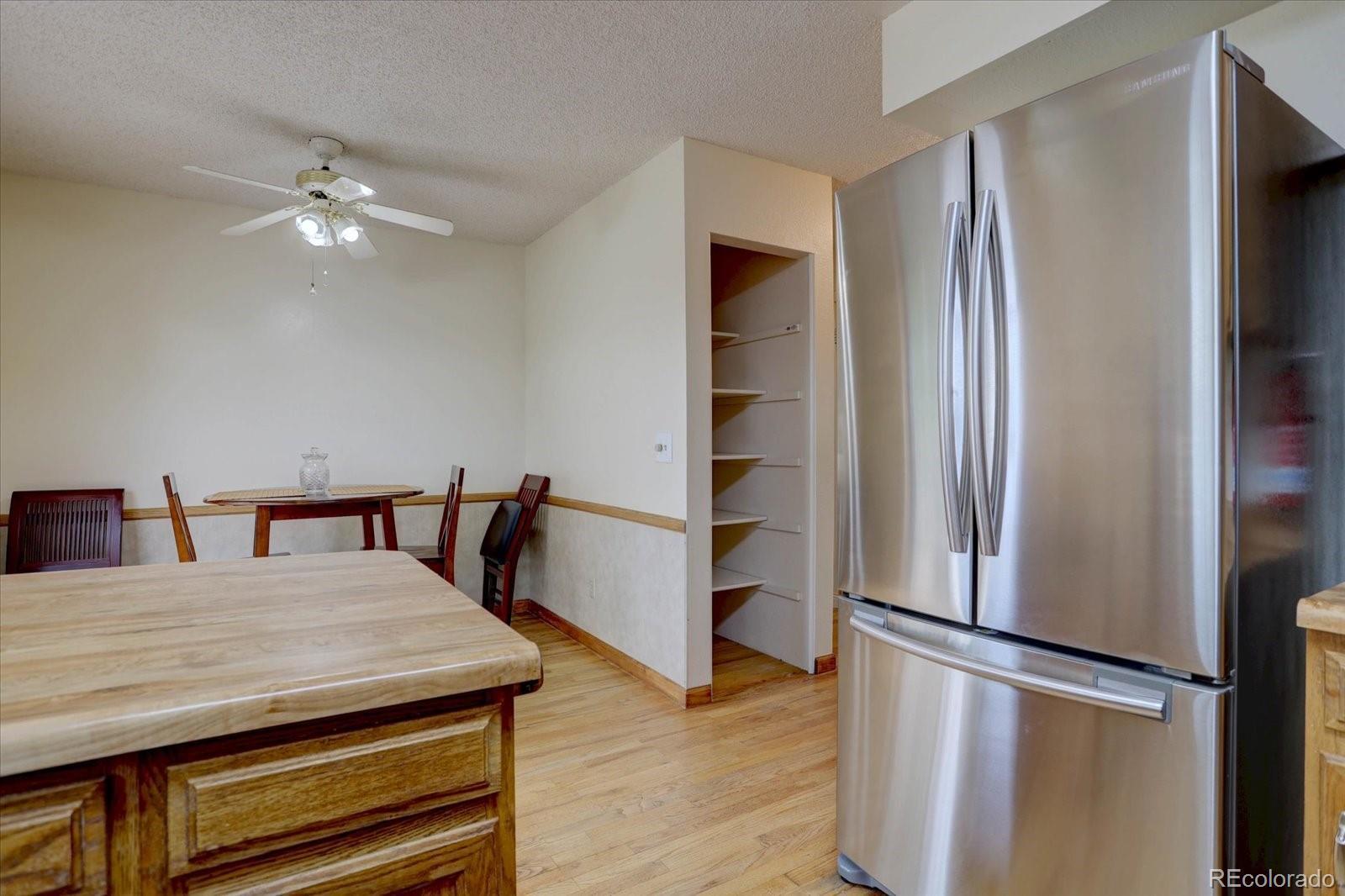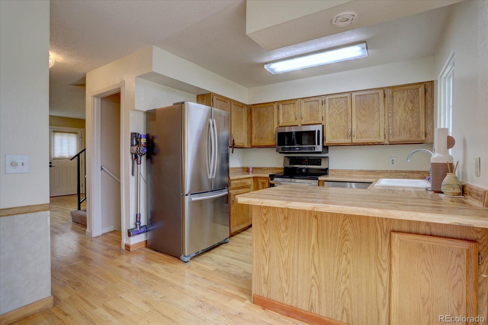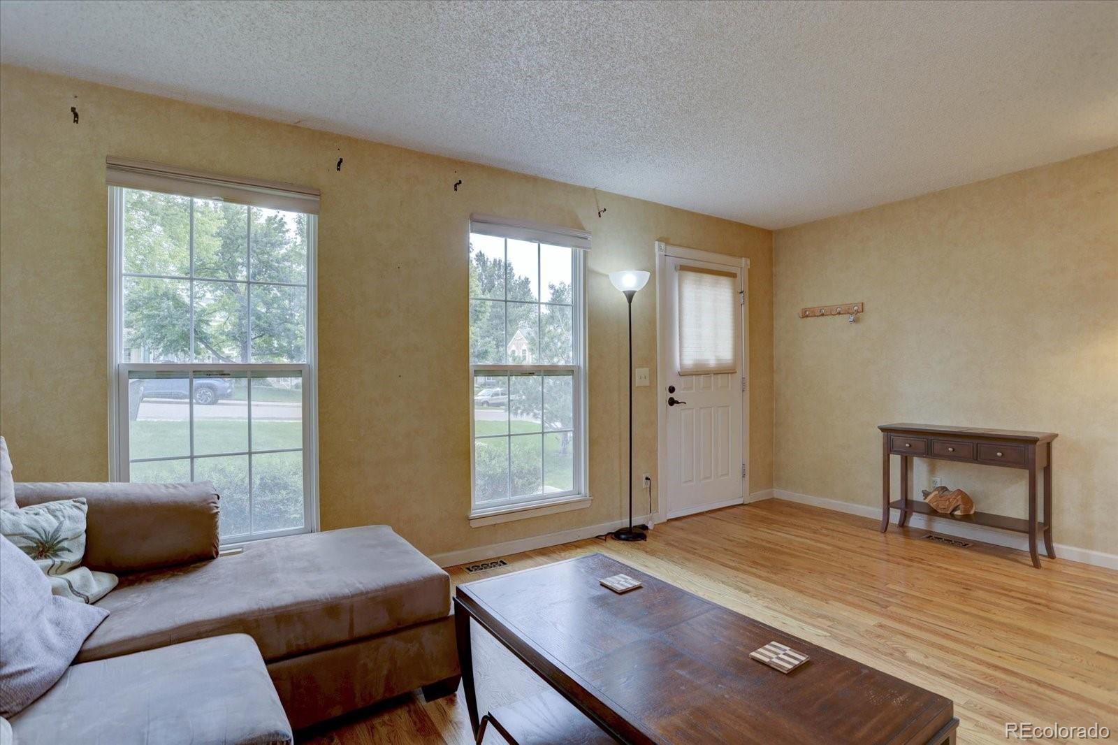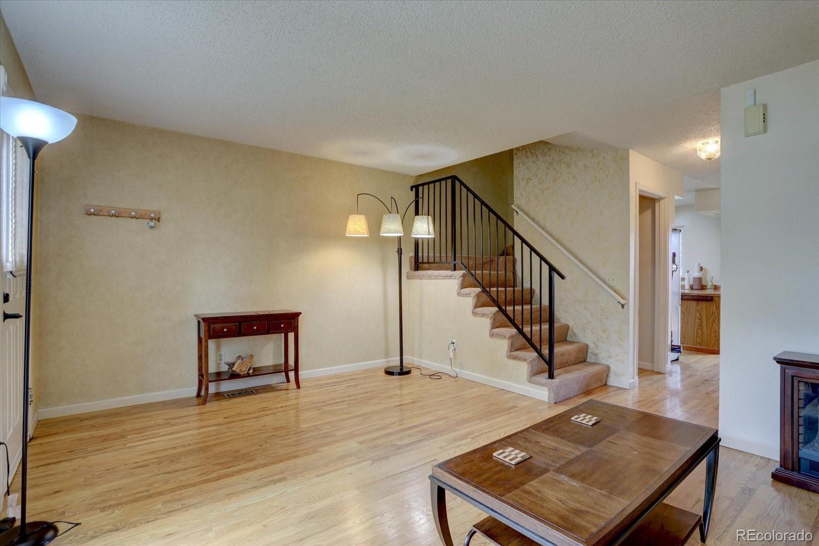 Location, location you got it. This walk-out end unit with Mountain Views backs to open space, creek and trails. On the main floor You have hardwood floors throughout. There is a living room, 1/2 bath, kitchen with S/S appliance's, fridge included. Dining area from where you can access the large Trex deck and enjoy the Mountain View’s and sunsets. The upstairs has 3 bedrooms, 1 updated bathroom. The large primary bedroom has access to the bathroom and also features sky lights, vaulted ceiling and views too. All hardwood floors upstairs as well. The walk-out basement has a bedroom with access to the covered patio, greenbelt and outside storage. There is roughed-in-plumbing for an extra bathroom, laundry, Washer and dryer are included. Extra storage. The Furnace and Water Heater was replaced May 2025. Newer Windows. A/C and much more. Come and make this your home today. Walk to shops, dining, trails and parks. Access to Chatfield State Park, C-470, 285.