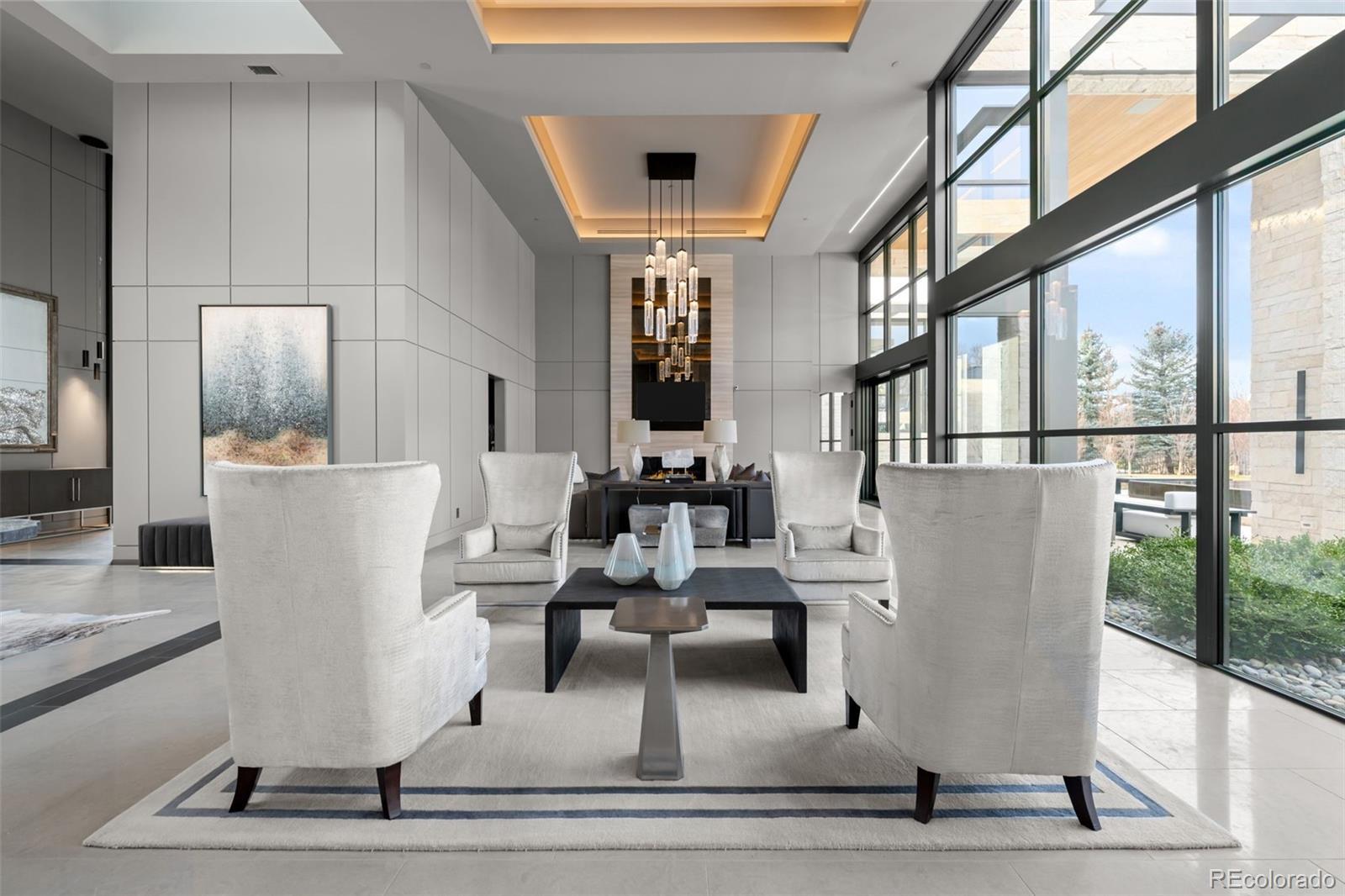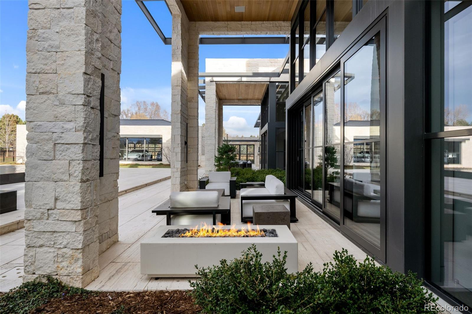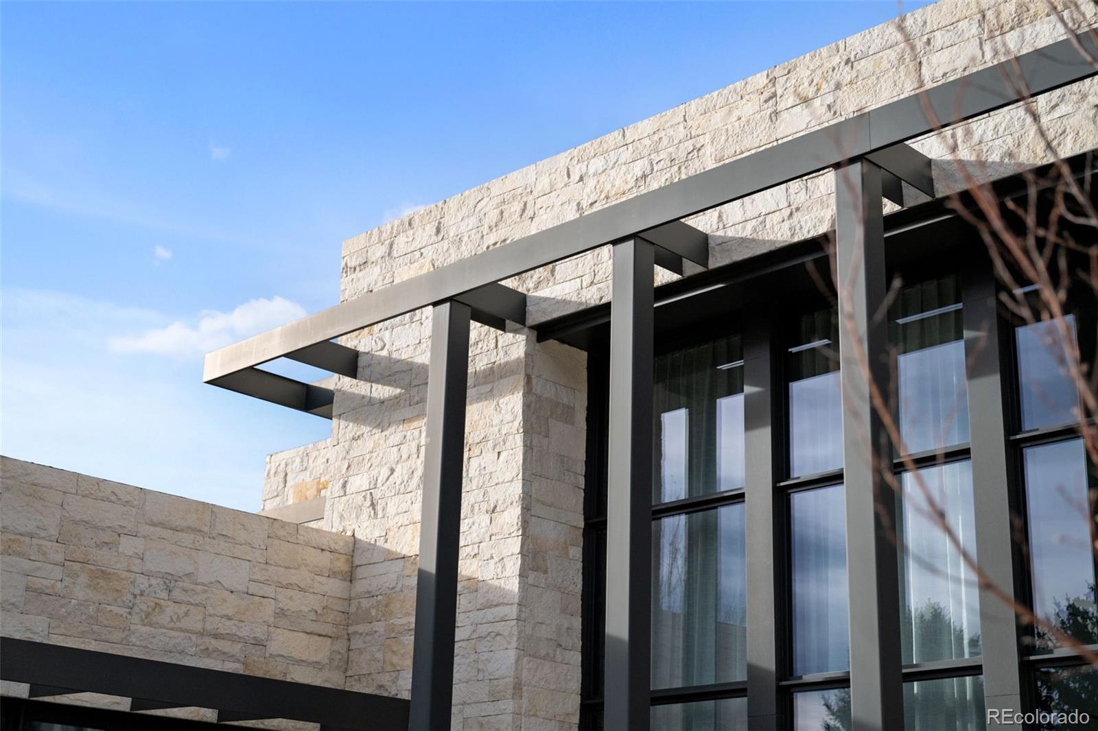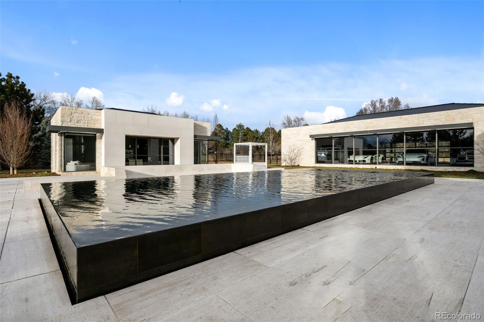 Located in Cherry Hills Village just one mile from Cherry Hills Country Club, this newly completed modern estate sits on 2.5 private acres inside a 24-hour gated and manned community and offers over 13,000 finished square feet of indoor-outdoor living. A 16-foot custom Italian steel entry door opens to soaring 20-foot ceilings, expansive glass, and towering sliding doors that create seamless access to a resort-style travertine pool deck, knife-edge pool and spa, and a fully equipped pool house surrounded by manicured lawn and landscape. Designed for buyers searching for indoor-outdoor living, privacy, and entertaining space, this home delivers a true retreat setting. The main-level primary suite is privately positioned in its own wing and includes a sitting room with fireplace, dual walk-in closets, and a spa-inspired bath with dry sauna and steam shower. A private staircase leads to a secluded second-story office with mountain views and adjacent unfinished space ideal for a boutique closet or additional wellness room. A light-filled exercise studio completes the primary wing. The modern chef’s kitchen features Gaggenau, Wolf, and Dacor appliances plus a full dirty kitchen/prep kitchen designed for effortless entertaining. A main-floor office and a private guest suite with five-piece bath and zero-entry shower offer one-level living for guests. A showpiece 8-car garage with EV chargers includes a full glass wall overlooking the pool deck — a rare feature for collectors and car enthusiasts. Upstairs, accessible by a floating staircase or a private elevator, are three spacious ensuite bedrooms. The lower level includes a theatre room designed for an immersive movie experience. Outdoors, multiple dining, sitting, and soaking areas surround the pool and spa, while the pool house offers a bar and prep space — ideal for buyers searching for a resort-style backyard, outdoor entertaining, and luxury privacy in Cherry Hills Village