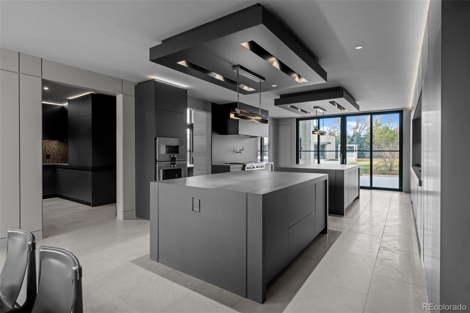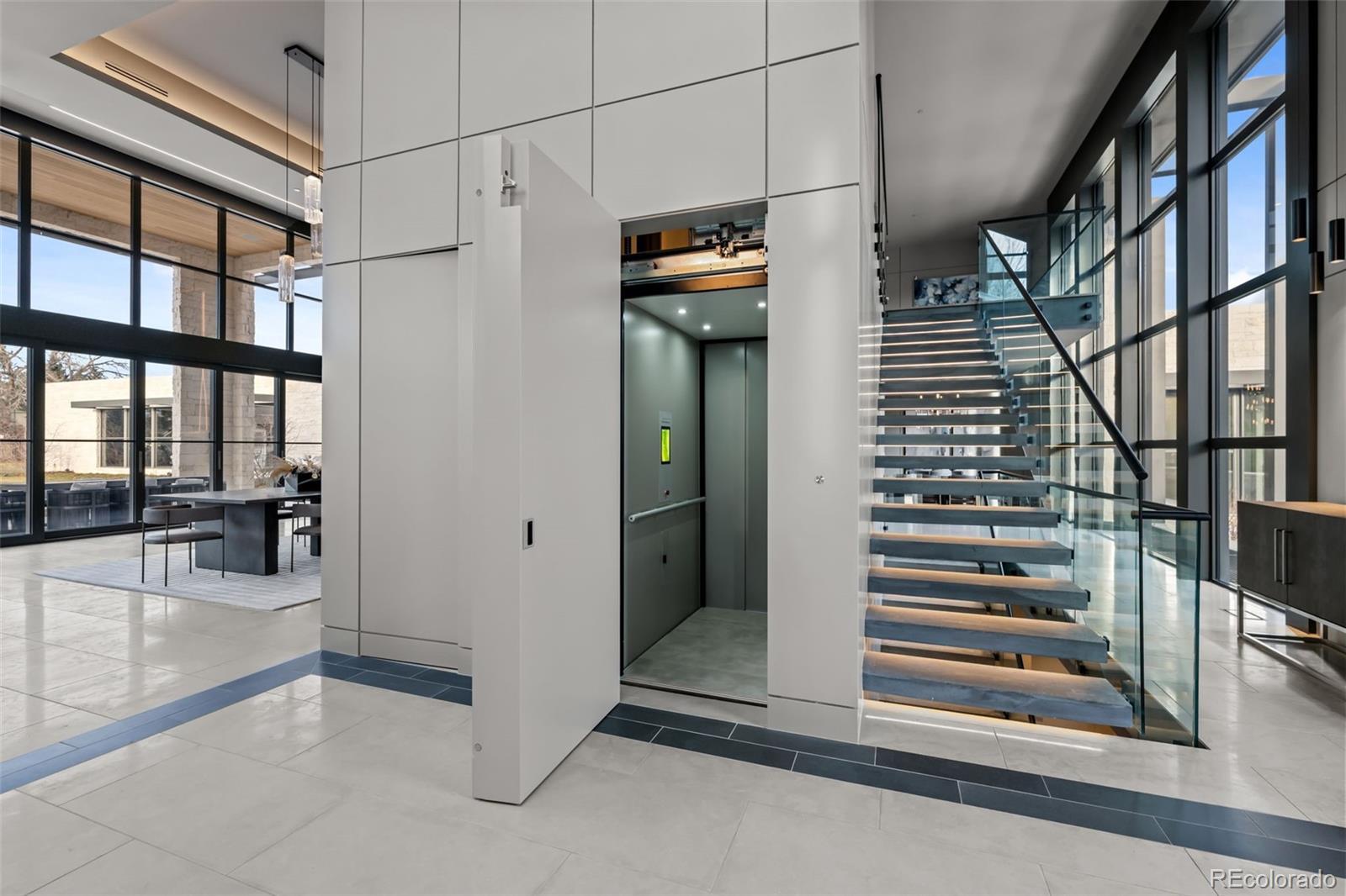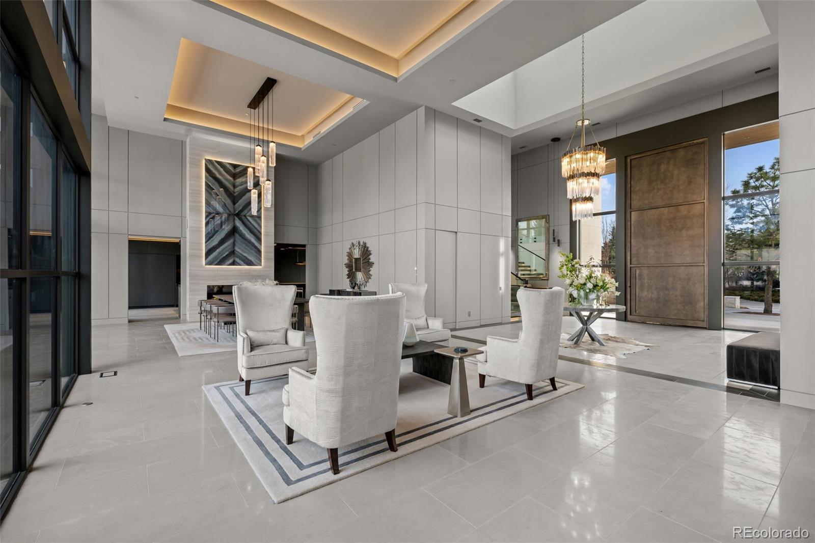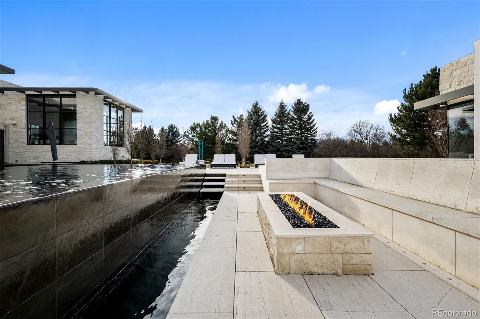 Located in Cherry Hills Village just one mile from Cherry Hills Country Club, this newly completed modern estate sits on 2.5 private acres inside a 24-hour gated and manned community and offers over 13,000 finished square feet of indoor-outdoor living. A 16-foot custom Italian steel entry door opens to soaring 20-foot ceilings, expansive glass, and towering sliding doors that create seamless access to a resort-style travertine pool deck, knife-edge pool and spa, and a fully equipped pool house surrounded by manicured lawn and landscape. Designed for buyers searching for indoor-outdoor living, privacy, and entertaining space, this home delivers a true retreat setting. The main-level primary suite is privately positioned in its own wing and includes a sitting room with fireplace, dual walk-in closets, and a spa-inspired bath with dry sauna and steam shower. A private staircase leads to a secluded second-story office with mountain views and adjacent unfinished space ideal for a boutique closet or additional wellness room. A light-filled exercise studio completes the primary wing. The modern chef’s kitchen features Gaggenau, Wolf, and Dacor appliances plus a full dirty kitchen/prep kitchen designed for effortless entertaining. A main-floor office and a private guest suite with five-piece bath and zero-entry shower offer one-level living for guests. A showpiece 8-car garage with EV chargers includes a full glass wall overlooking the pool deck — a rare feature for collectors and car enthusiasts. Upstairs, accessible by a floating staircase or a private elevator, are three spacious ensuite bedrooms. The lower level includes a theatre room designed for an immersive movie experience. Outdoors, multiple dining, sitting, and soaking areas surround the pool and spa, while the pool house offers a bar and prep space — ideal for buyers searching for a resort-style backyard, outdoor entertaining, and luxury privacy in Cherry Hills Village