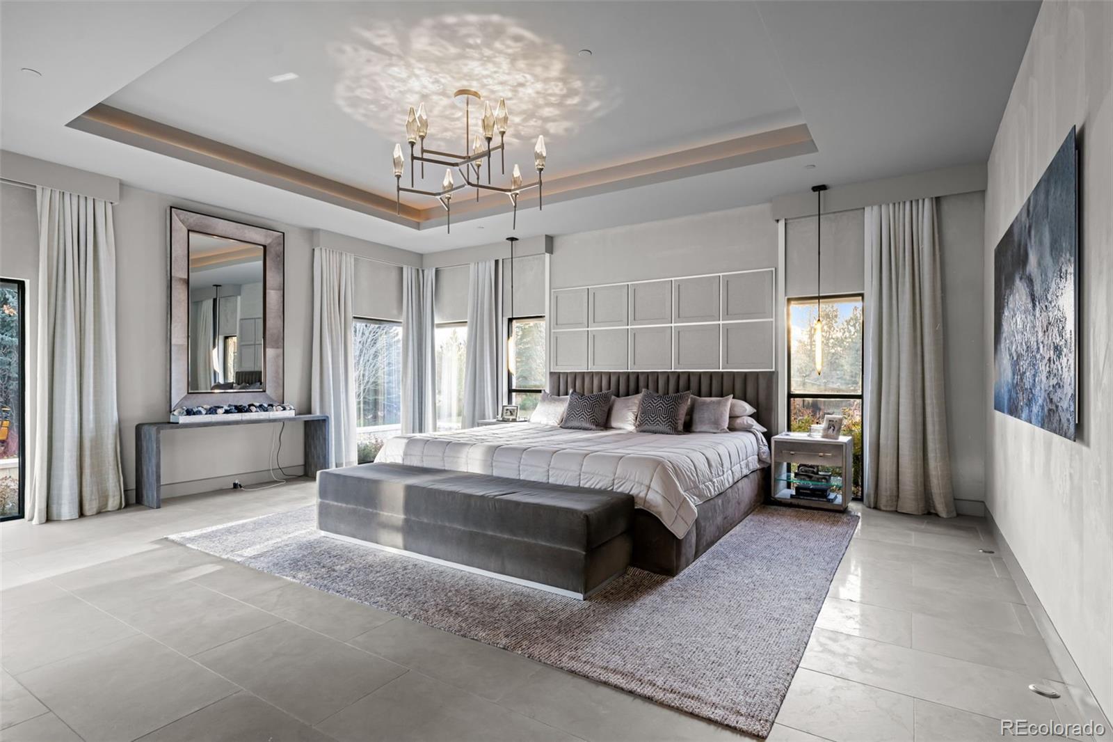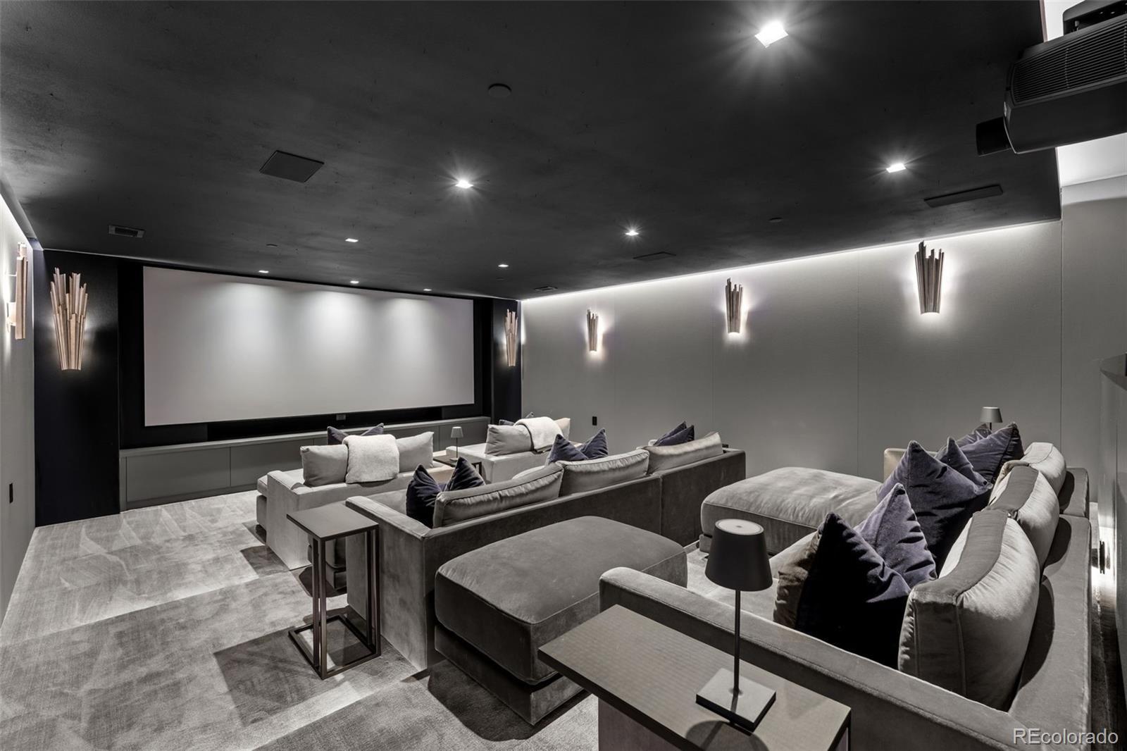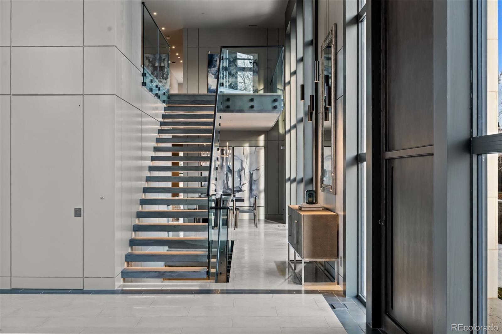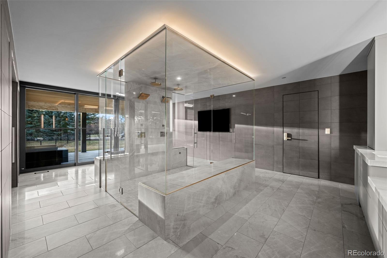 Located in Cherry Hills Village just one mile from Cherry Hills Country Club, this newly completed modern estate sits on 2.5 private acres inside a 24-hour gated and manned community and offers over 13,000 finished square feet of indoor-outdoor living. A 16-foot custom Italian steel entry door opens to soaring 20-foot ceilings, expansive glass, and towering sliding doors that create seamless access to a resort-style travertine pool deck, knife-edge pool and spa, and a fully equipped pool house surrounded by manicured lawn and landscape. Designed for buyers searching for indoor-outdoor living, privacy, and entertaining space, this home delivers a true retreat setting. The main-level primary suite is privately positioned in its own wing and includes a sitting room with fireplace, dual walk-in closets, and a spa-inspired bath with dry sauna and steam shower. A private staircase leads to a secluded second-story office with mountain views and adjacent unfinished space ideal for a boutique closet or additional wellness room. A light-filled exercise studio completes the primary wing. The modern chef’s kitchen features Gaggenau, Wolf, and Dacor appliances plus a full dirty kitchen/prep kitchen designed for effortless entertaining. A main-floor office and a private guest suite with five-piece bath and zero-entry shower offer one-level living for guests. A showpiece 8-car garage with EV chargers includes a full glass wall overlooking the pool deck — a rare feature for collectors and car enthusiasts. Upstairs, accessible by a floating staircase or a private elevator, are three spacious ensuite bedrooms. The lower level includes a theatre room designed for an immersive movie experience. Outdoors, multiple dining, sitting, and soaking areas surround the pool and spa, while the pool house offers a bar and prep space — ideal for buyers searching for a resort-style backyard, outdoor entertaining, and luxury privacy in Cherry Hills Village