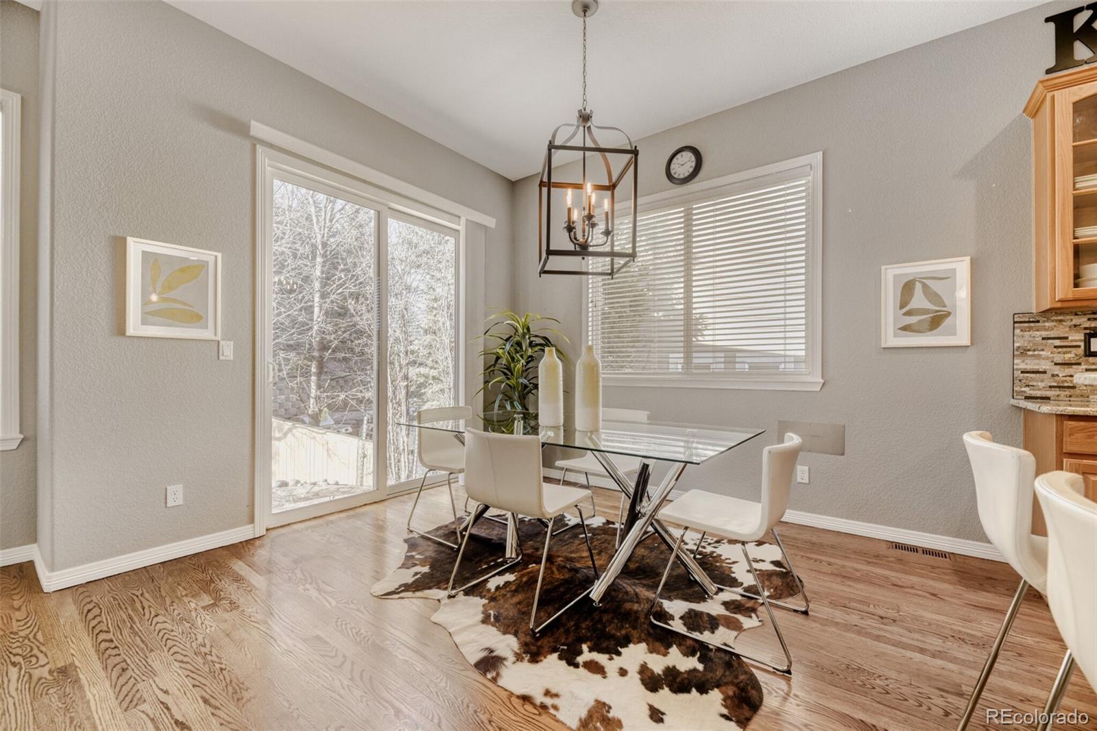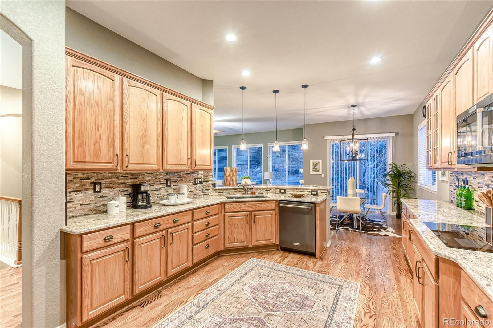 Refined Style Meets Effortless Single-Level Living! Nestled in the coveted Firelight community of Highlands Ranch, this exceptional 1 story home defines elevated one-level living with sophisticated design and upscale finishes throughout. Immaculately maintained and beautifully designed, the home exudes warmth and elegance, showcasing expansive sleek wood flooring, custom designer paint, and thoughtfully selected lighting and window treatments. Every detail reflects impeccable craftsmanship and timeless style. The formal dining room is enhanced by a connecting butler’s/coffee bar pass-through, offering elevated entertaining and convenience. At the heart of the home, the gourmet kitchen features pristine granite countertops, decorative tile backsplash, premium cabinetry, high-end appliances including double ovens, and a generous breakfast bar. Designed for connection, the kitchen flows seamlessly into a remarkably spacious family room, anchored by a charming gas fireplace and walls of windows that frame serene outdoor views. Step outside to an expansive patio overlooking the meticulously landscaped backyard-an ideal setting for al fresco dining, relaxation, and entertaining. The large primary suite is highlighted by tray ceilings, its own cozy gas fireplace, 2 walk-in closets, and a 5piece bath with soaking tub & extended shower. The spectacular finished basement dramatically expands the living experience, offering exceptional flexibility & comfort. This impressive space includes a massive media/recreation room, a full kitchen w/wet bar, 2 suites and a beautifully appointed bath-perfect for multigenerational living, extended stays, or upscale entertaining.Additional highlights include a 3car attached garage & convenient main-floor laundry. Residents of Highlands Ranch enjoy an unparalleled lifestyle with miles of interconnected trails, acres of open space, expansive parks, a comprehensive recreation center system, multiple pools, fitness and vibrant community events.
