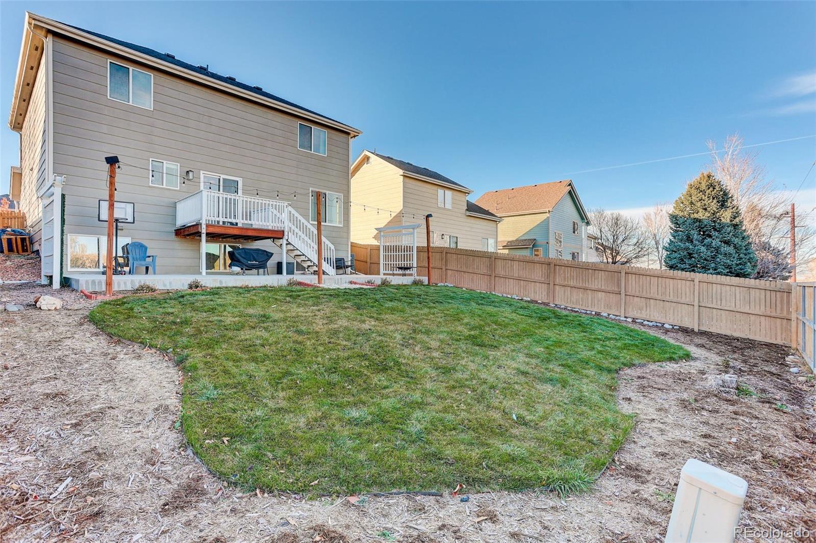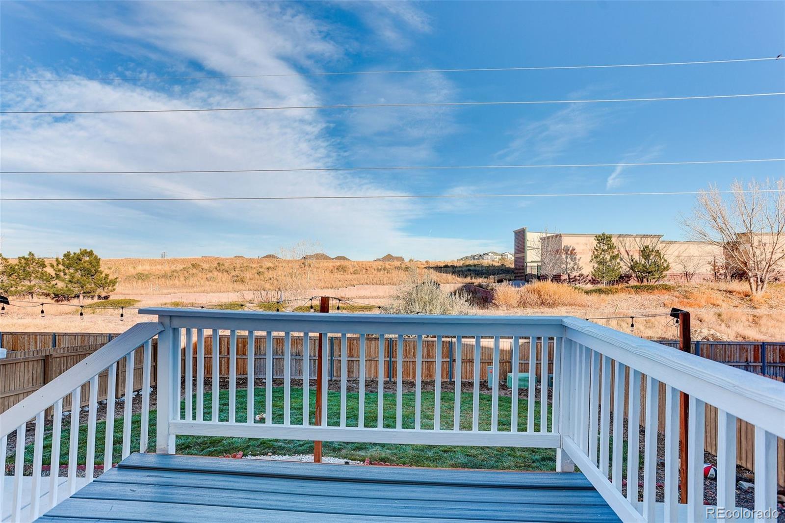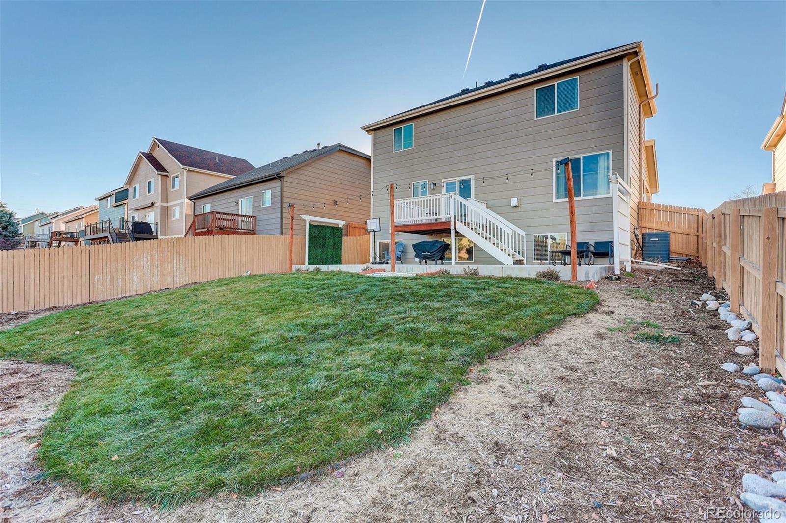This 2003 Lennar 2-Story home includes 5 beds, 3 1/2 baths, and plenty of upgrades! You’ll enjoy the over 2280+ sq. ft of finished area. With great curb appeal and covered front porch, this beautiful home is ready for you! The large living room includes neutral carpet, gas log fireplace, and ceiling fan. An open dining room boasts ceramic tile floors, updated lighting, and access to the deck. Plenty of natural light! Spacious kitchen has slab granite countertops, beautiful floors, large island with additional seating, stainless steel appliances, and pantry! Plenty of cabinets offer tons of storage! Main level ½ bath offers convenience for guests. Great deck for your outdoor entertaining! An oversized primary bedroom has space for your furniture needs, ceiling fan, and CAT5. The well-appointed primary bath includes tub, dual sink vanity, tile surround, and much more! Additionally, you will find 3 good-sized bedrooms, and full bath on the upper level. The large garden level basement is finished with rec room, 5th bed, and additional 3/4 bath with walk-in shower. Enjoy the abundance of natural light in this well designed basement. There’s no lack of storage in this great home. 2 car garage parking with room for all your toys! Fully fenced! Washer and dryer stay! Beautiful yard! Backs to open space! Minutes to DIA! Central A/C! Cherry Creek schools! Move-in ready!