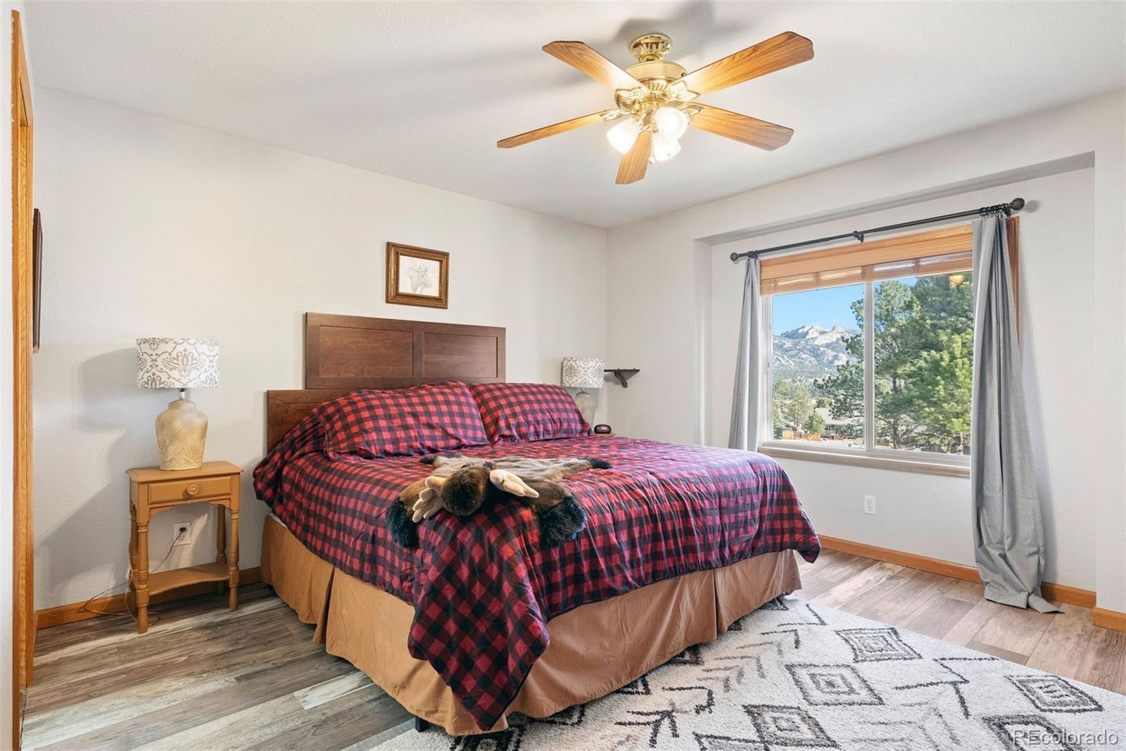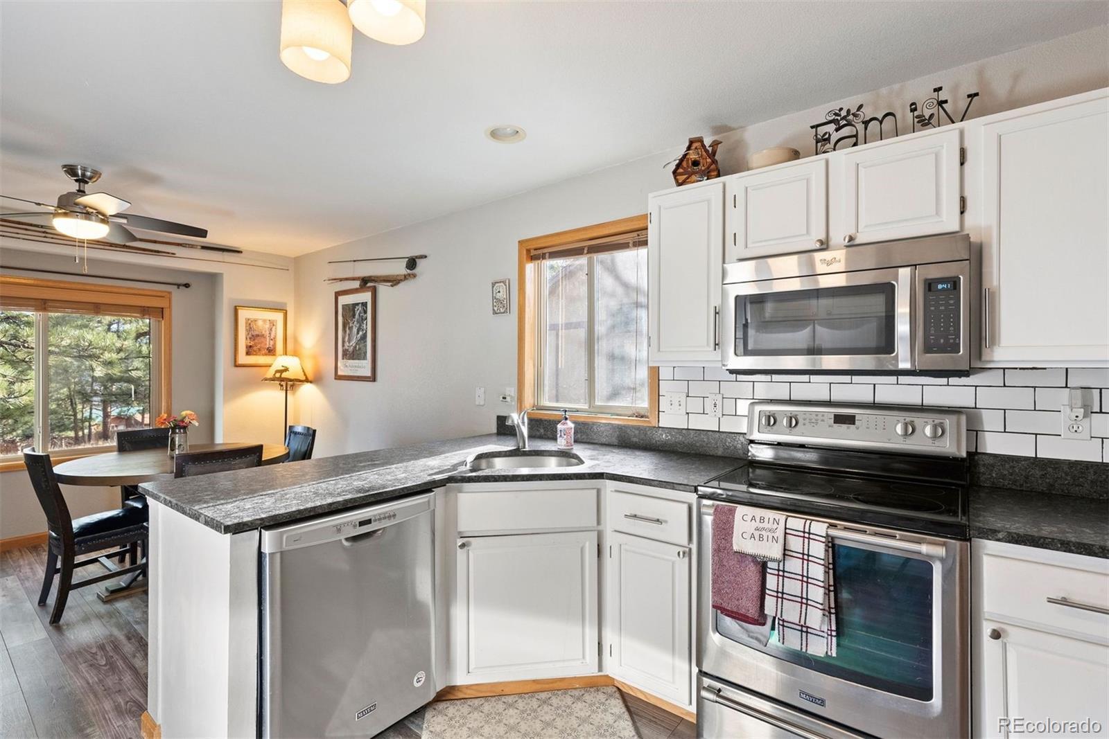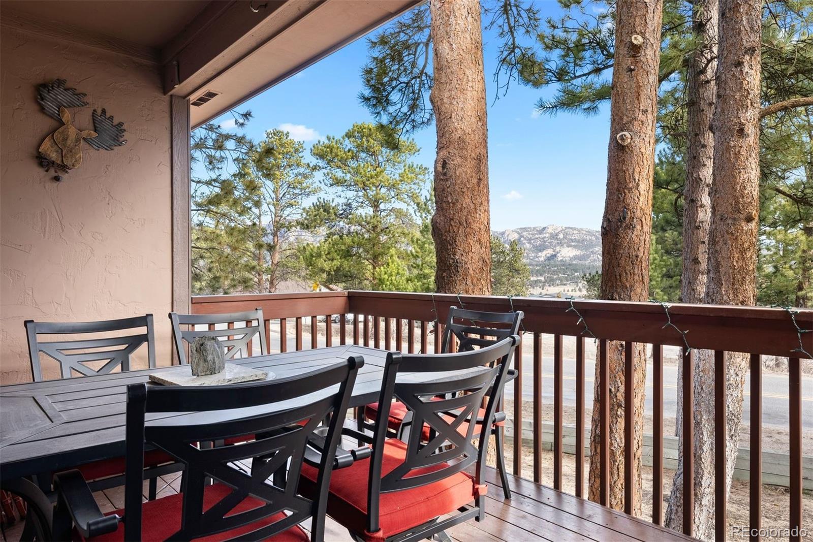 Tucked at the end of a quiet cul-de-sac in the desirable Mountain Golf Villas subdivision, this beautifully remodeled, stand-alone 2-bedroom, 2-bathroom home offers the perfect balance of luxury, comfort, and natural beauty. Whether you're seeking a full-time residence or a serene mountain retreat, this home embodies the Colorado lifestyle at its finest. Step inside and feel immediately at ease. The open-concept, single-level floor plan creates an effortless flow throughout, with upgraded features at every turn. The expansive living room invites you to relax by the cozy gas fireplace or step through sliding doors to your private walkout deck—perfect for morning coffee, afternoon reading, or evening stargazing. The kitchen is a chef’s delight, featuring stunning leathered granite countertops, a new sink with modern fixtures, stainless steel appliances, and a classic subway tile backsplash. Beautiful laminate flooring, new lighting, and ceiling fans add a fresh, contemporary feel throughout. Both bathrooms have been tastefully updated with tile floors, new showers, and granite vanities, copper sink, offering a spa-like experience at home. Outdoors, enjoy multiple spaces designed for relaxation—a charming front porch sitting area, a gated private deck, and a peaceful backyard that feels like your own secret garden. The oversized two-car garage adds convenience and ample storage. Meticulously maintained, this home includes thoughtful upgrades such as a new hot water heater and screened gutter guards. And then—there are the views. From nearly every window, take in the breathtaking beauty of the surrounding mountains and abundant wildlife. Located moments from a scenic 18-hole golf course, hiking trails, world-class restaurants, and the iconic Stanley Hotel, you’ll find everything you need just beyond your doorstep. This is more than a home—this is a lifestyle. A place where seasons change in vibrant color and where every detail has been crafted for your comfort and joy.