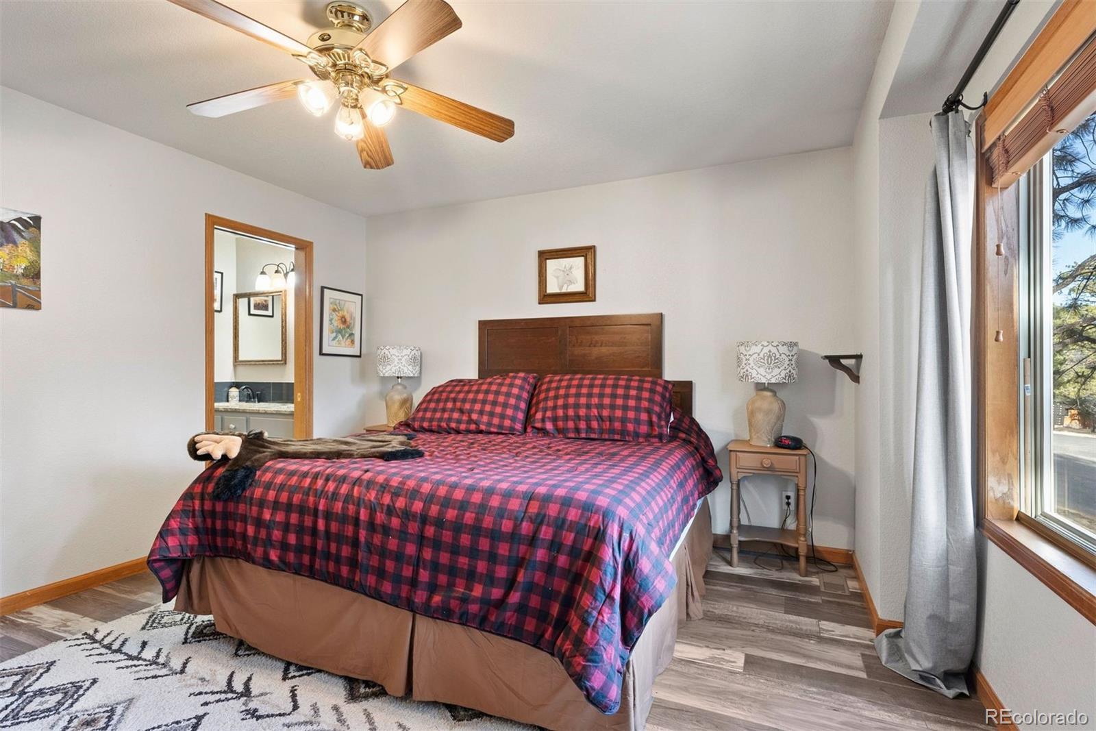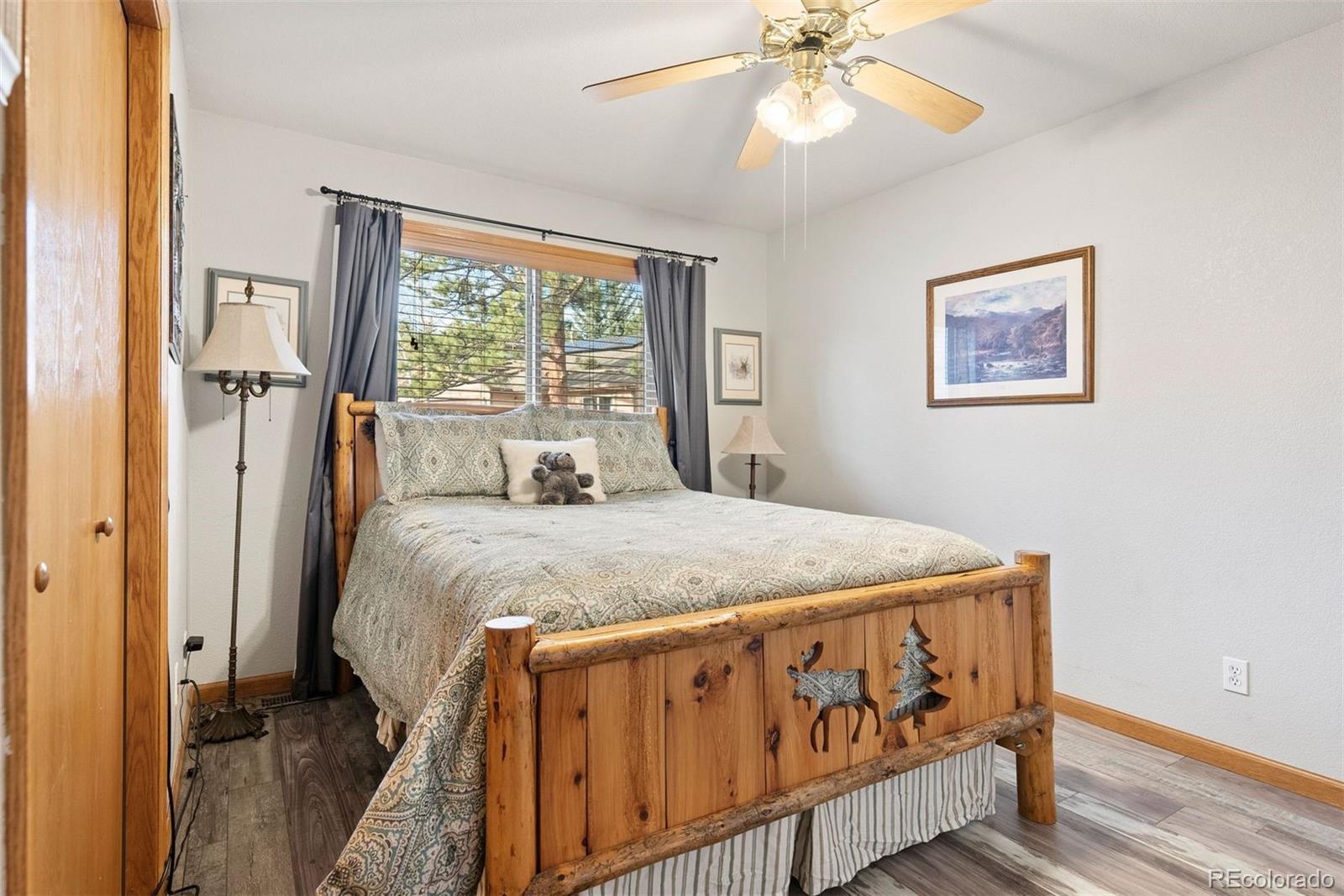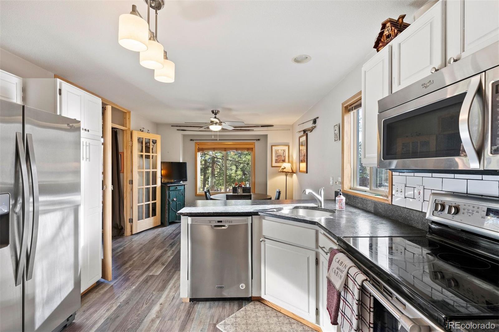 Tucked at the end of a quiet cul-de-sac in the desirable Mountain Golf Villas subdivision, this beautifully remodeled, stand-alone 2-bedroom, 2-bathroom home offers the perfect balance of luxury, comfort, and natural beauty. Whether you're seeking a full-time residence or a serene mountain retreat, this home embodies the Colorado lifestyle at its finest. Step inside and feel immediately at ease. The open-concept, single-level floor plan creates an effortless flow throughout, with upgraded features at every turn. The expansive living room invites you to relax by the cozy gas fireplace or step through sliding doors to your private walkout deck—perfect for morning coffee, afternoon reading, or evening stargazing. The kitchen is a chef’s delight, featuring stunning leathered granite countertops, a new sink with modern fixtures, stainless steel appliances, and a classic subway tile backsplash. Beautiful laminate flooring, new lighting, and ceiling fans add a fresh, contemporary feel throughout. Both bathrooms have been tastefully updated with tile floors, new showers, and granite vanities, copper sink, offering a spa-like experience at home. Outdoors, enjoy multiple spaces designed for relaxation—a charming front porch sitting area, a gated private deck, and a peaceful backyard that feels like your own secret garden. The oversized two-car garage adds convenience and ample storage. Meticulously maintained, this home includes thoughtful upgrades such as a new hot water heater and screened gutter guards. And then—there are the views. From nearly every window, take in the breathtaking beauty of the surrounding mountains and abundant wildlife. Located moments from a scenic 18-hole golf course, hiking trails, world-class restaurants, and the iconic Stanley Hotel, you’ll find everything you need just beyond your doorstep. This is more than a home—this is a lifestyle. A place where seasons change in vibrant color and where every detail has been crafted for your comfort and joy.