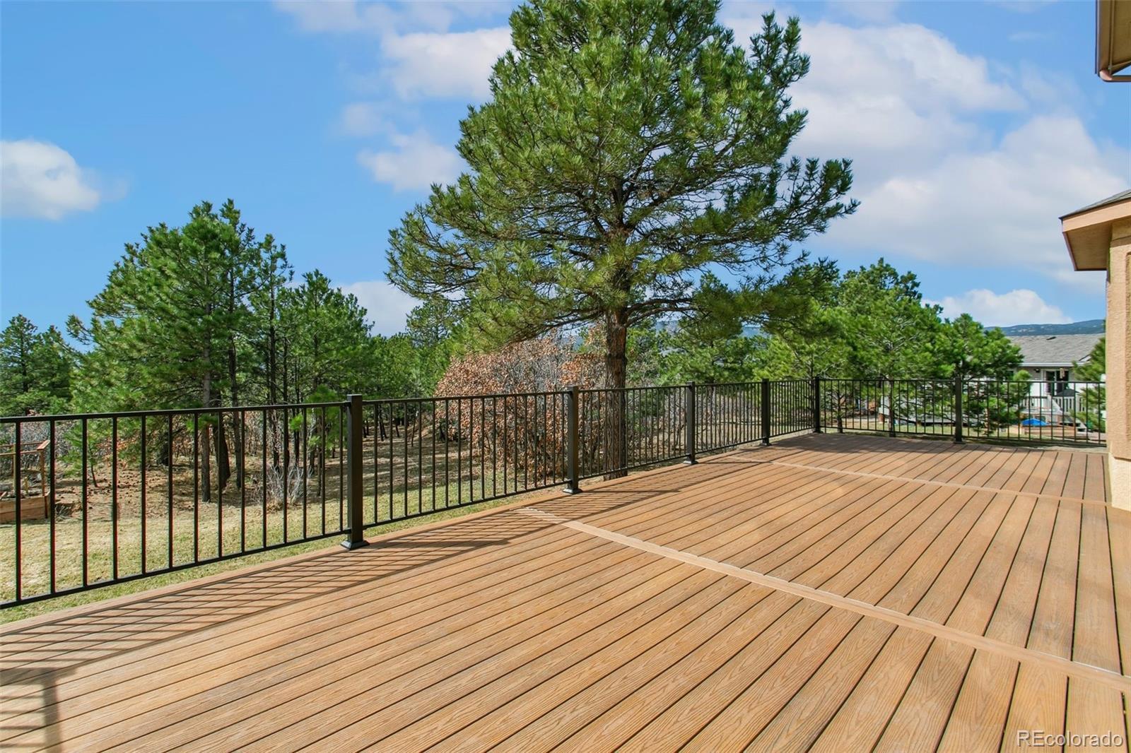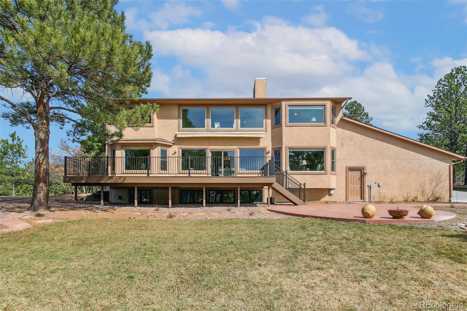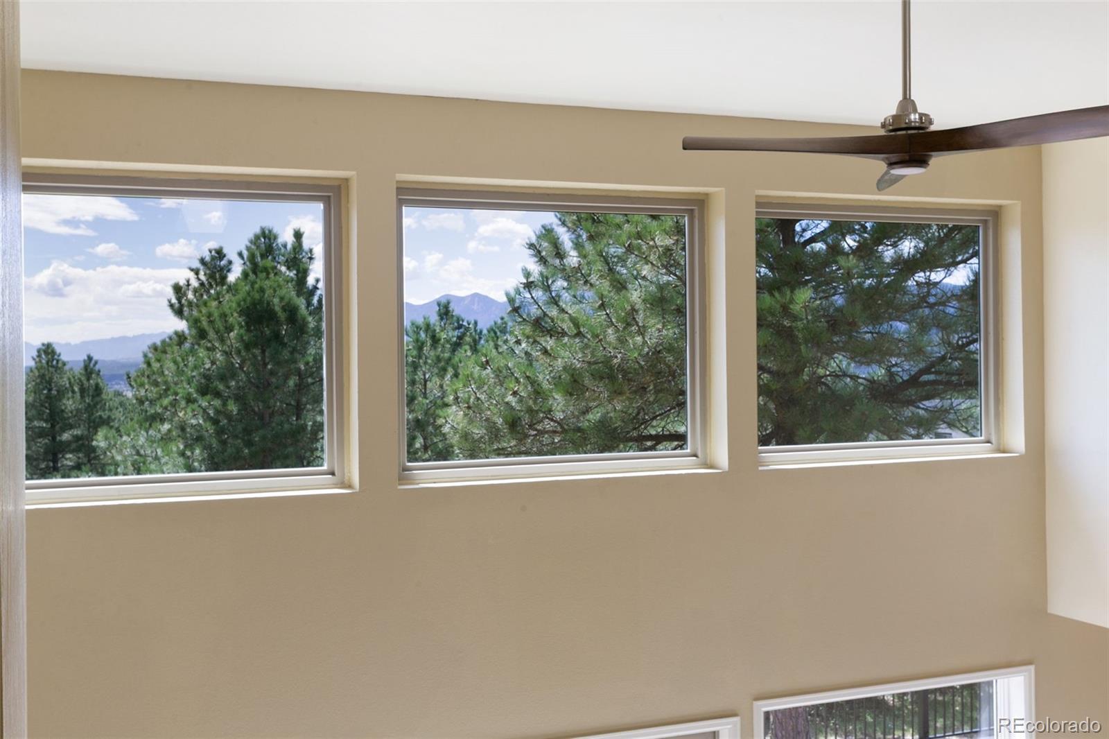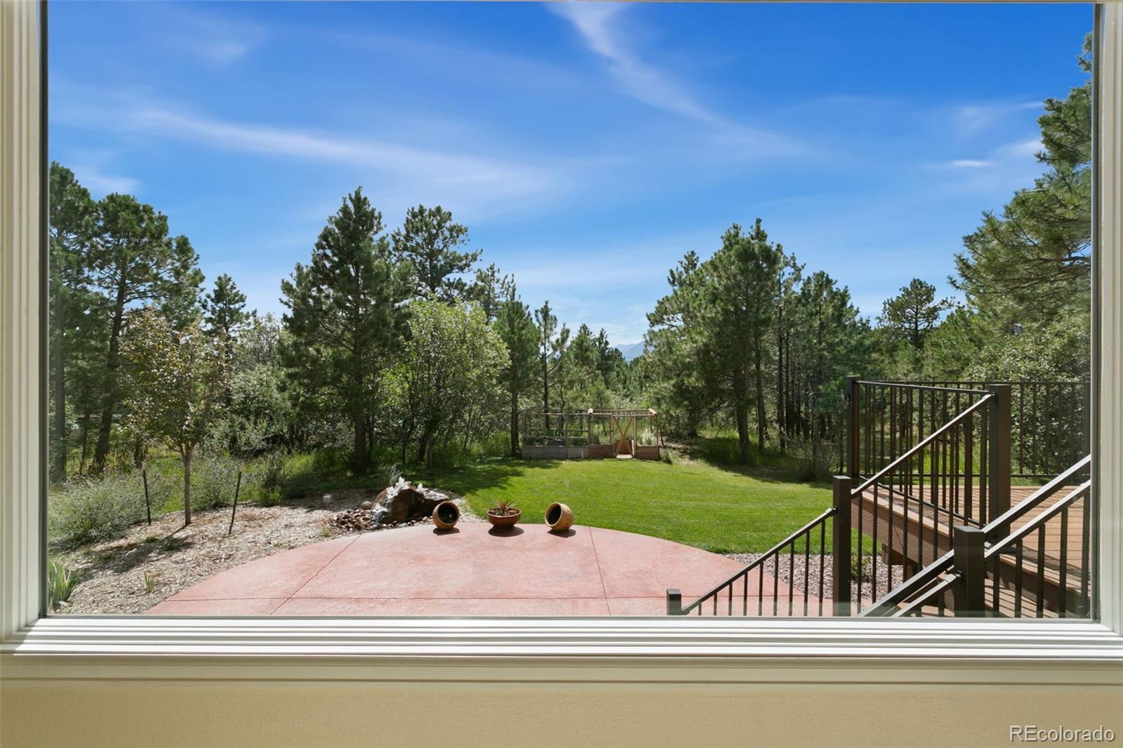 The Pikes Peak and front range views from this Woodmoor home are spectacular! Almost 1 acre on a quiet cul de sac. Move in ready. Everything about this home has been meticulously cared for by the owners and it shines. Stucco and stone exterior. Extensive interior and exterior upgrades completed in the past few years. Check out the views from the primary suite! Just a few of the amazing features include a double-sided fireplace, soaring ceilings, hardwood and tile floors, plenty of natural light, recently upgraded kitchen, quartzite and engineered stone counters, maple cabinets, a cute kitchen bench with seating by a picture window, double stainless-steel ovens and more! There is a main level bedroom with hardwood flooring, picture window and a 3/4 bath located next to it. The primary bath includes a jetted tub, 5-piece bath and a walk-in California closet. The two upper guest bedrooms share a jack and jill bathroom with a shower. The basement includes a wet bar with beer tap, pool table, pool sticks, pool stick mount, gas fireplace, speakers and a mounted television. Newer carpeting has been added. Central air was added in 2023. The main level laundry room features cabinets, built in ironing board and washer/dryer included. The 3-car garage includes a workshop/workbench and storage shelves. The backyard has a storage shed and fenced protected garden perfect for plants and vegetables. Plenty of storage space including a crawl space in the basement. Circular driveway in front of the home with additional parking spaces for guests. Relax on the huge newer composite deck with a retractable awning and listen to the bubbling fountain along with the sound of the breezes thru the pine trees. Easy access to local trails, shopping, restaurants and easy access to I-25 for a commute to Denver or Colorado Springs. This home really does have it all. Welcome home!!