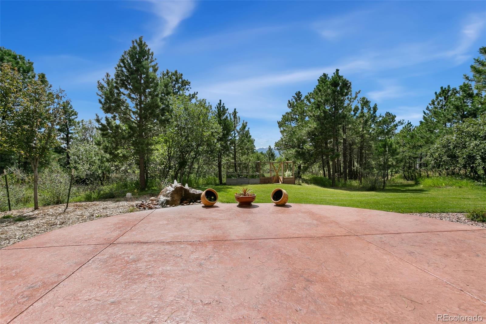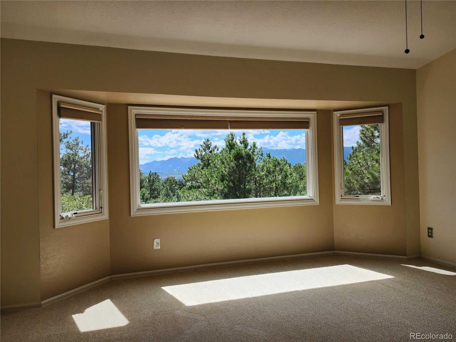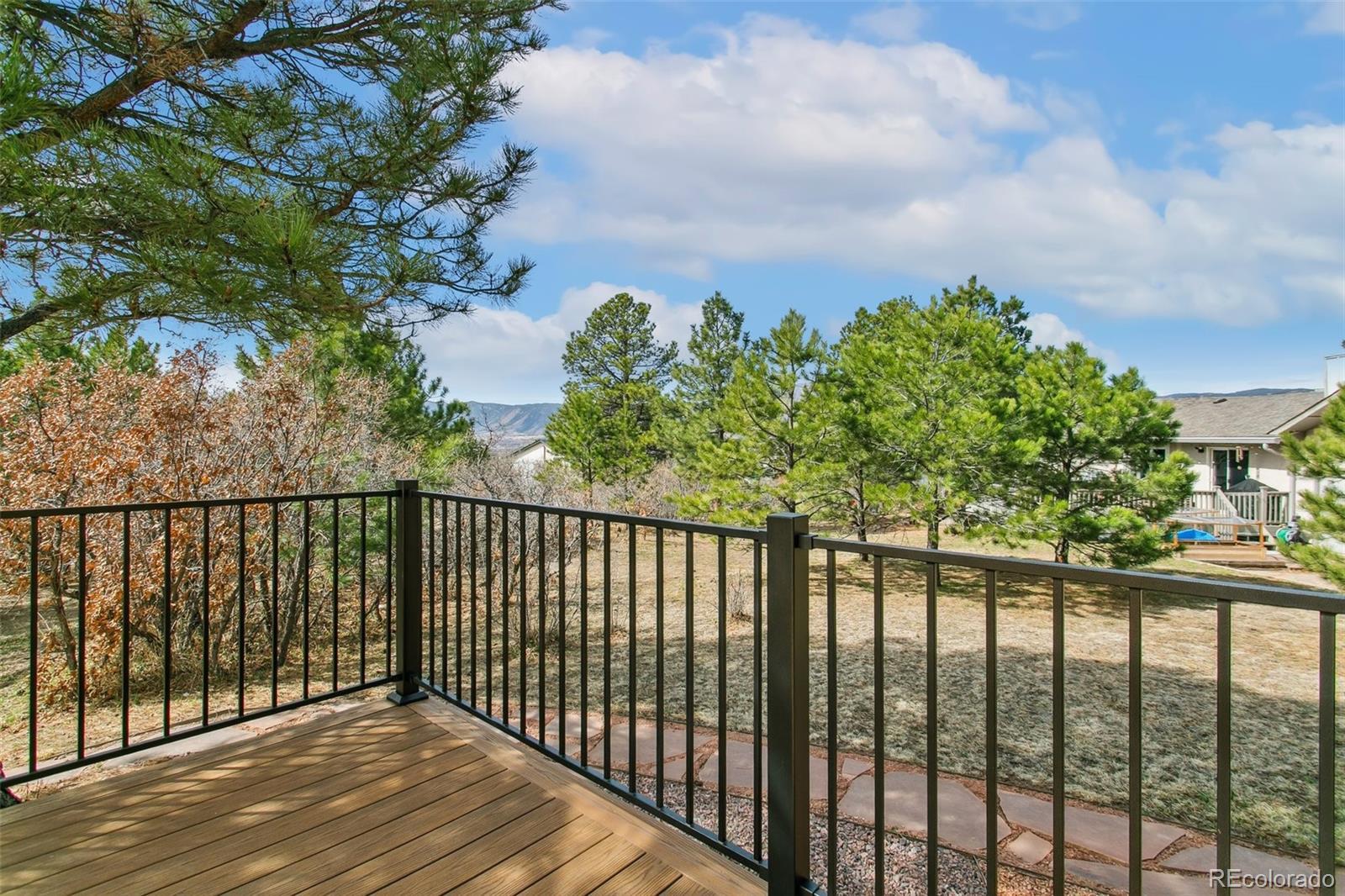 The Pikes Peak and front range views from this Woodmoor home are spectacular! Almost 1 acre on a quiet cul de sac. Move in ready. Everything about this home has been meticulously cared for by the owners and it shines. Stucco and stone exterior. Extensive interior and exterior upgrades completed in the past few years. Check out the views from the primary suite! Just a few of the amazing features include a double-sided fireplace, soaring ceilings, hardwood and tile floors, plenty of natural light, recently upgraded kitchen, quartzite and engineered stone counters, maple cabinets, a cute kitchen bench with seating by a picture window, double stainless-steel ovens and more! There is a main level bedroom with hardwood flooring, picture window and a 3/4 bath located next to it. The primary bath includes a jetted tub, 5-piece bath and a walk-in California closet. The two upper guest bedrooms share a jack and jill bathroom with a shower. The basement includes a wet bar with beer tap, pool table, pool sticks, pool stick mount, gas fireplace, speakers and a mounted television. Newer carpeting has been added. Central air was added in 2023. The main level laundry room features cabinets, built in ironing board and washer/dryer included. The 3-car garage includes a workshop/workbench and storage shelves. The backyard has a storage shed and fenced protected garden perfect for plants and vegetables. Plenty of storage space including a crawl space in the basement. Circular driveway in front of the home with additional parking spaces for guests. Relax on the huge newer composite deck with a retractable awning and listen to the bubbling fountain along with the sound of the breezes thru the pine trees. Easy access to local trails, shopping, restaurants and easy access to I-25 for a commute to Denver or Colorado Springs. This home really does have it all. Welcome home!!