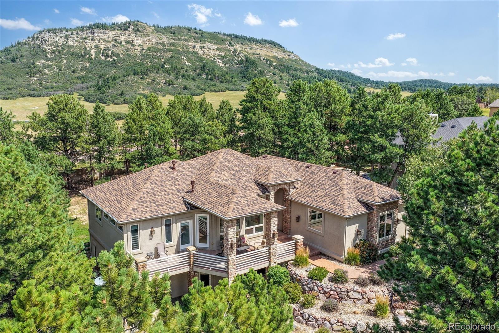 Welcome to this stunning elevated ranch in the highly desirable High Pines neighborhood of Monument. Set on a half-acre lot with mature trees, stucco and stone exterior, and beautiful landscaping, this home offers outstanding curb appeal and mountain views from its spacious composite front deck. A covered stone-pillar entryway with stamped concrete and a leaded-glass front door set the tone for the elegant finishes inside. The foyer opens to wood and tile flooring with Brazilian red cherry inlay. The inviting living room boasts soaring ceilings, a custom-tile gas fireplace with built-ins, large windows, and access to the deck. The fully updated kitchen features quartz countertops, Bosch stainless steel appliances, gas cooktop, double ovens, custom cabinetry, and a walk-in pantry. A breakfast nook opens to the backyard, while the formal dining room showcases a tray ceiling with backlighting and casement windows. The main-level primary suite is oversized with deck access and a spa-like bath offering a jetted soaking tub, walk-in shower, dual vanities, and a spacious walk-in closet. An additional bedroom and full bath, plus a laundry/mudroom with sink, complete the main level. The finished walkout basement lives like another home, with a large family room, gas fireplace, luxury vinyl flooring, and patio access. A wet bar includes cabinetry, tile countertops, wine rack, sink, and mini-fridge. Three more bedrooms provide flexibility—one with an ensuite full bath, another used as a music room, and one as an office—all with generous closets. The fully fenced backyard includes a stamped concrete patio, perfect for entertaining. Additional highlights: new roof, new carpet, A/C, central vacuum, 8-ft doors, radon system, and water softener. Ideally located near County Line Road with quick access to Denver, Monument, and Colorado Springs, this home is perfect for multigenerational living or added privacy. Truly a must-see!
