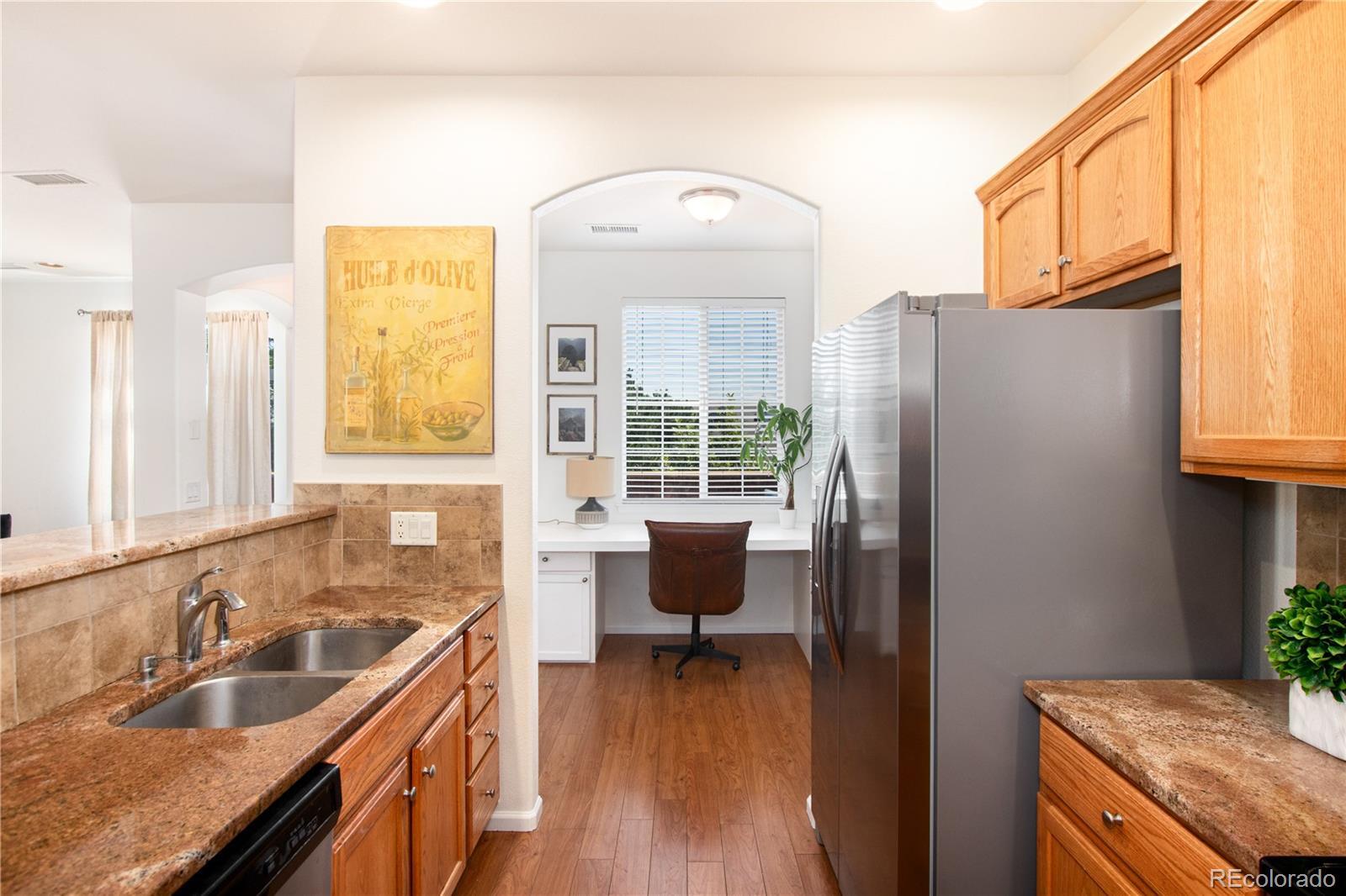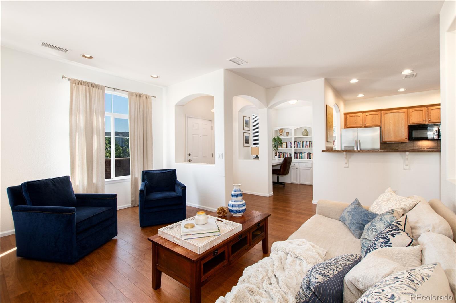 Welcome to the Brownstones at Town Center—an exceptional Highlands Ranch townhome with park views and direct access to the greenbelt. This 3-bedroom, 3-bath, two-story residence offers a bright, open-concept main level where the living, dining, kitchen, and office areas flow seamlessly together, filled with natural light. Upstairs, brand-new carpet enhances the move-in-ready feel, while the spacious primary suite features a walk-in closet and a five-piece bath with dual sinks, soaking tub, and separate shower. Two additional bedrooms (rare for this model) provide flexibility for guests, family, or work-from-home needs. Enjoy outdoor living in the private courtyard-style front patio, plus the convenience of an attached two-car garage with extra storage. Ideally located just steps from Highlands Ranch Town Center dining, shopping, trails, parks, and community amenities, this home delivers exceptional walkability, lifestyle, and a great location.
