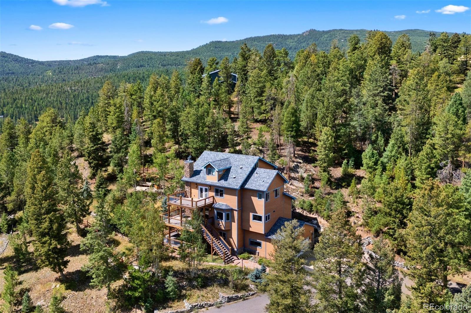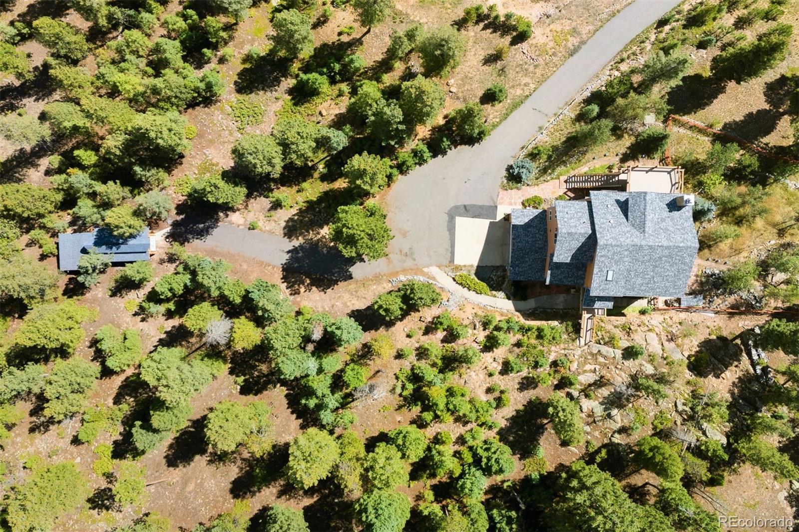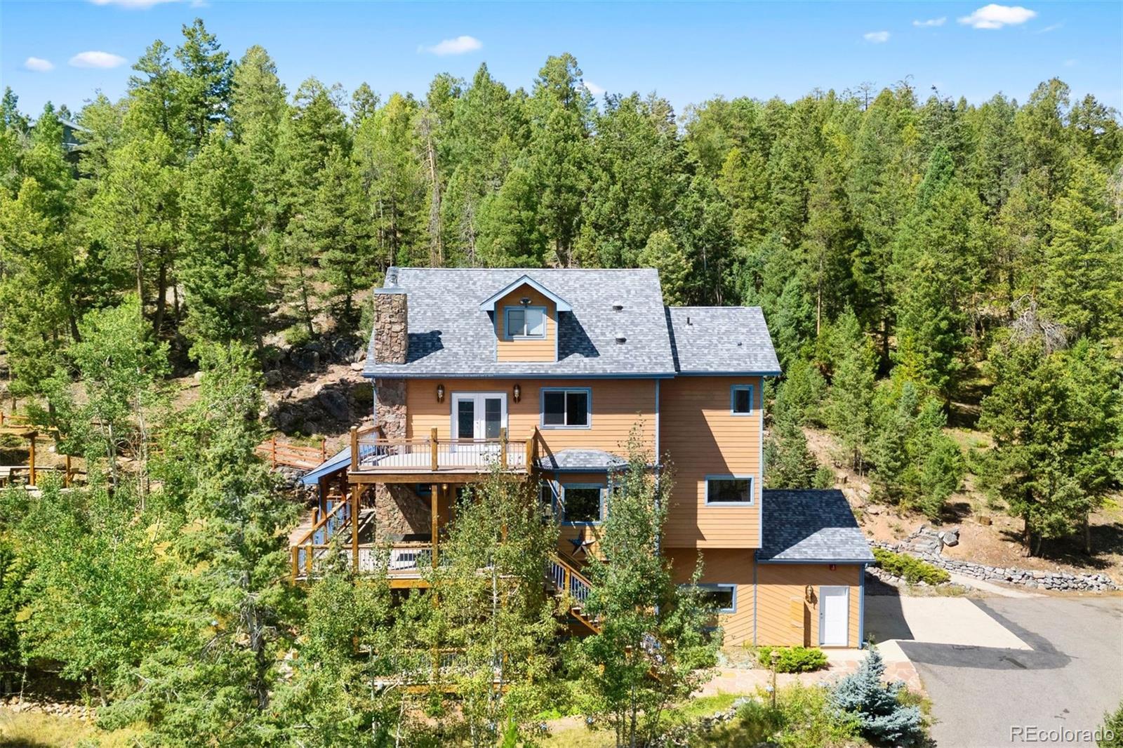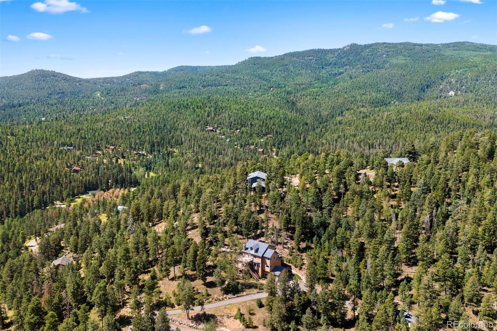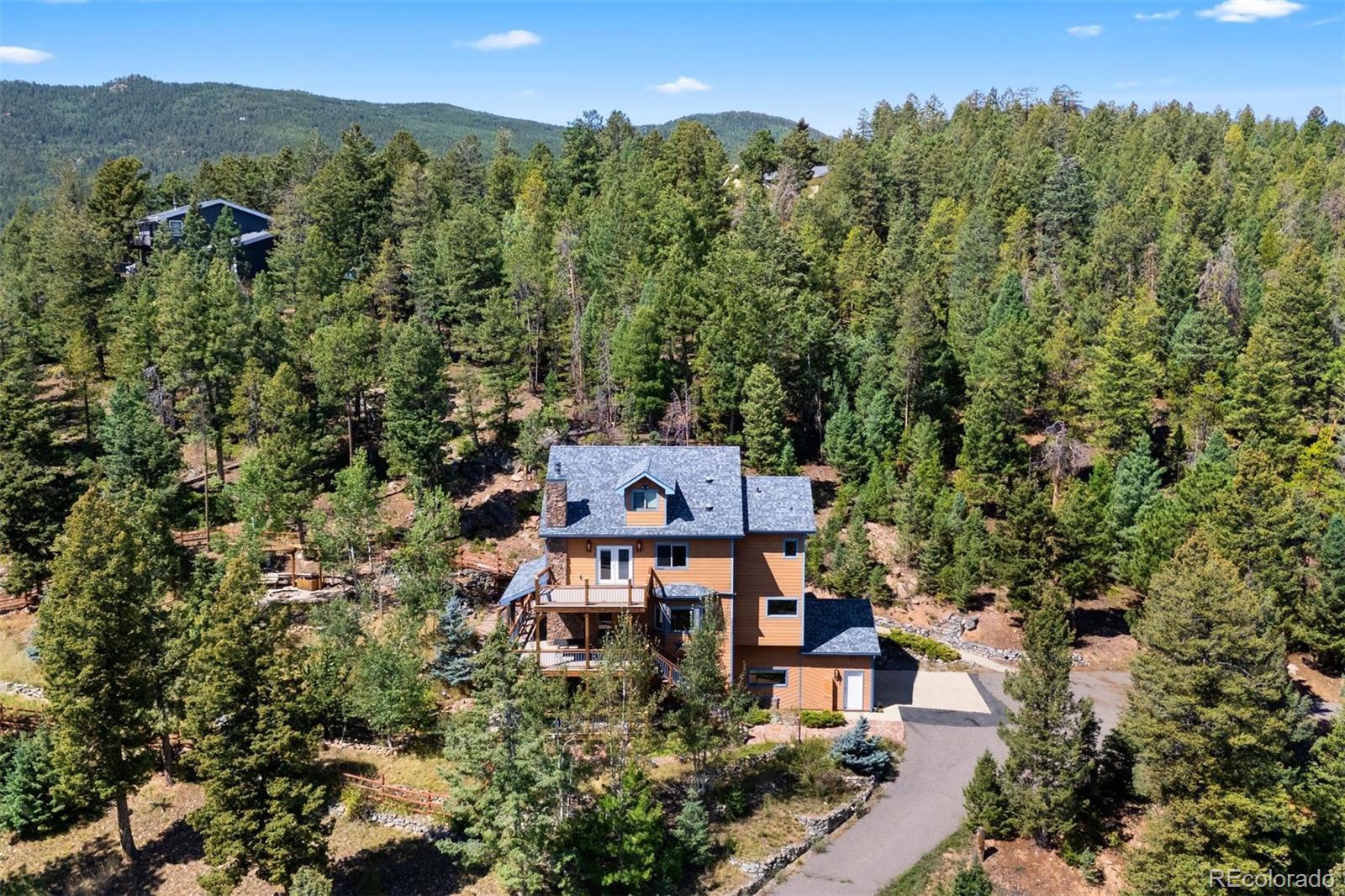 Nestled at the top of a quiet, private Conifer road, this property has the best of mountain living: beautiful views, a charming outdoor setting, a spacious three-bedroom home, and easy access to the amenities in Aspen Park or the Colorado mountains. Homeowners can enjoy true indoor-outdoor living, with outdoor spaces accessible from each level of this tri-level home. A hot tub and built-in fire pit provide additional settings to enjoy the beautiful surroundings. The paved driveway, attached two-car garage and additional workshop/studio create ample space for vehicles, RVs, ATVs or working on projects. Furry friends will have freedom to run in the large fenced dog run and gated deck areas. The indoor space is light and bright, with ample windows showcasing the beautiful views. During the winter, curl up by one of the cozy wood stoves in the two finished living areas of the home. The main floor features an open concept kitchen/dining room/living room, as well as a bedroom and full bath, plus a laundry room conveniently located adjacent to the kitchen. Two spacious and light-filled bedrooms are located on the upper level, along with a stunning newly-remodeled bathroom with a large walk-in shower/sauna. One bedroom walks out to a private deck and features a walk-in closet with built-ins. The lower level features a living room, a full bath, and a multi-purpose room that could be used as an office, workout room, sewing room. Storage abounds with a large attic/storage area with easy stair access from the upper level. Road maintenance is $420 annually and is a cooperative agreement among the residents of Blue Sky Trail.