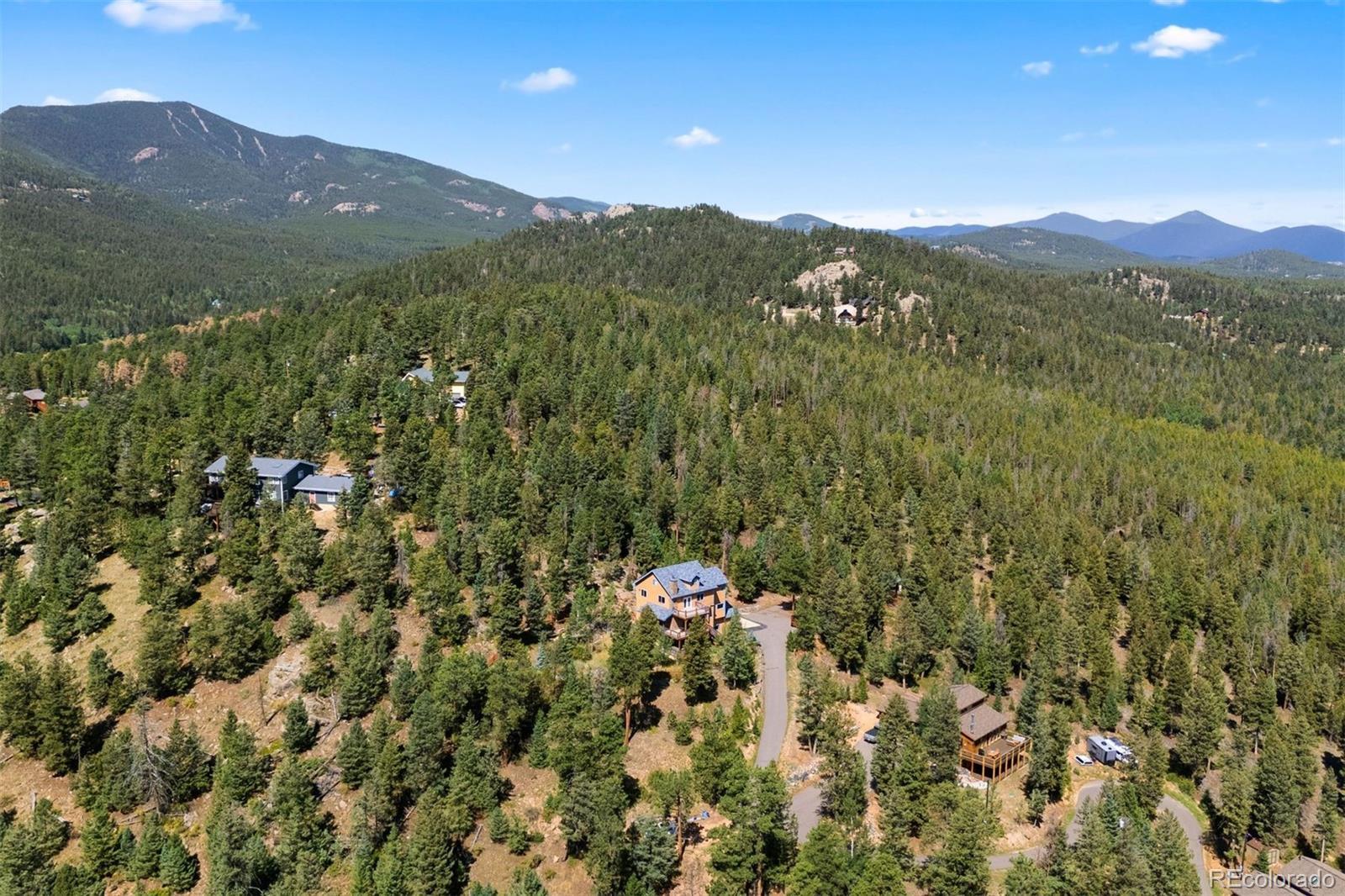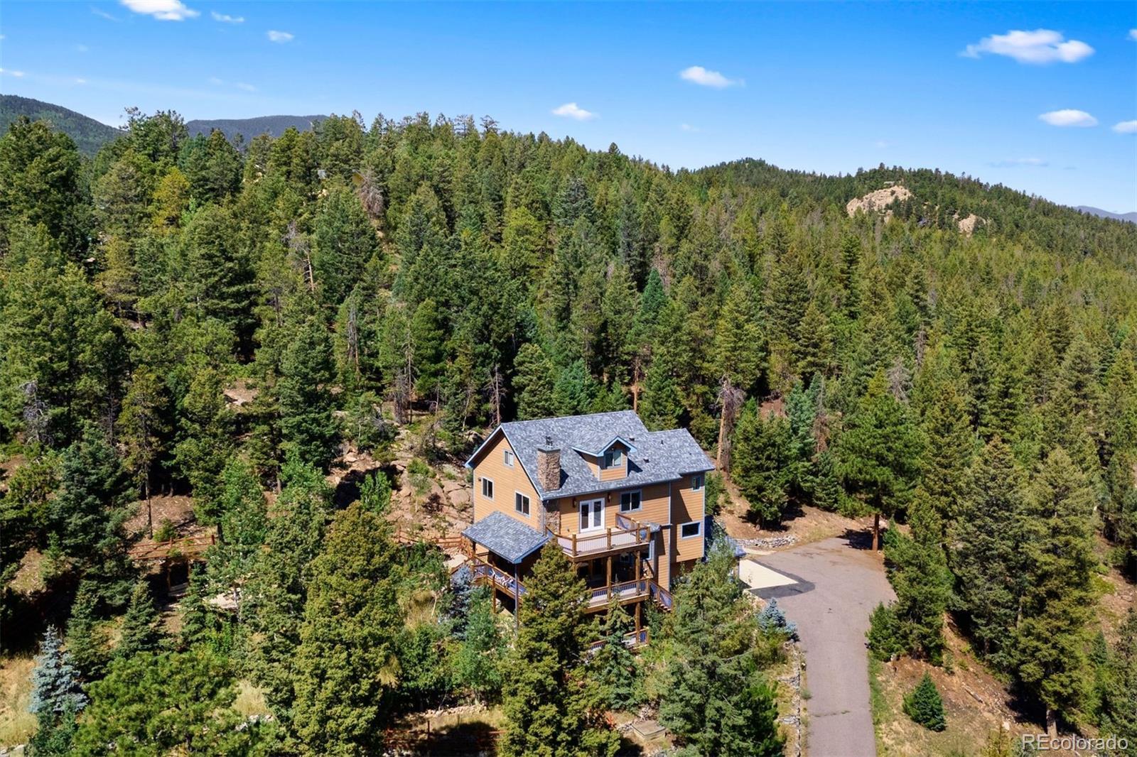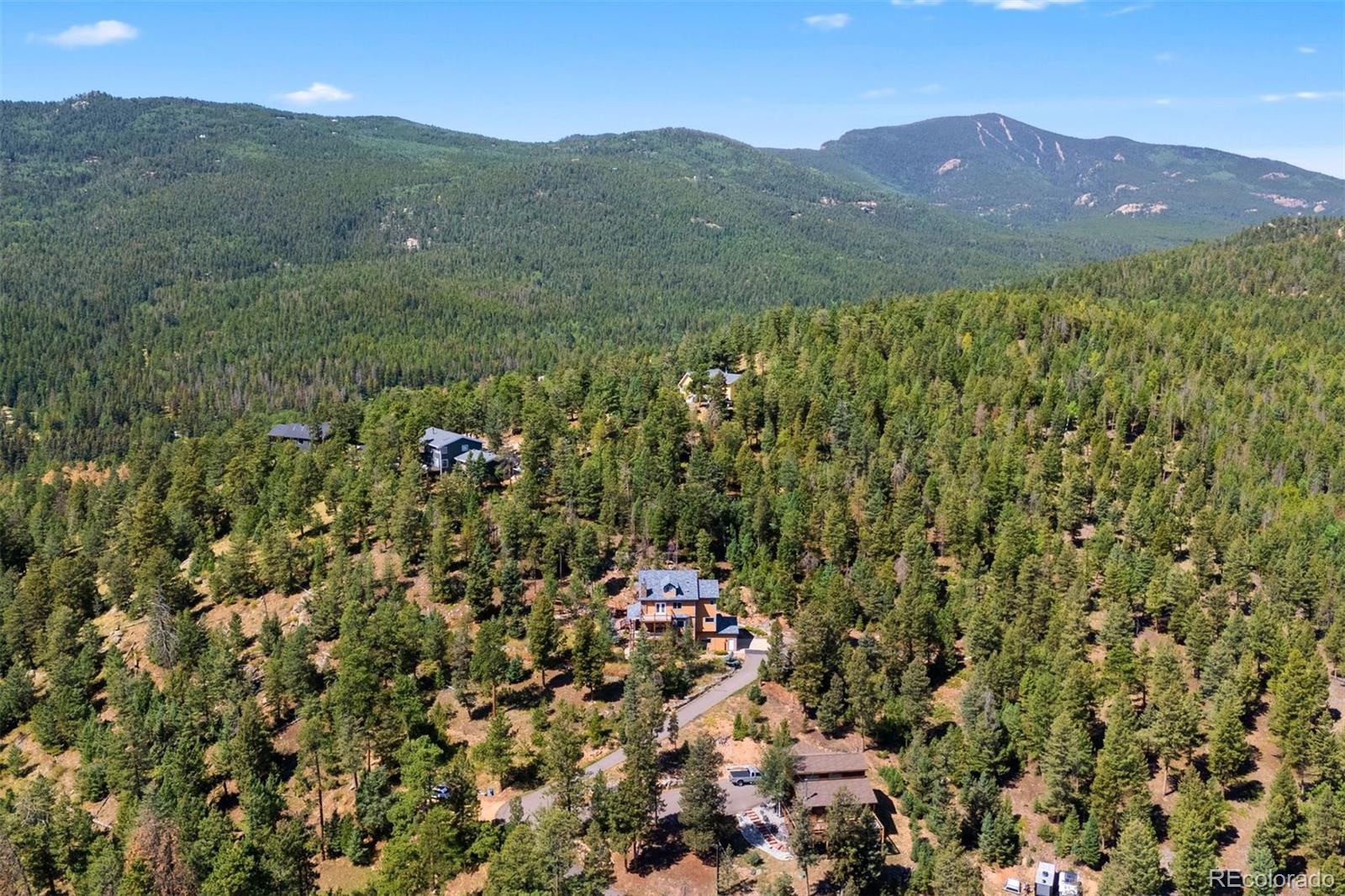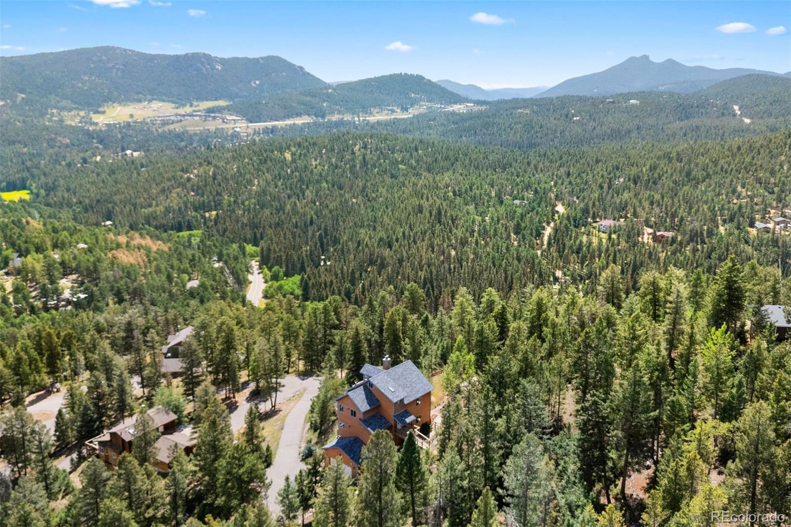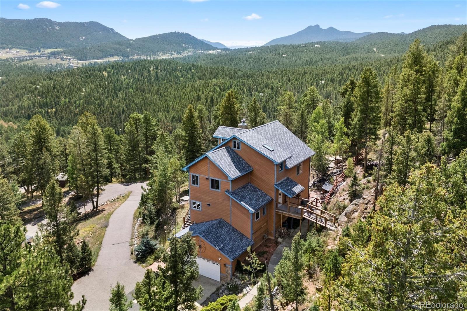 Nestled at the top of a quiet, private Conifer road, this property has the best of mountain living: beautiful views, a charming outdoor setting, a spacious three-bedroom home, and easy access to the amenities in Aspen Park or the Colorado mountains. Homeowners can enjoy true indoor-outdoor living, with outdoor spaces accessible from each level of this tri-level home. A hot tub and built-in fire pit provide additional settings to enjoy the beautiful surroundings. The paved driveway, attached two-car garage and additional workshop/studio create ample space for vehicles, RVs, ATVs or working on projects. Furry friends will have freedom to run in the large fenced dog run and gated deck areas. The indoor space is light and bright, with ample windows showcasing the beautiful views. During the winter, curl up by one of the cozy wood stoves in the two finished living areas of the home. The main floor features an open concept kitchen/dining room/living room, as well as a bedroom and full bath, plus a laundry room conveniently located adjacent to the kitchen. Two spacious and light-filled bedrooms are located on the upper level, along with a stunning newly-remodeled bathroom with a large walk-in shower/sauna. One bedroom walks out to a private deck and features a walk-in closet with built-ins. The lower level features a living room, a full bath, and a multi-purpose room that could be used as an office, workout room, sewing room. Storage abounds with a large attic/storage area with easy stair access from the upper level. Road maintenance is $420 annually and is a cooperative agreement among the residents of Blue Sky Trail.