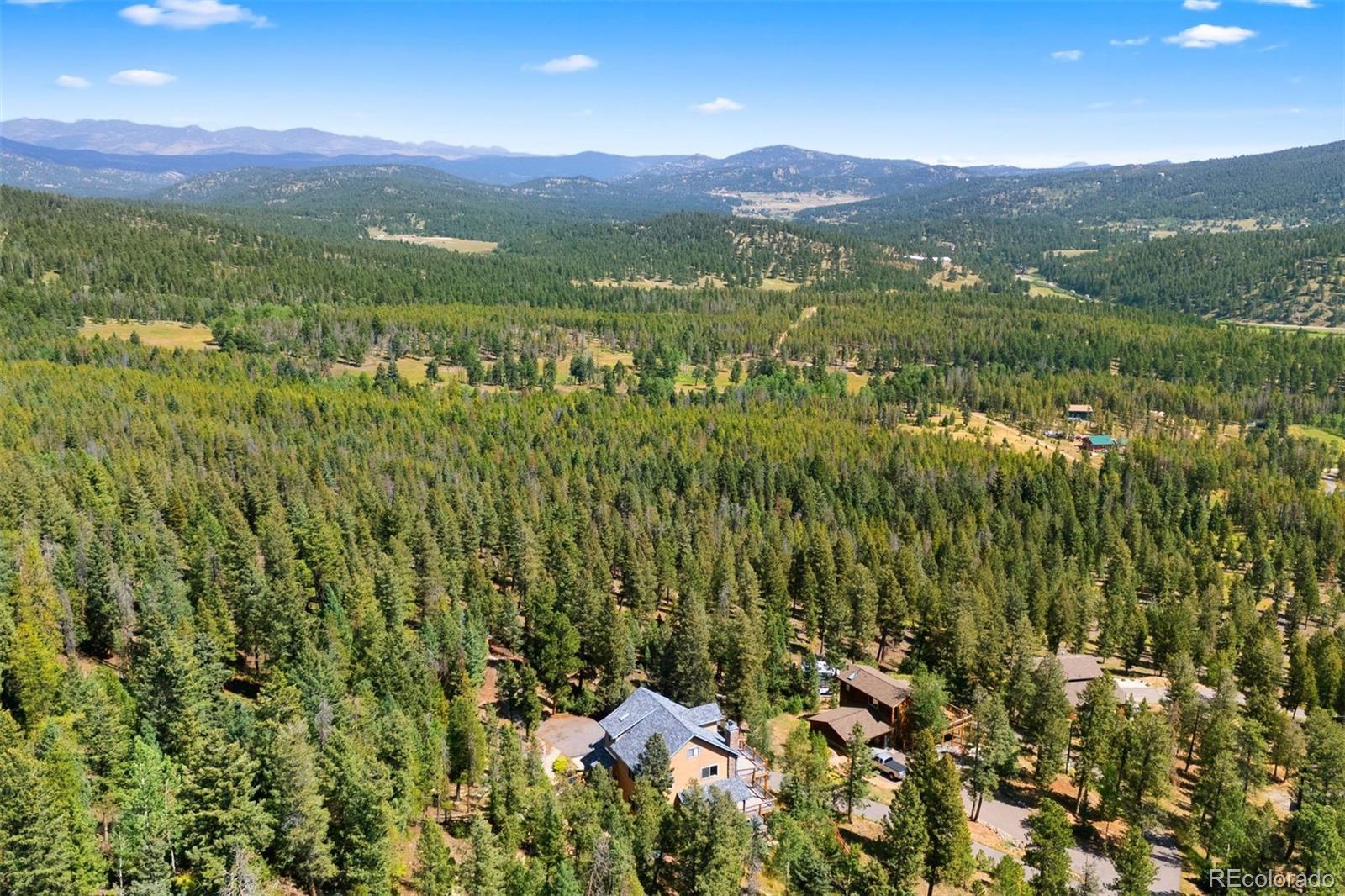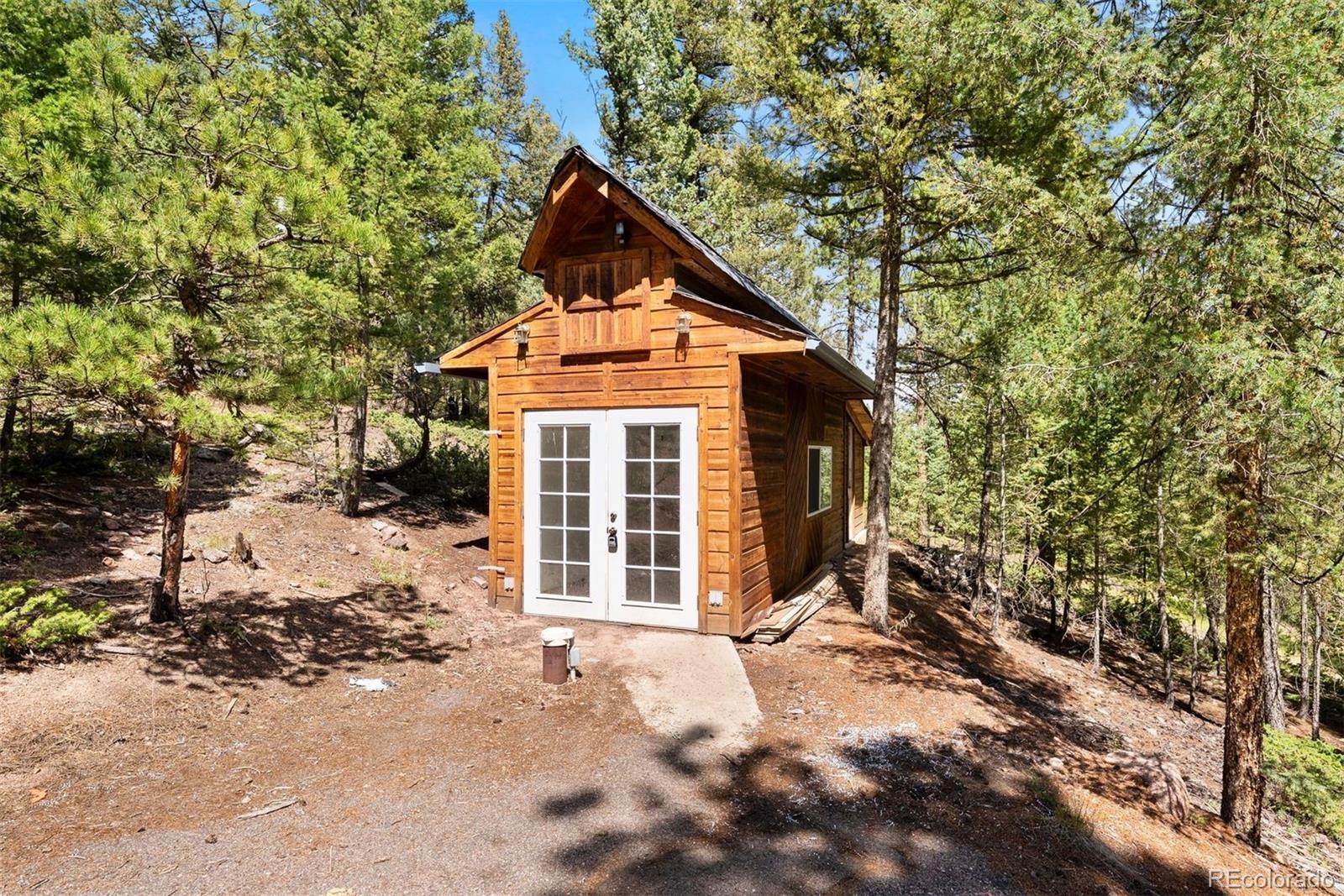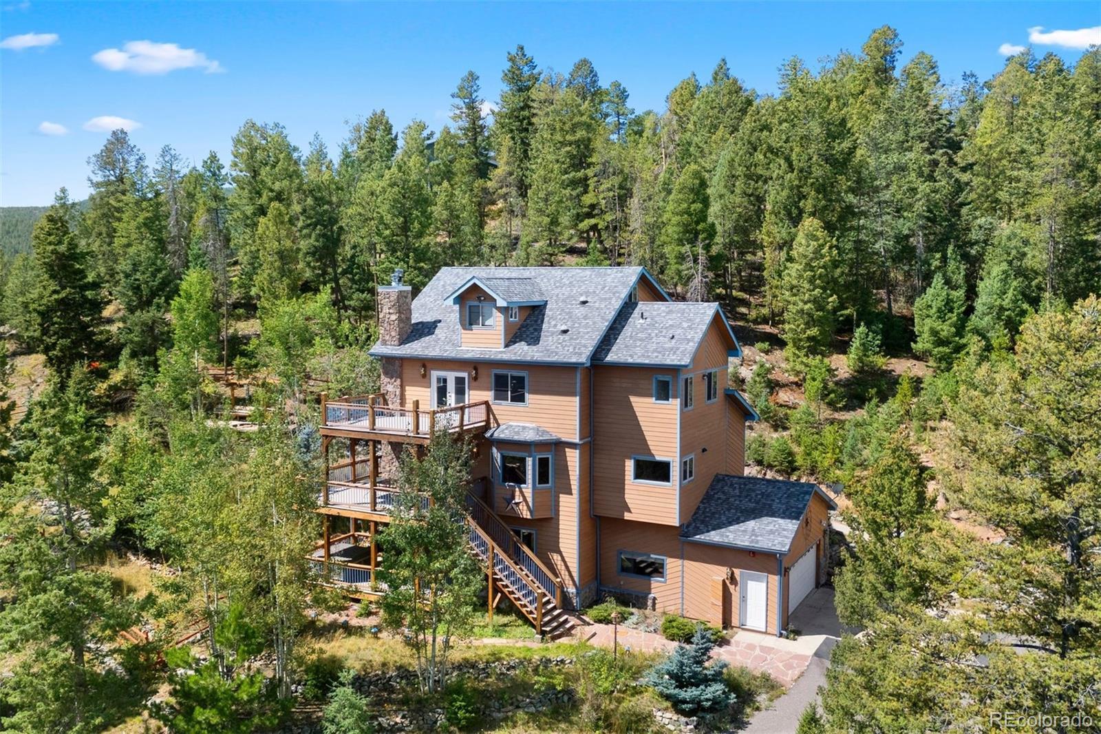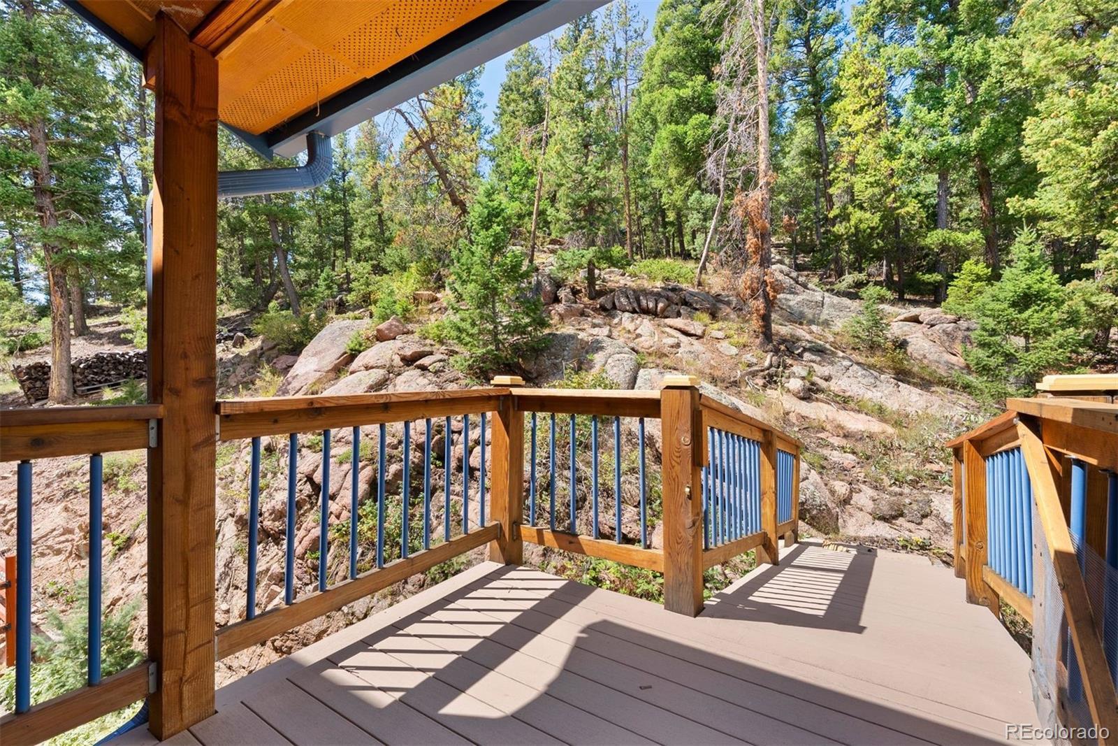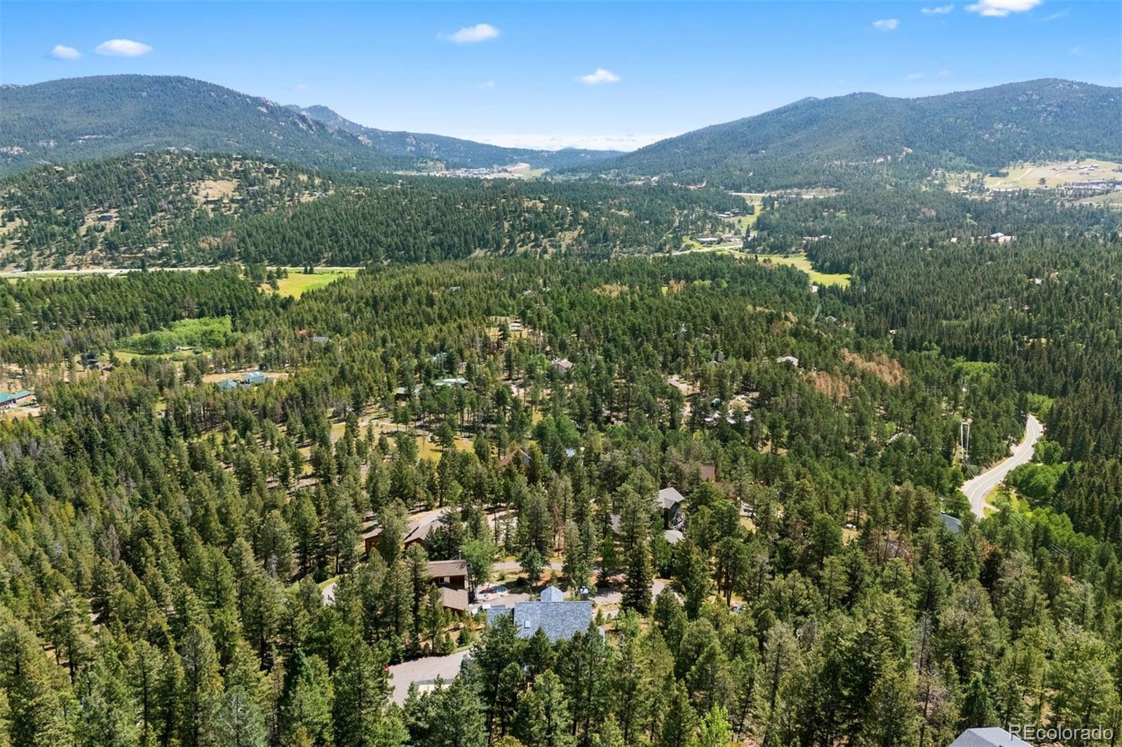Nestled at the top of a quiet, private Conifer road, this property has the best of mountain living: beautiful views, a charming outdoor setting, a spacious three-bedroom home, and easy access to the amenities in Aspen Park or the Colorado mountains. Homeowners can enjoy true indoor-outdoor living, with outdoor spaces accessible from each level of this tri-level home. A hot tub and built-in fire pit provide additional settings to enjoy the beautiful surroundings. The paved driveway, attached two-car garage and additional workshop/studio create ample space for vehicles, RVs, ATVs or working on projects. Furry friends will have freedom to run in the large fenced dog run and gated deck areas. The indoor space is light and bright, with ample windows showcasing the beautiful views. During the winter, curl up by one of the cozy wood stoves in the two finished living areas of the home. The main floor features an open concept kitchen/dining room/living room, as well as a bedroom and full bath, plus a laundry room conveniently located adjacent to the kitchen. Two spacious and light-filled bedrooms are located on the upper level, along with a stunning newly-remodeled bathroom with a large walk-in shower/sauna. One bedroom walks out to a private deck and features a walk-in closet with built-ins. The lower level features a living room, a full bath, and a multi-purpose room that could be used as an office, workout room, sewing room. Storage abounds with a large attic/storage area with easy stair access from the upper level. Road maintenance is $420 annually and is a cooperative agreement among the residents of Blue Sky Trail.