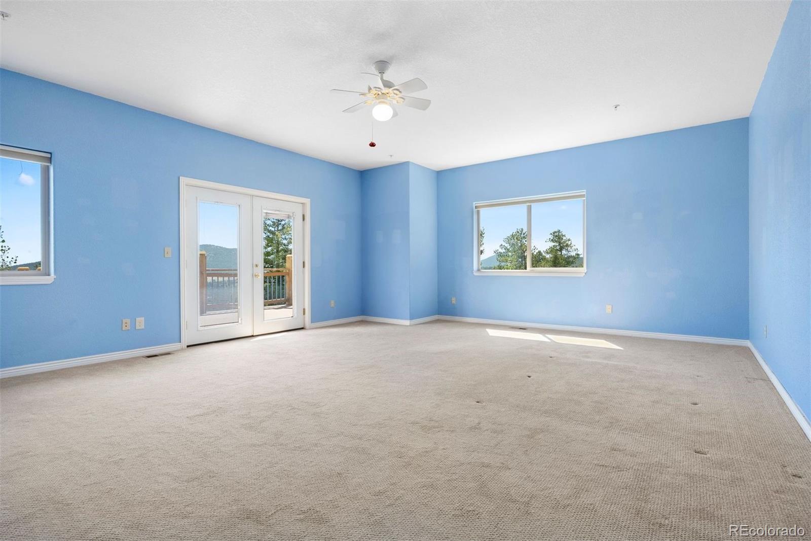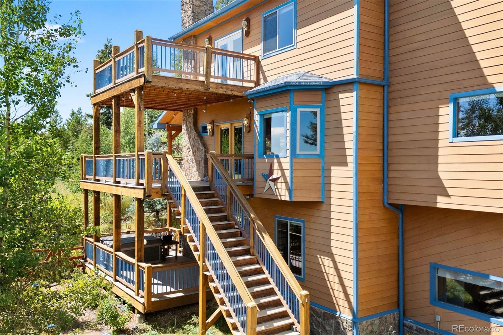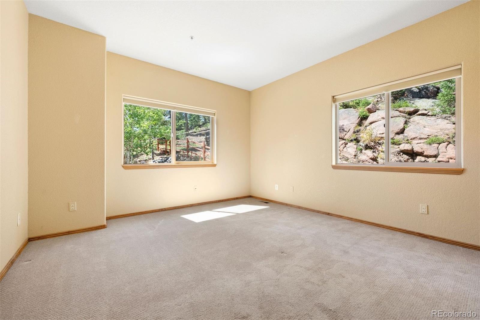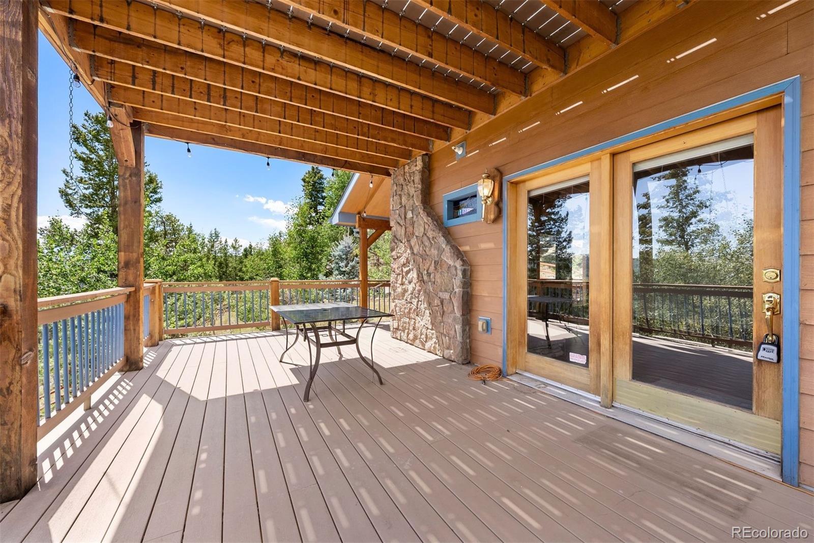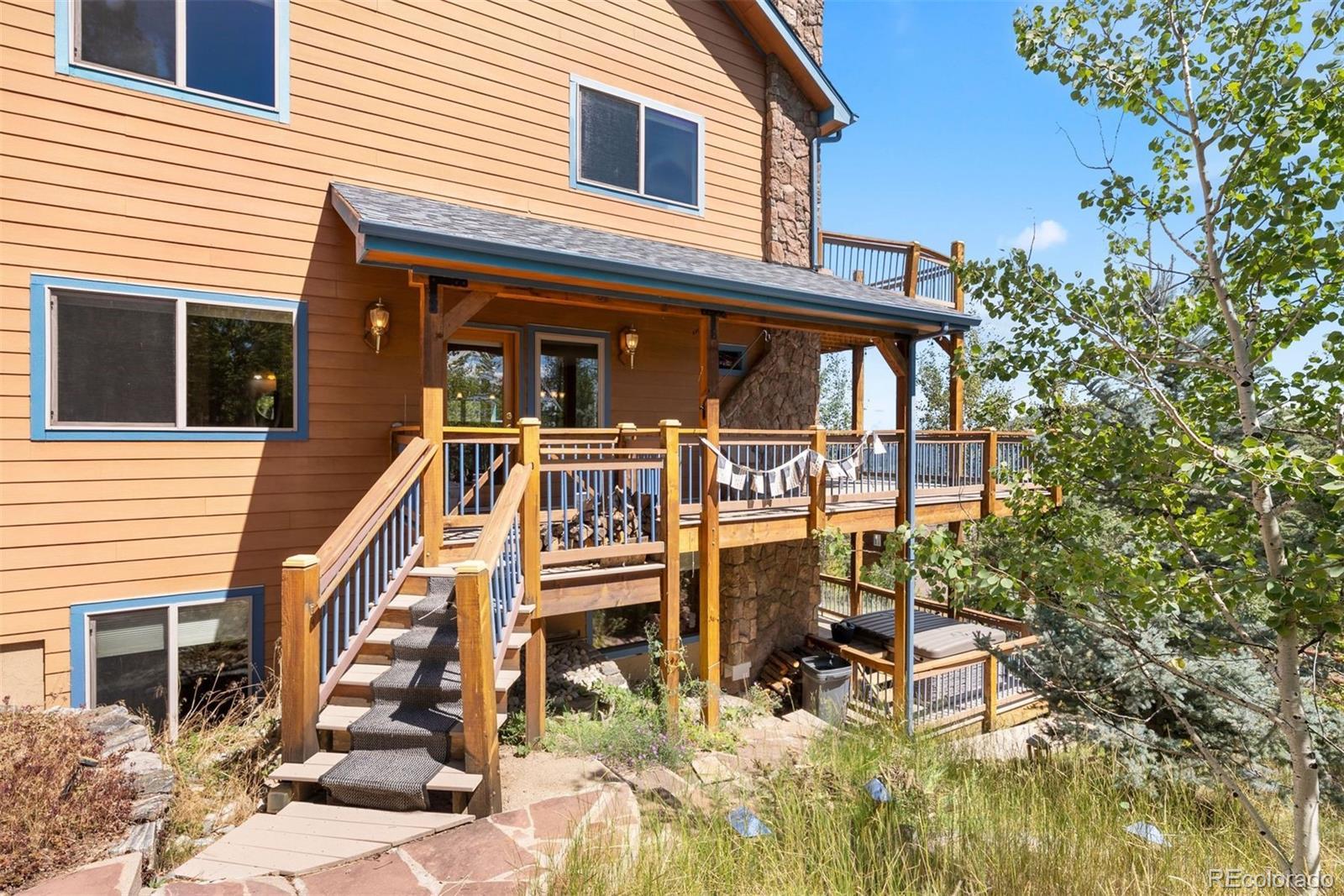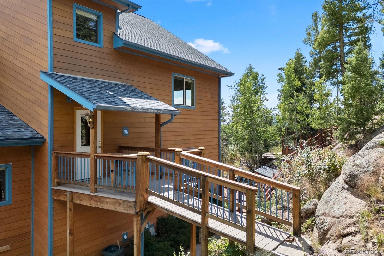 Nestled at the top of a quiet, private Conifer road, this property has the best of mountain living: beautiful views, a charming outdoor setting, a spacious three-bedroom home, and easy access to the amenities in Aspen Park or the Colorado mountains. Homeowners can enjoy true indoor-outdoor living, with outdoor spaces accessible from each level of this tri-level home. A hot tub and built-in fire pit provide additional settings to enjoy the beautiful surroundings. The paved driveway, attached two-car garage and additional workshop/studio create ample space for vehicles, RVs, ATVs or working on projects. Furry friends will have freedom to run in the large fenced dog run and gated deck areas. The indoor space is light and bright, with ample windows showcasing the beautiful views. During the winter, curl up by one of the cozy wood stoves in the two finished living areas of the home. The main floor features an open concept kitchen/dining room/living room, as well as a bedroom and full bath, plus a laundry room conveniently located adjacent to the kitchen. Two spacious and light-filled bedrooms are located on the upper level, along with a stunning newly-remodeled bathroom with a large walk-in shower/sauna. One bedroom walks out to a private deck and features a walk-in closet with built-ins. The lower level features a living room, a full bath, and a multi-purpose room that could be used as an office, workout room, sewing room. Storage abounds with a large attic/storage area with easy stair access from the upper level. Road maintenance is $420 annually and is a cooperative agreement among the residents of Blue Sky Trail.