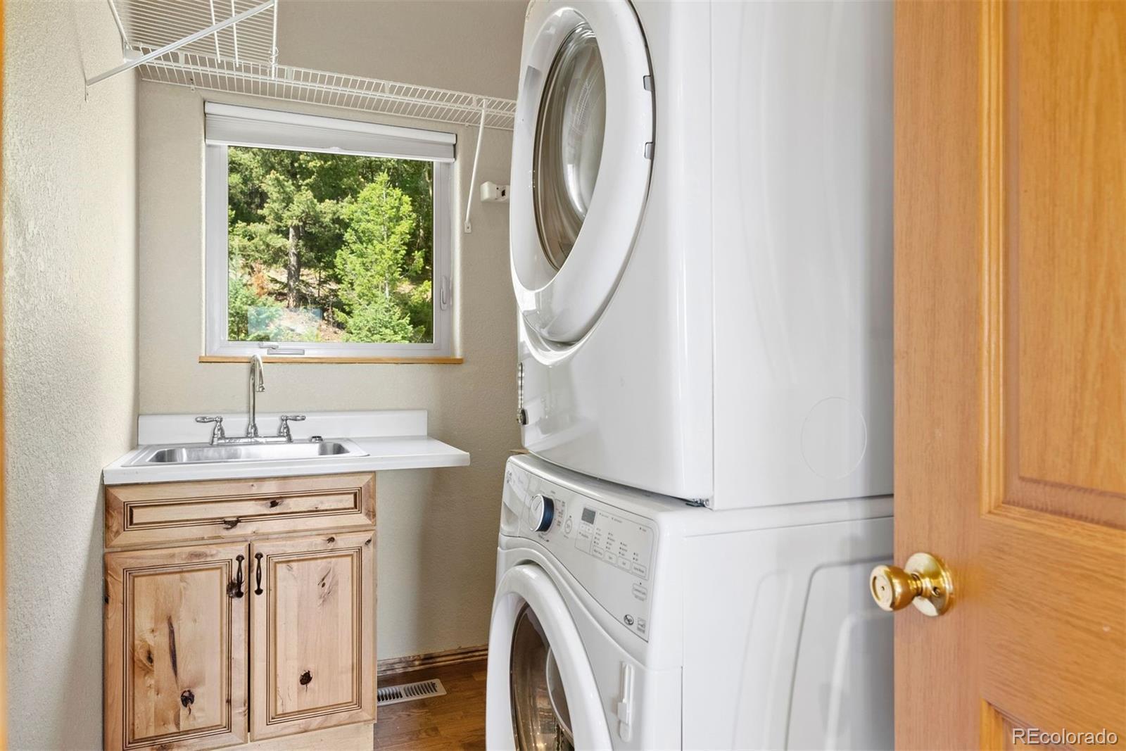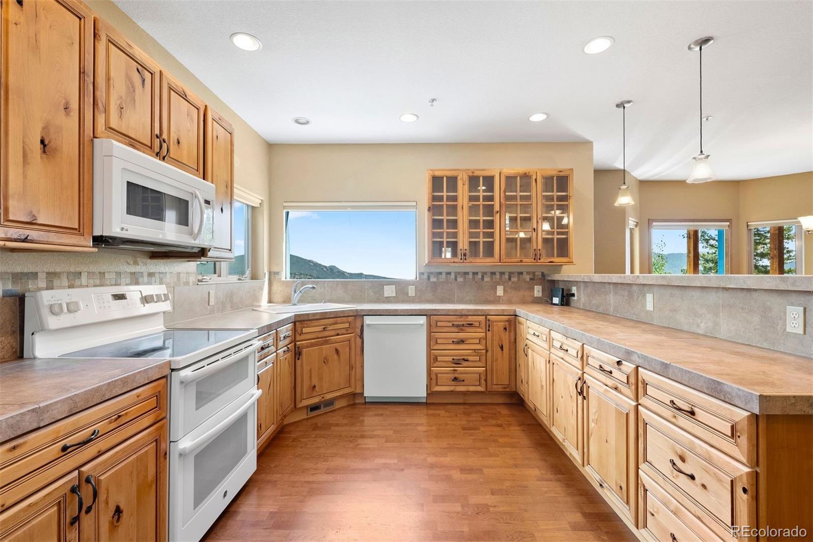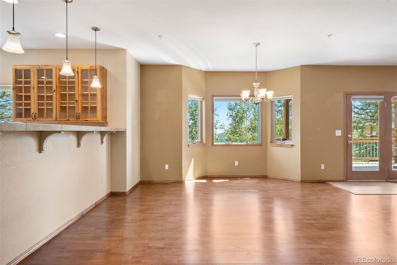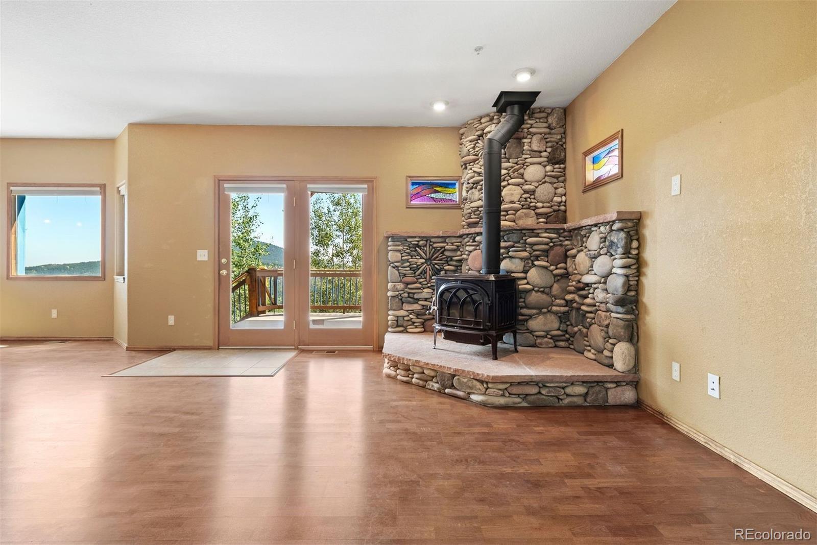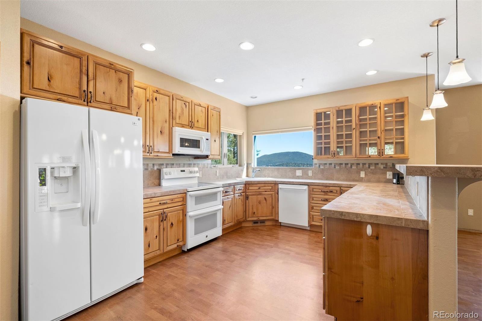 Nestled at the top of a quiet, private Conifer road, this property has the best of mountain living: beautiful views, a charming outdoor setting, a spacious three-bedroom home, and easy access to the amenities in Aspen Park or the Colorado mountains. Homeowners can enjoy true indoor-outdoor living, with outdoor spaces accessible from each level of this tri-level home. A hot tub and built-in fire pit provide additional settings to enjoy the beautiful surroundings. The paved driveway, attached two-car garage and additional workshop/studio create ample space for vehicles, RVs, ATVs or working on projects. Furry friends will have freedom to run in the large fenced dog run and gated deck areas. The indoor space is light and bright, with ample windows showcasing the beautiful views. During the winter, curl up by one of the cozy wood stoves in the two finished living areas of the home. The main floor features an open concept kitchen/dining room/living room, as well as a bedroom and full bath, plus a laundry room conveniently located adjacent to the kitchen. Two spacious and light-filled bedrooms are located on the upper level, along with a stunning newly-remodeled bathroom with a large walk-in shower/sauna. One bedroom walks out to a private deck and features a walk-in closet with built-ins. The lower level features a living room, a full bath, and a multi-purpose room that could be used as an office, workout room, sewing room. Storage abounds with a large attic/storage area with easy stair access from the upper level. Road maintenance is $420 annually and is a cooperative agreement among the residents of Blue Sky Trail.